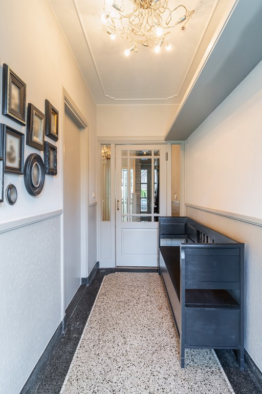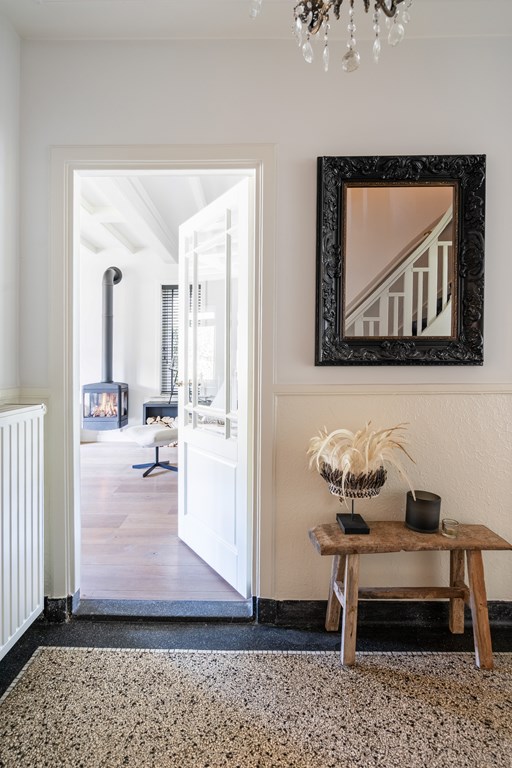 You enter the house through the entrance and hallway, both featuring authentic terrazzo floors. From here, you access the toilet, staircase, and the spacious living room. Large windows allow plenty of natural light to flow in. The stylish gas fireplace is a true eye-catcher and adds a luxurious, cozy atmosphere.