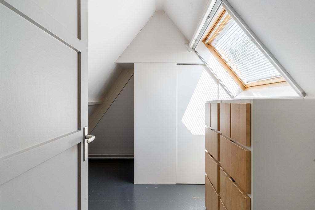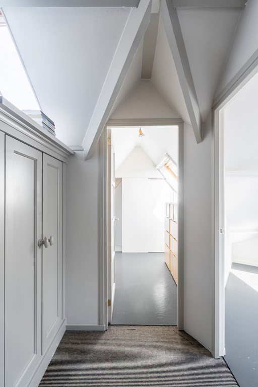 The second floor also offers three bedrooms, each with skylights or dormer windows, allowing ample daylight to enter. The available space has been efficiently used with clever storage solutions and a practical layout.