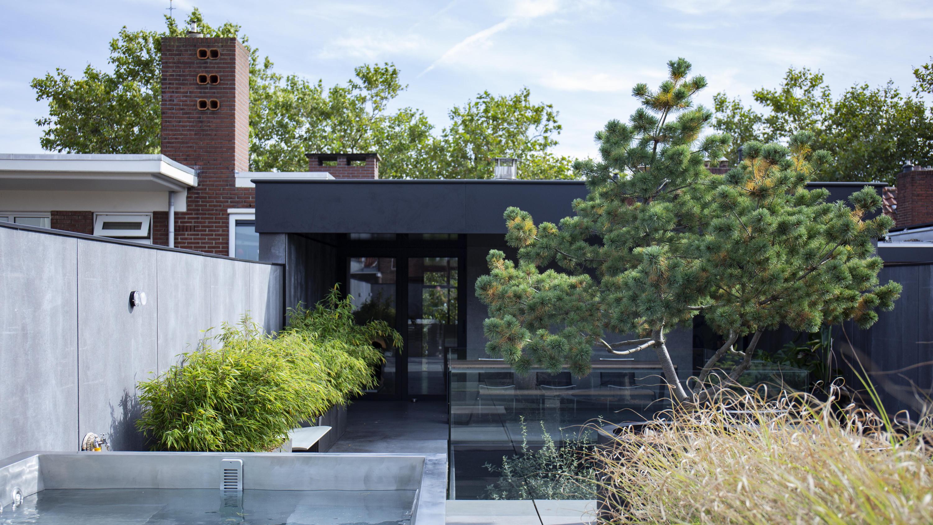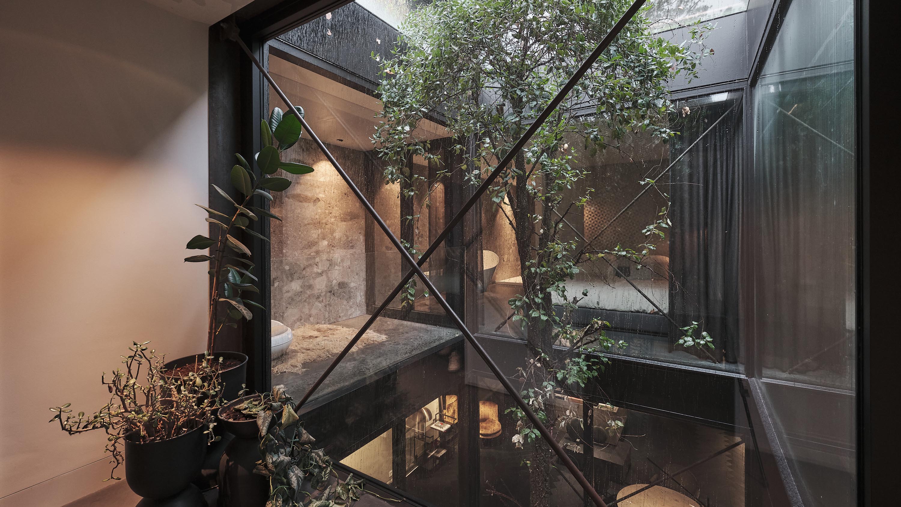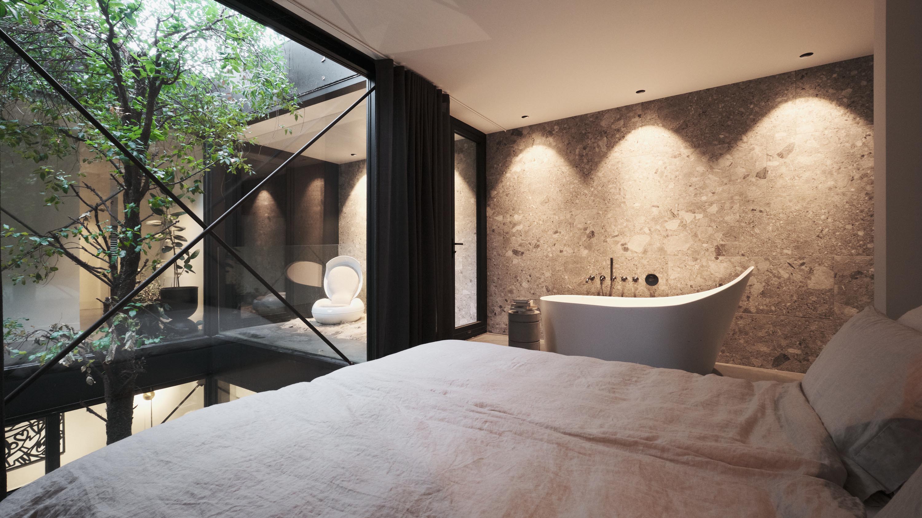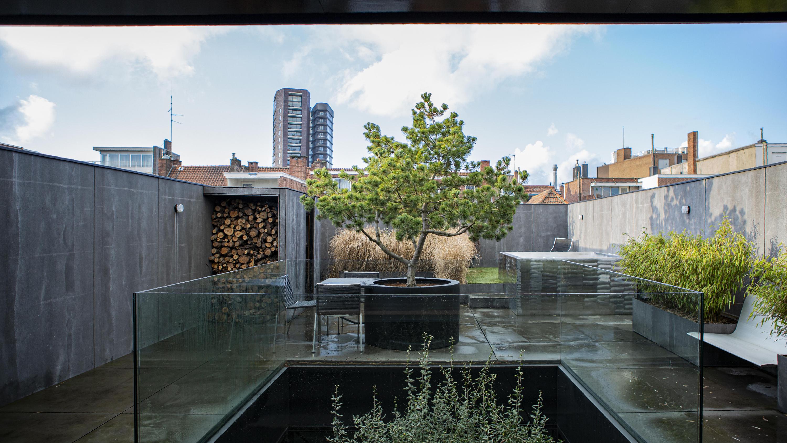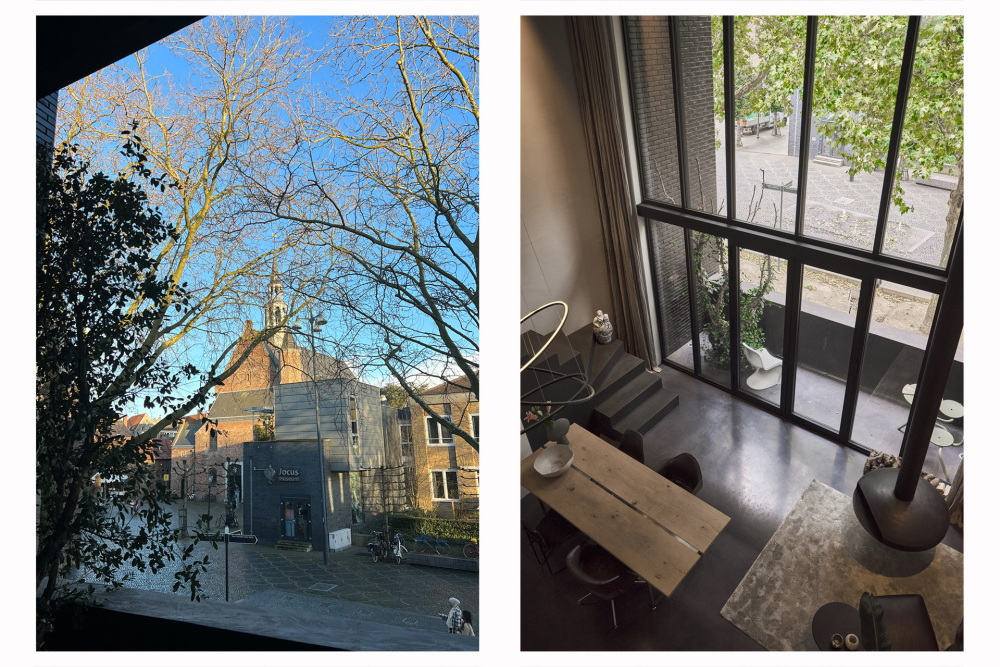 The residence at Cedron forms a serene oasis featuring high-quality materials and an iconic vertical glass shaft with a Tuscan cork oak as a living sculpture. The presentation space on Nieuwstraat, by contrast, is a restrained and thoughtfully designed workspace where clarity, focus, and creativity take centre stage.