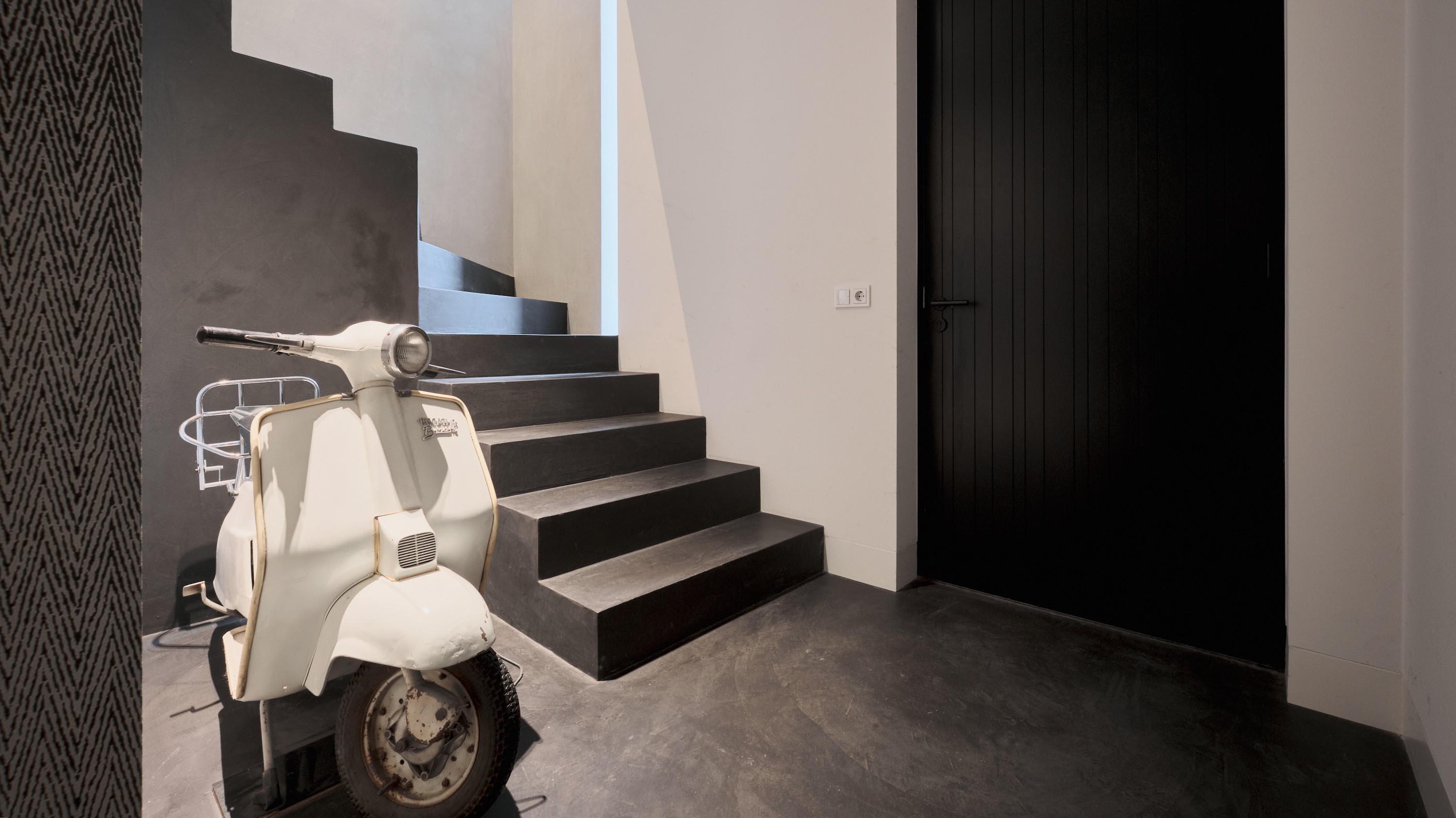 The entrance is located on the ground floor. Here you will find a spacious hall with wardrobe area and a garage suitable for a small car or bicycle storage. From the hall, a staircase leads to the first floor, where the apartment begins (a second door provides access to the presentation and commercial space at Nieuwstraat 48).