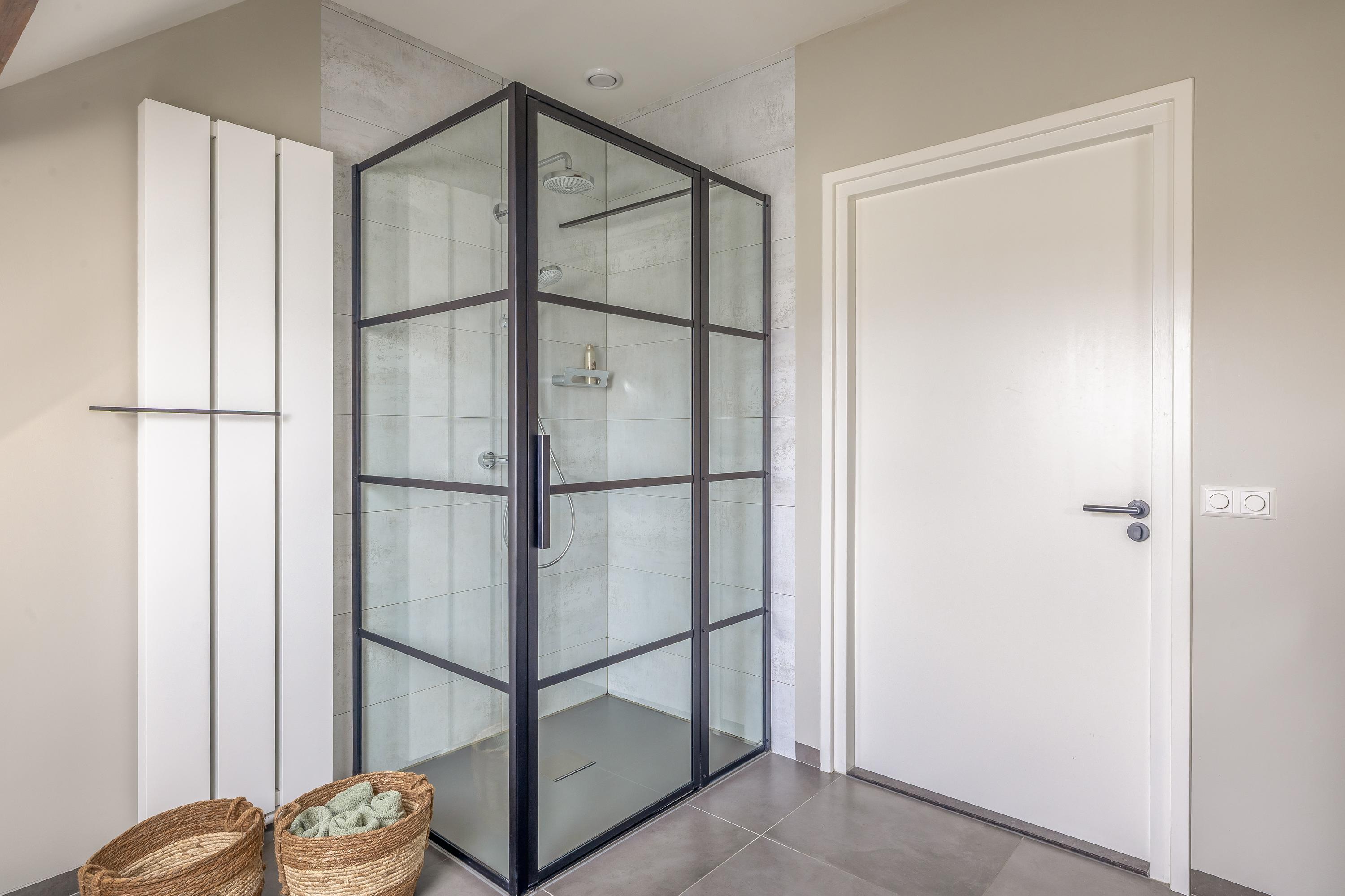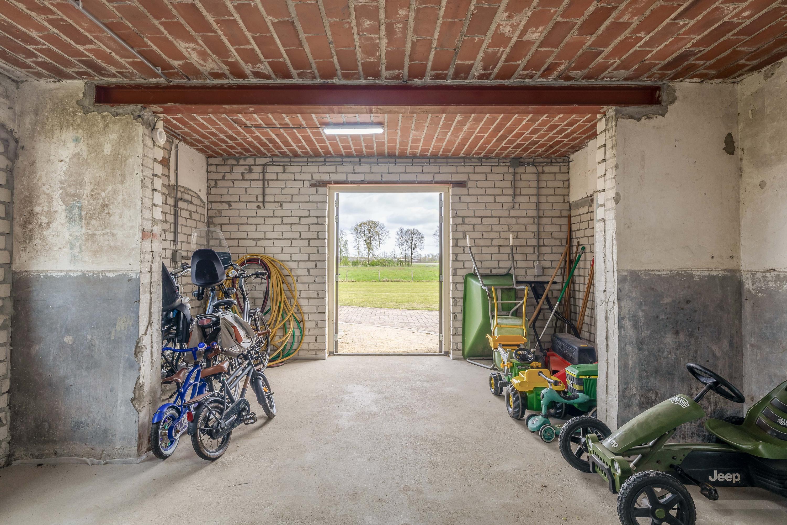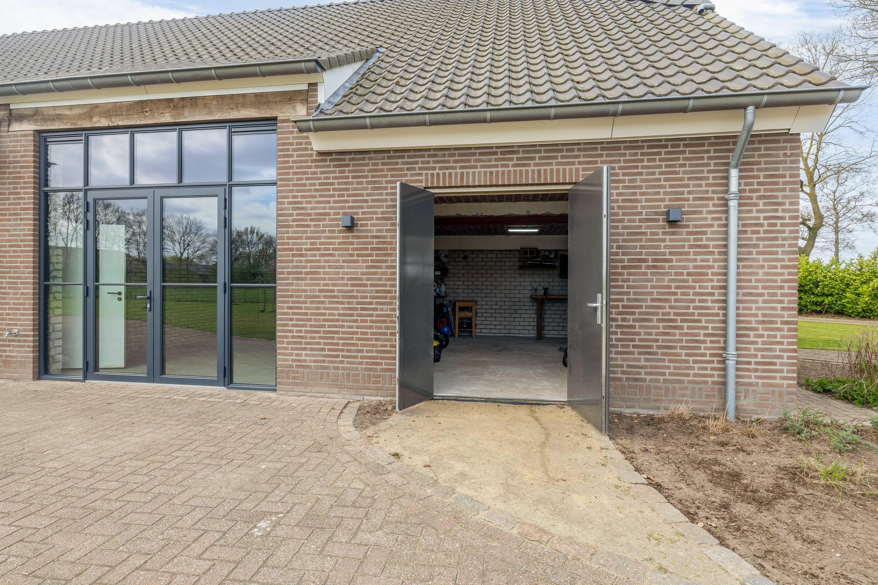 Adjacent to this is the indoor rear annex which, alongside the indoor garage, offers a considerable amount of additional usable space. This forms a solid foundation and was designed with versatility in mind. The rear annex is therefore ideally suited to a variety of uses, such as independent living accommodation (informal care), an office or practice space with meeting facilities, or a comfortable guest house. The space features a refurbished concrete floor with underfloor heating, brick walls and exposed wooden beams that enhance the rustic atmosphere. Part of the space has a mezzanine, and there is plenty of natural light. French doors in the rear façade provide a direct connection to the garden. There is also a separate toilet with a wall-hung toilet and washbasin. The rear annex also provides access to the built-in garage. The garage is accessible from the courtyard via a wide entrance door.