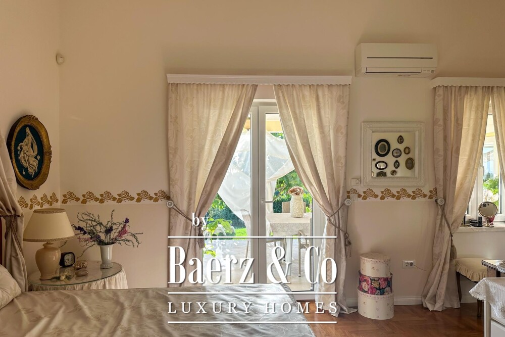 The 826 m² plot reveals Mediterranean continuity: olive trees, flower gardens, and a pond with fountain define the outdoor rhythm. A covered terrace looks out to vineyards, olive groves, and the sea, the plot positioned at the edge of the construction zone to ensure enduring, unobstructed panoramas. The garden is organized with automatic irrigation, bordered by mature lawns and hedges. Accompanying amenities include a separate 12.5 m² summer kitchen with storage and two garden sheds for tools and winter firewood.