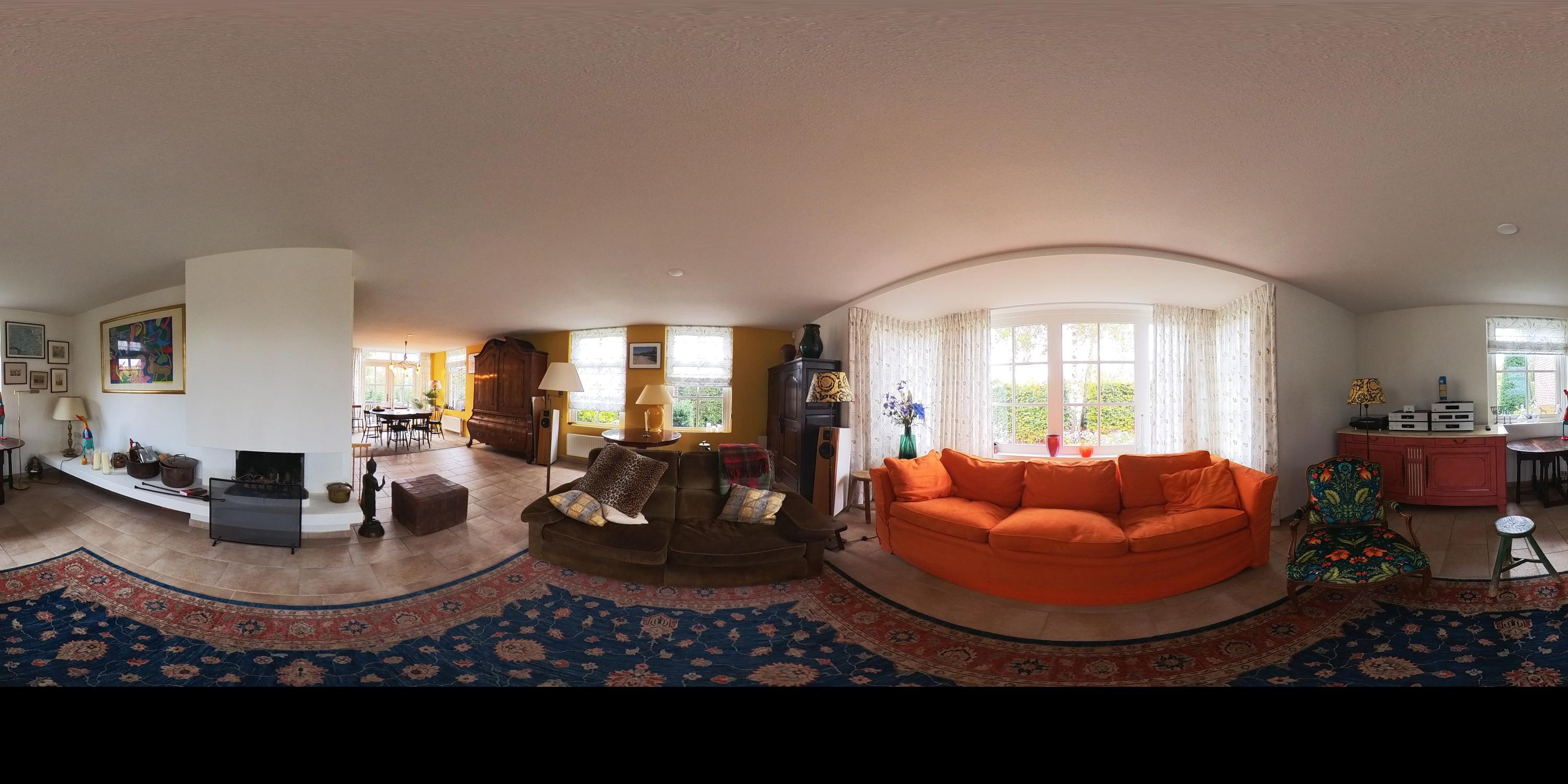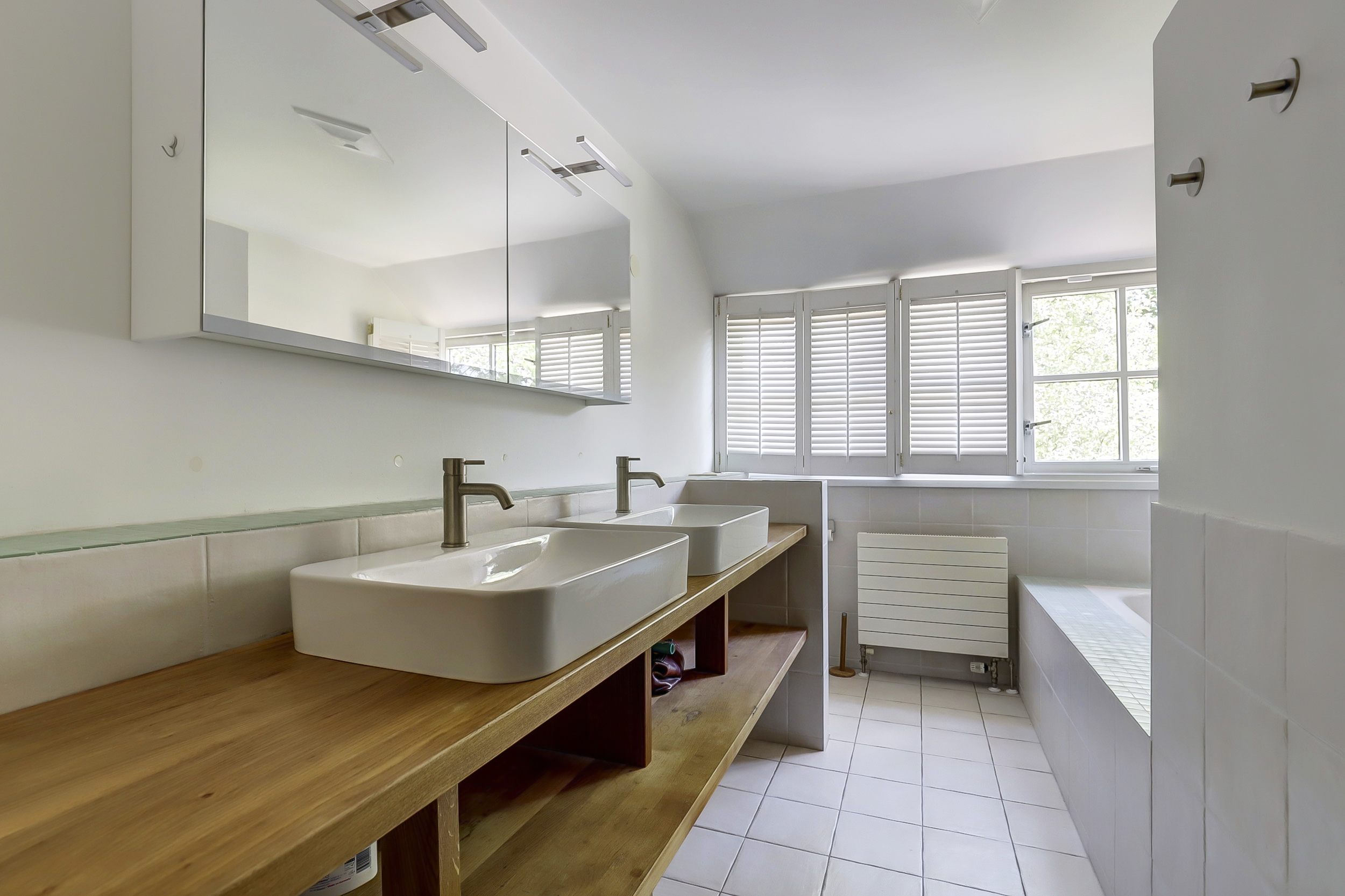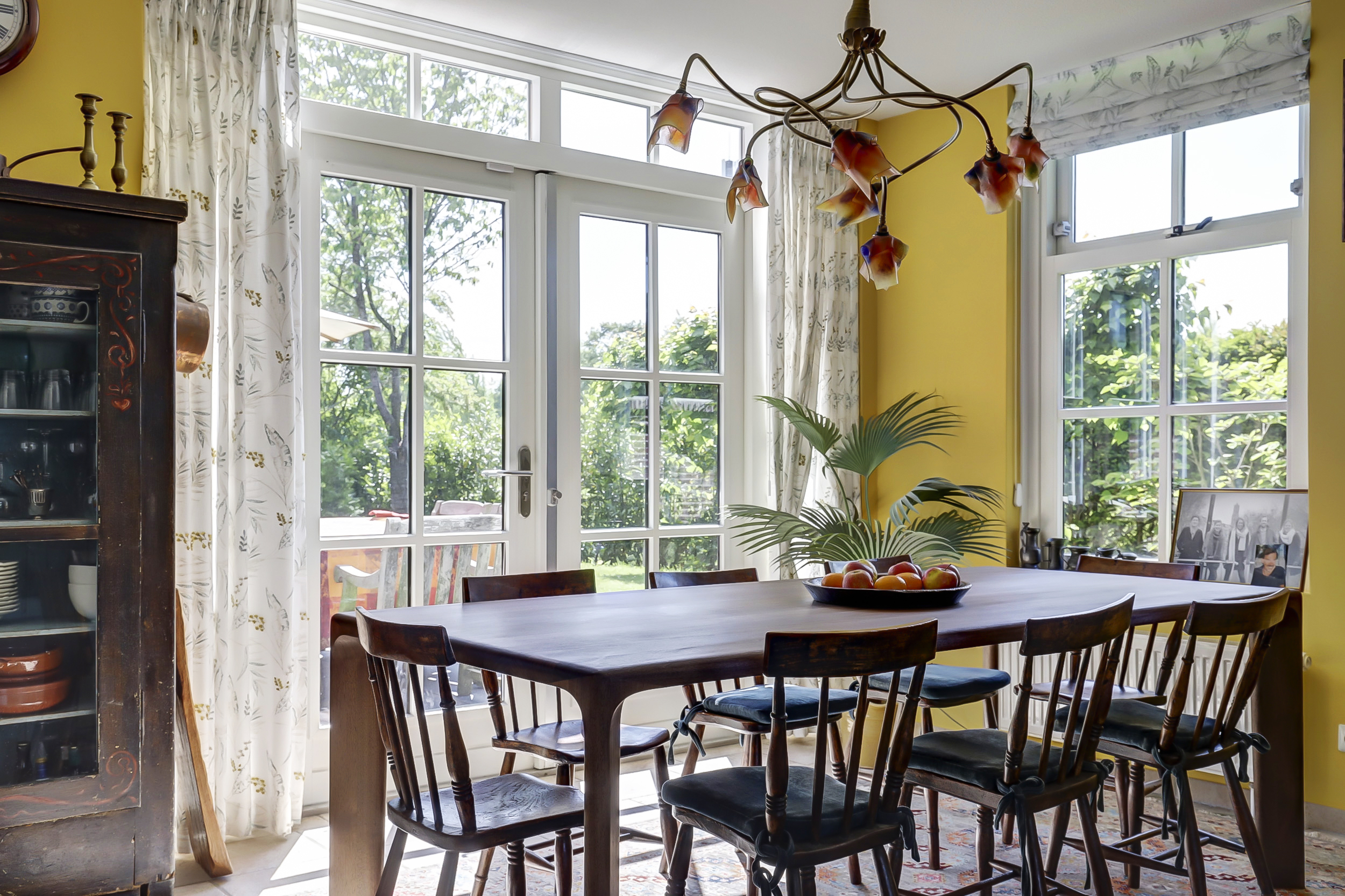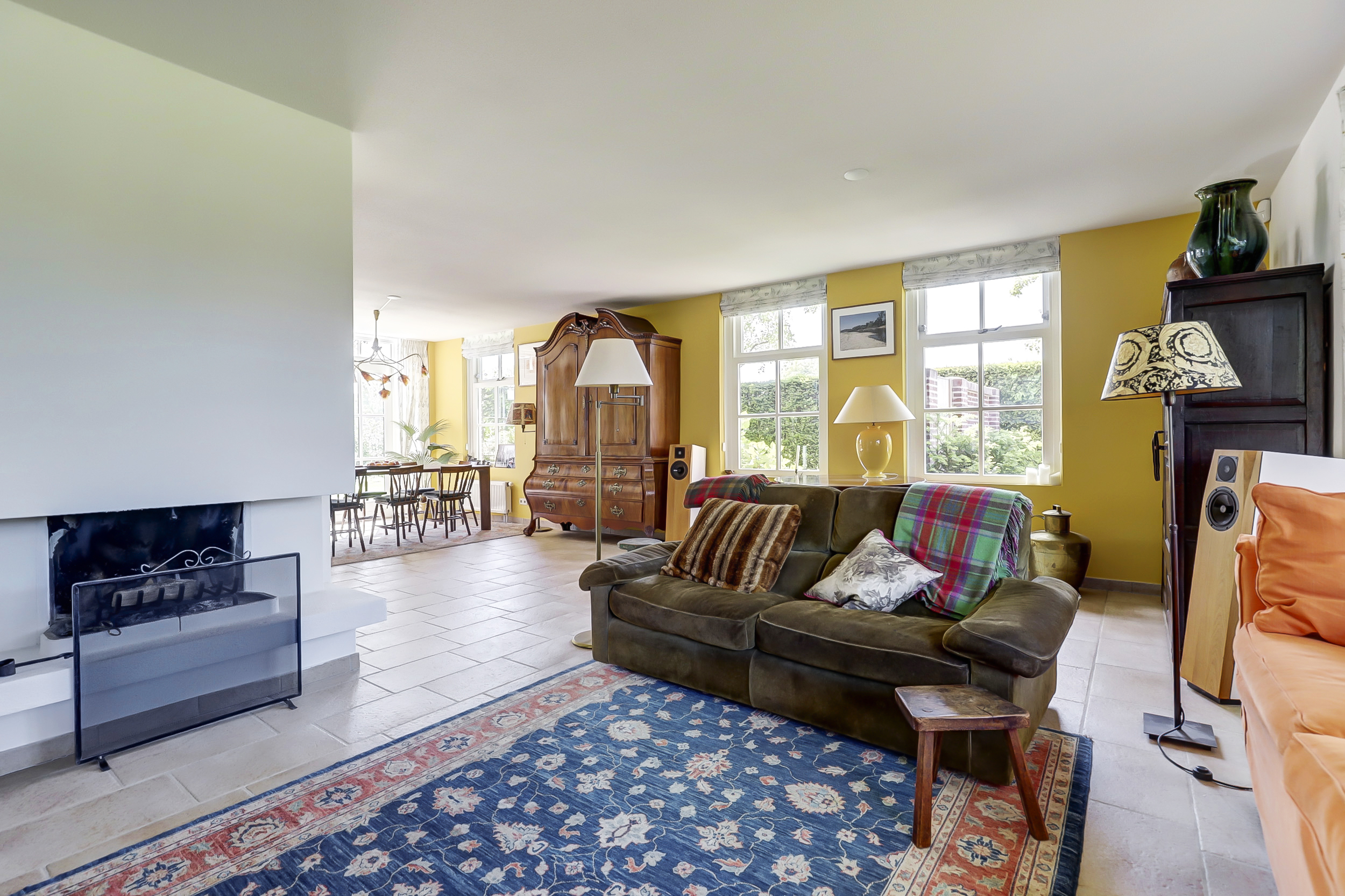 The house features a spacious, bright living room with a bay window and an atmospheric open fireplace. Large windows and French doors to the garden provide plenty of natural light. The living room connects to the spacious kitchen-diner, large enough for a generous dining table. Here too, French doors open onto the sunny terrace with veranda.