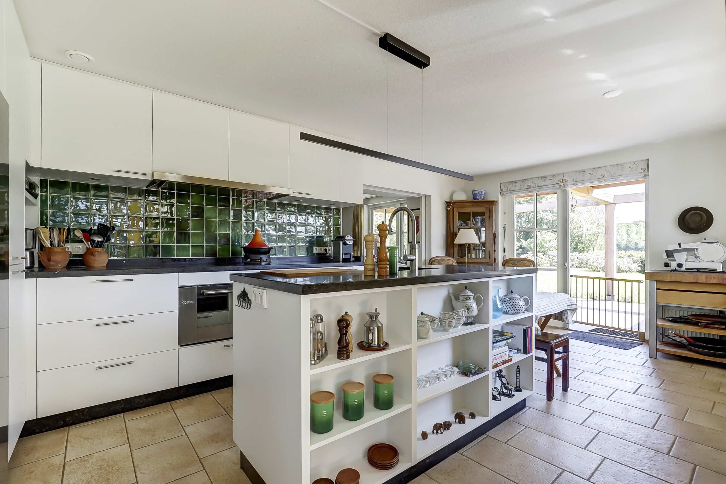 The kitchen, installed in 2023, is in pristine condition. It features matte white fronts and a robust natural stone worktop. It is equipped with every convenience, including a 4-in-1 boiling-water tap (Quooker), wine climate cabinet, fridge-freezer, dishwasher, combination microwave, and an extra-wide induction hob plus a gas wok burner and 90 cm convection oven.