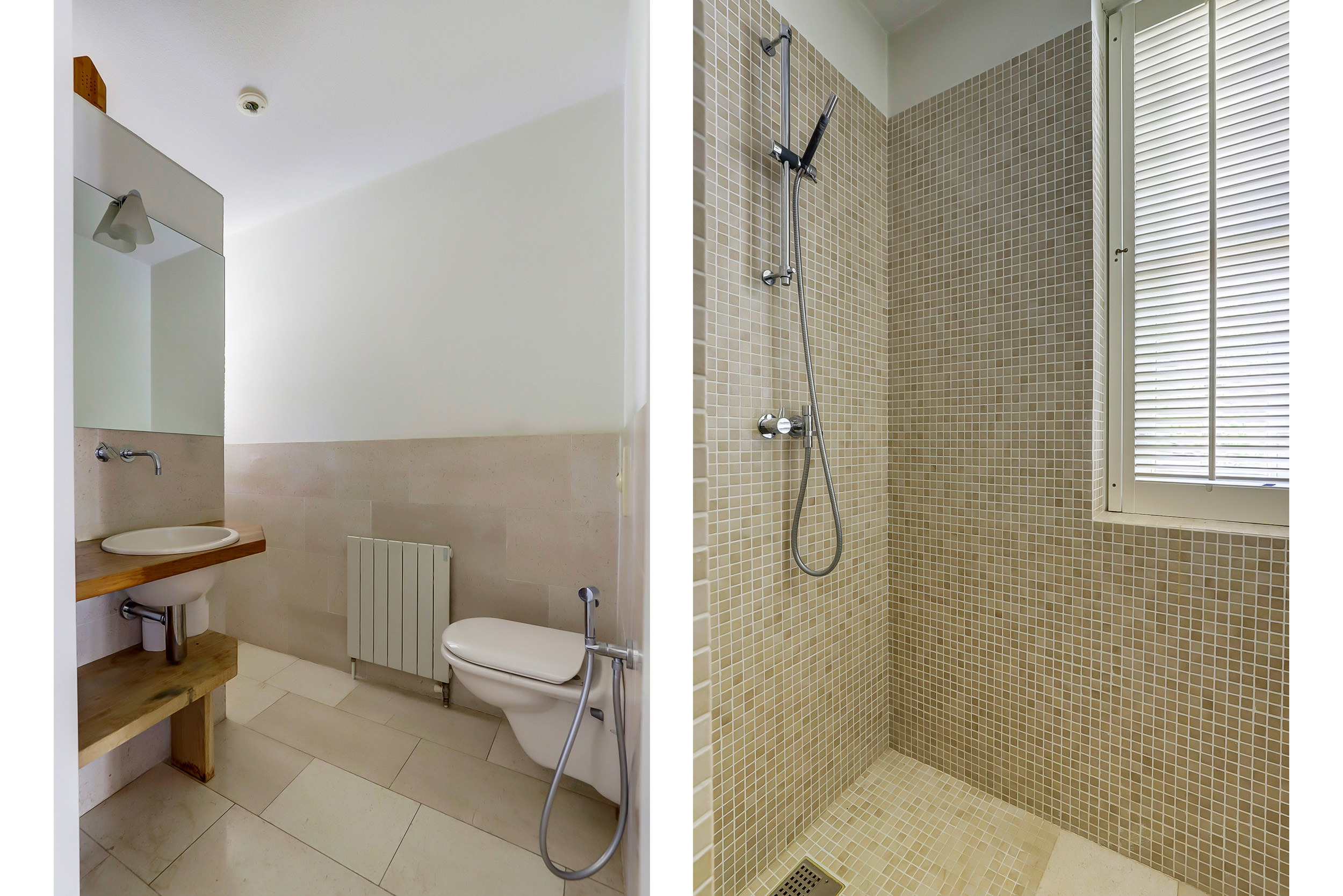 The entrance to the house is on the left side. Immediately to the left is a small bathroom with toilet, bidet hand shower, walk-in shower and washbasin, cupboard space; on the right are the meter cupboard, cloakroom and staircase.