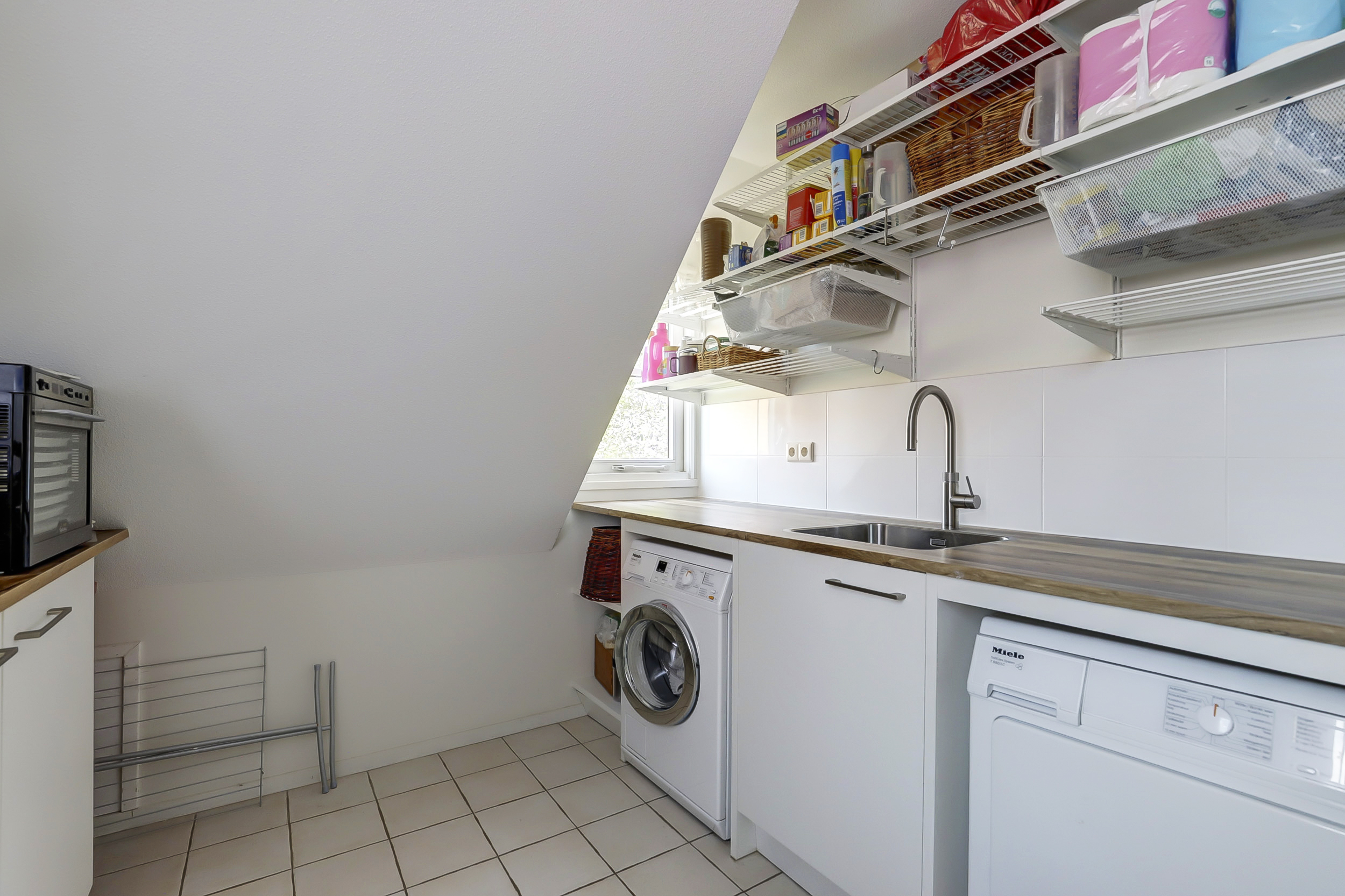 Upstairs is a large landing with three bedrooms, a bathroom, and a separate practical utility room with kitchenette, boiling-water tap (Quooker), and connections for a washing machine and dryer.