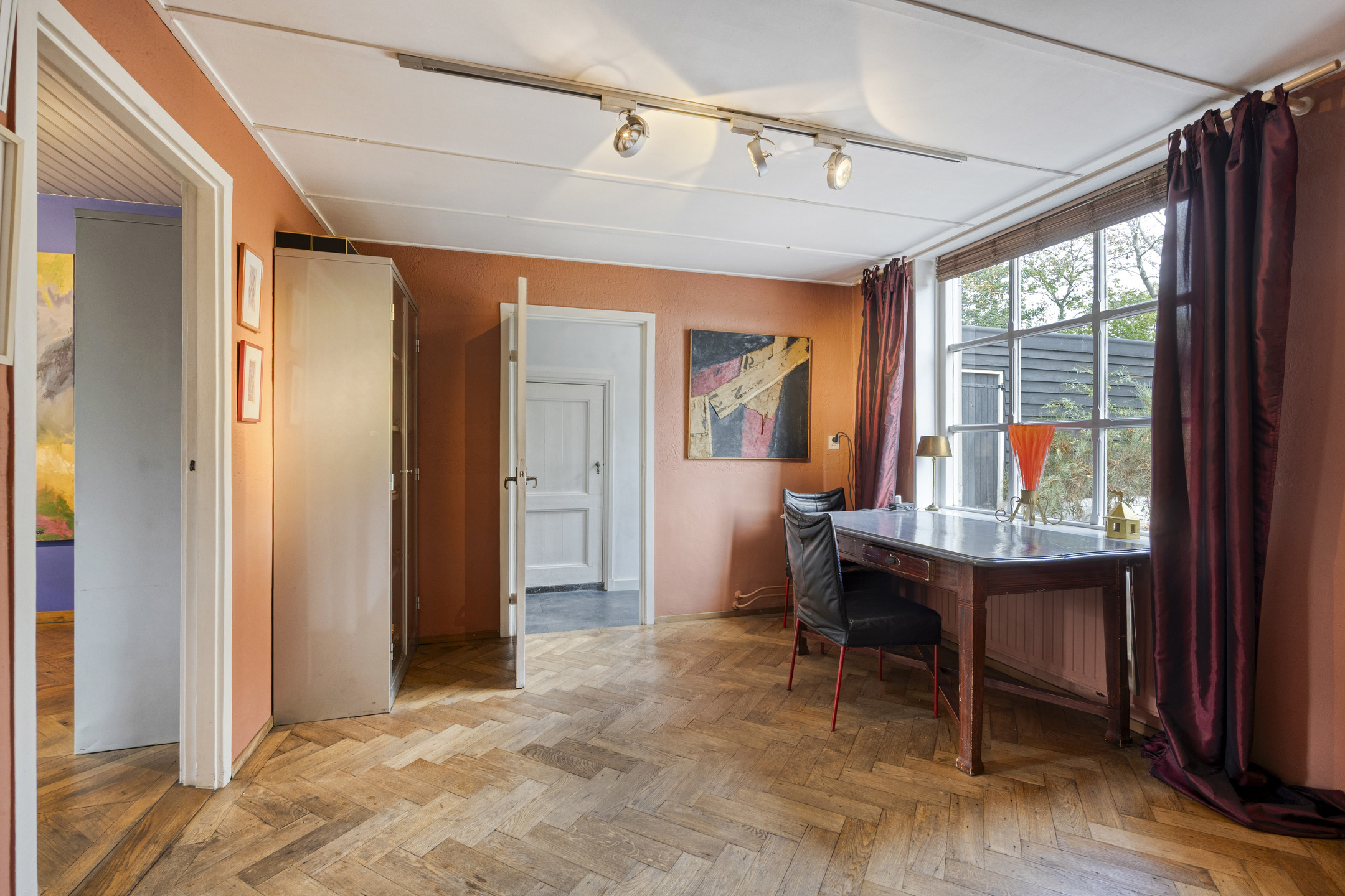 Intermediate room currently used as an office; plastered walls, herringbone floor, ceiling finished with board panels;