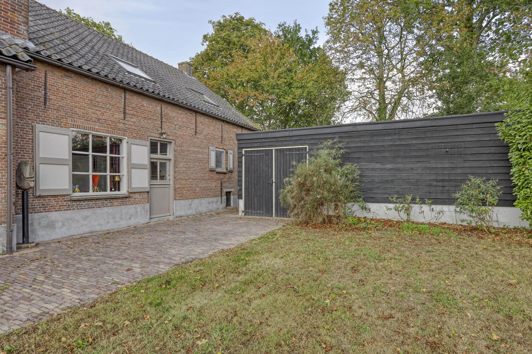 Barn I (approx. 49 m²), located at the rear right of the plot, featuring a brick base with timber cladding, double doors opening to the driveway/garden;