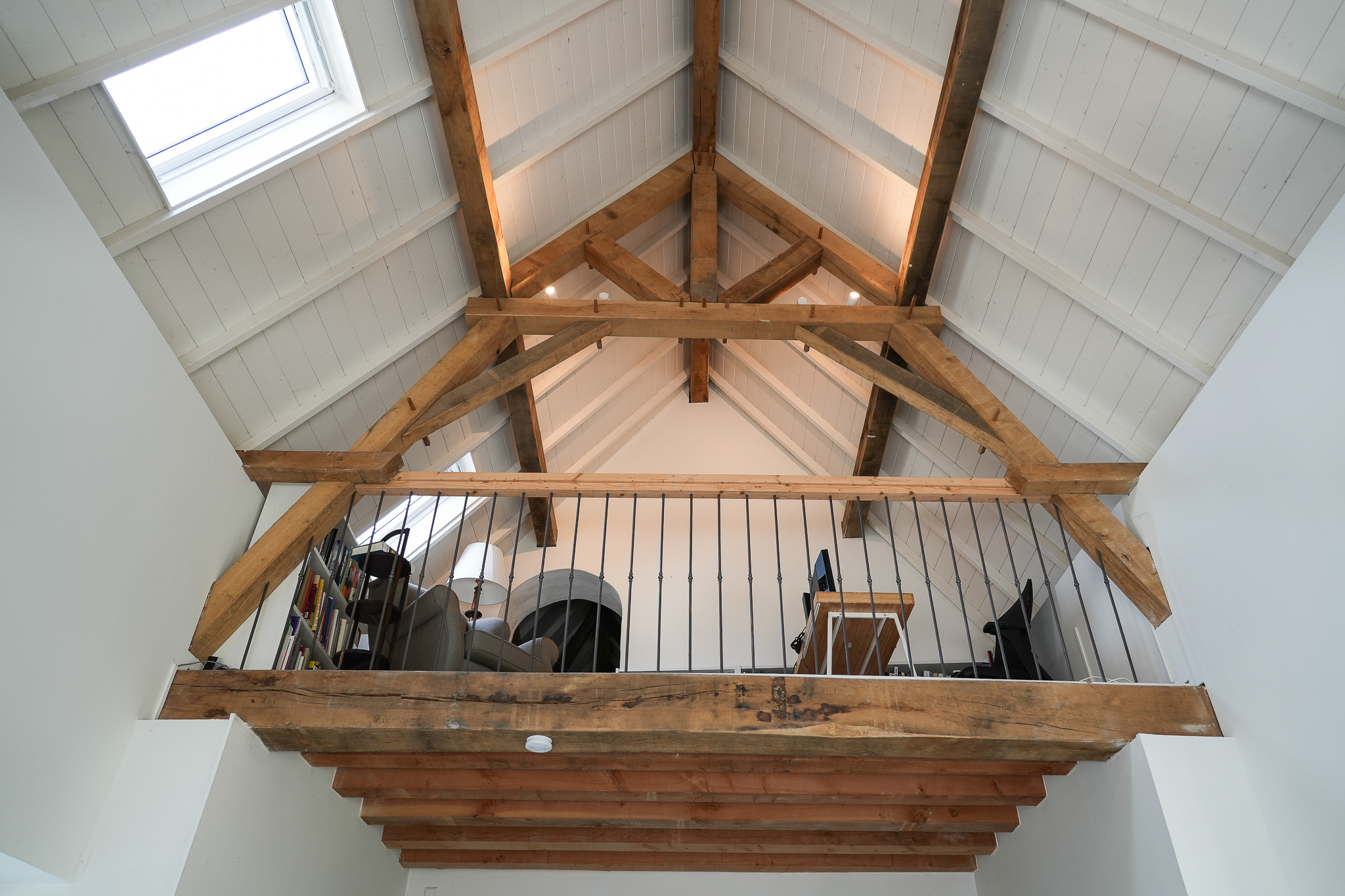 This attic room is ideal as a guest bedroom. Through a characteristic archway, a mezzanine workspace with views of the living room is reached — currently used as a reading room, beautifully lit by a roof window catching the morning sun.