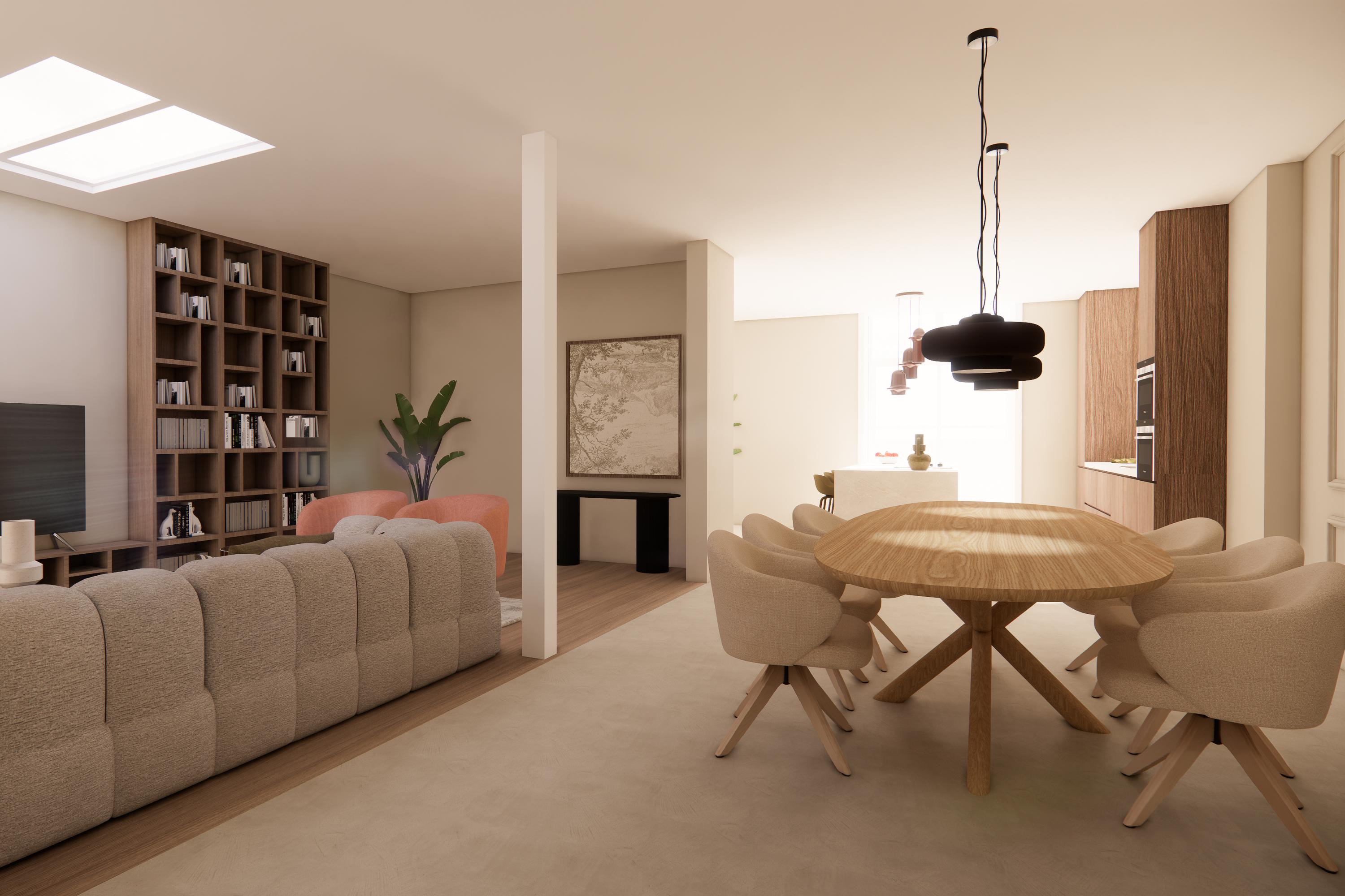 A wide contemporary staircase leads to the landing. At the rear is the slightly elevated living room with windows facing west, offering a view towards the marina. On the east side, double doors open onto the roof terrace. During the recent restoration, the ridge of the rear section was left fully exposed, creating a spectacular ceiling height of over 6.5 metres.