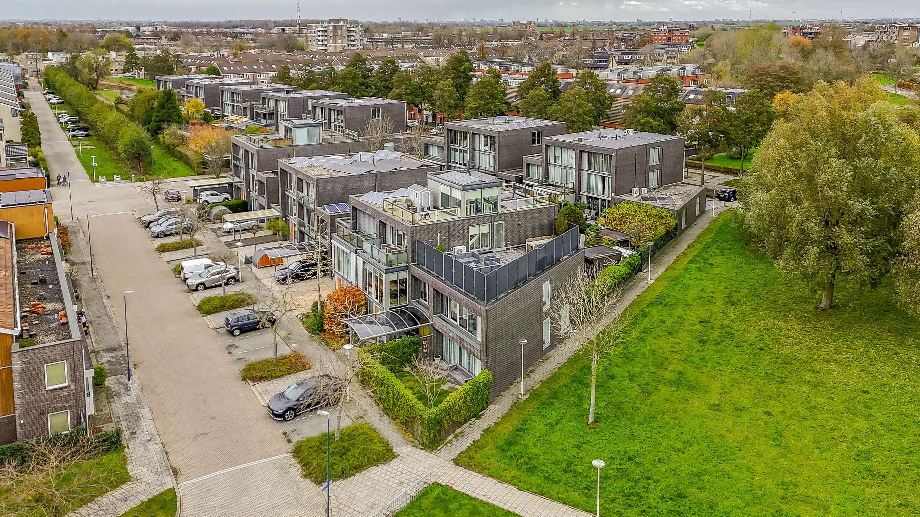 The outdoor space is just as impressive: a total of 168 m2 of outdoor area divided over a spacious front garden, back garden, 3 balconies and 3 roof terraces. This means you always have a spot in the sun as well as privacy. There is parking space on private property under the carport and there is even a private charging station available. The location in a green, quiet neighbourhood of Zoetermeer completes the living comfort. From the living room you have an unobstructed view over a green strip and mature trees – a rare combination of space, privacy and nature within easy reach.