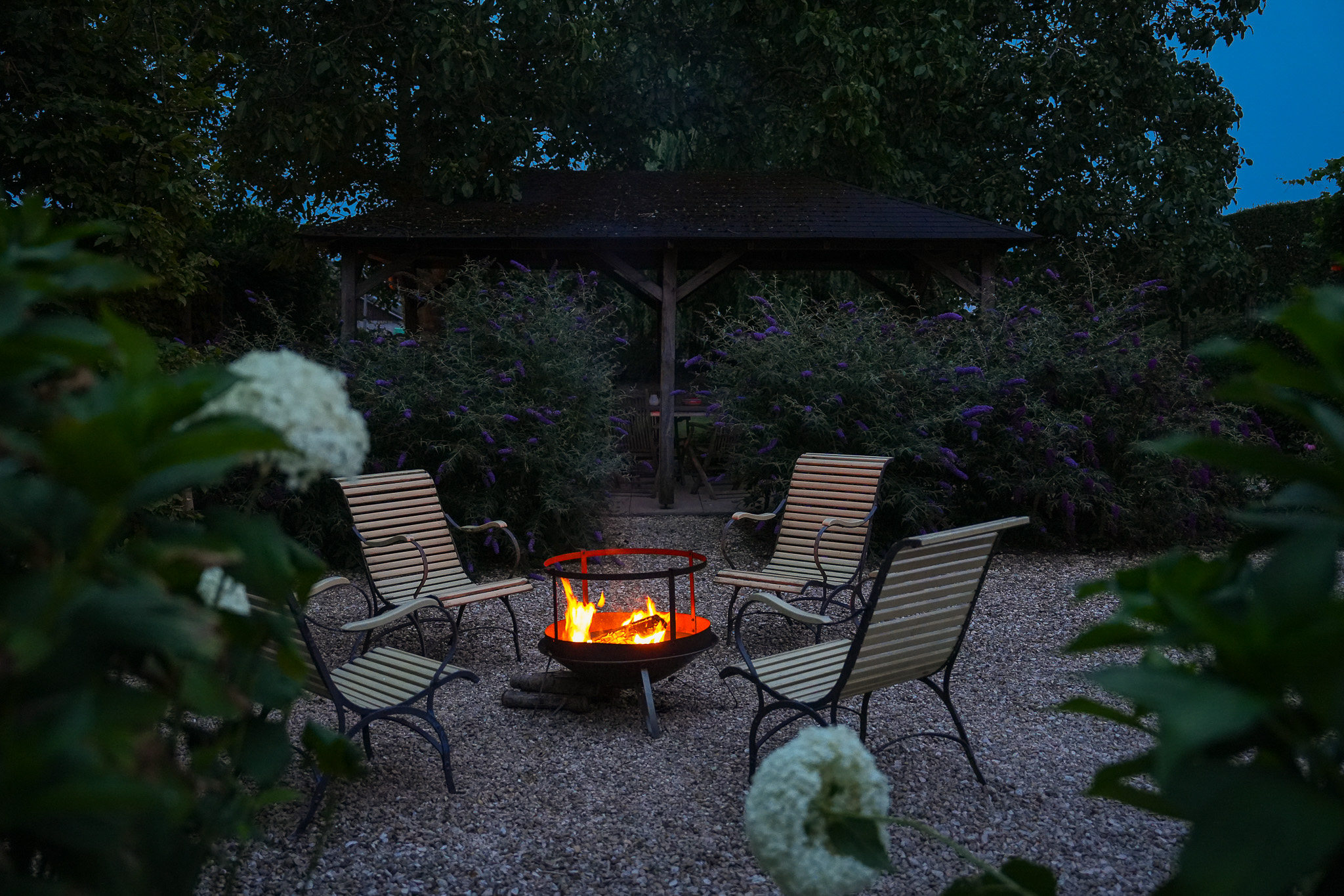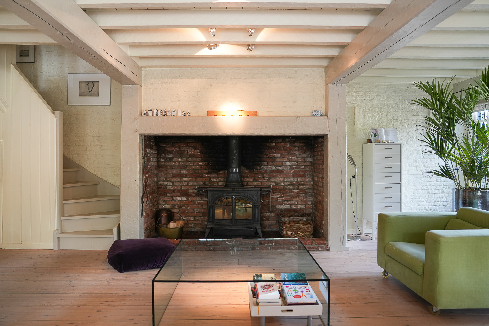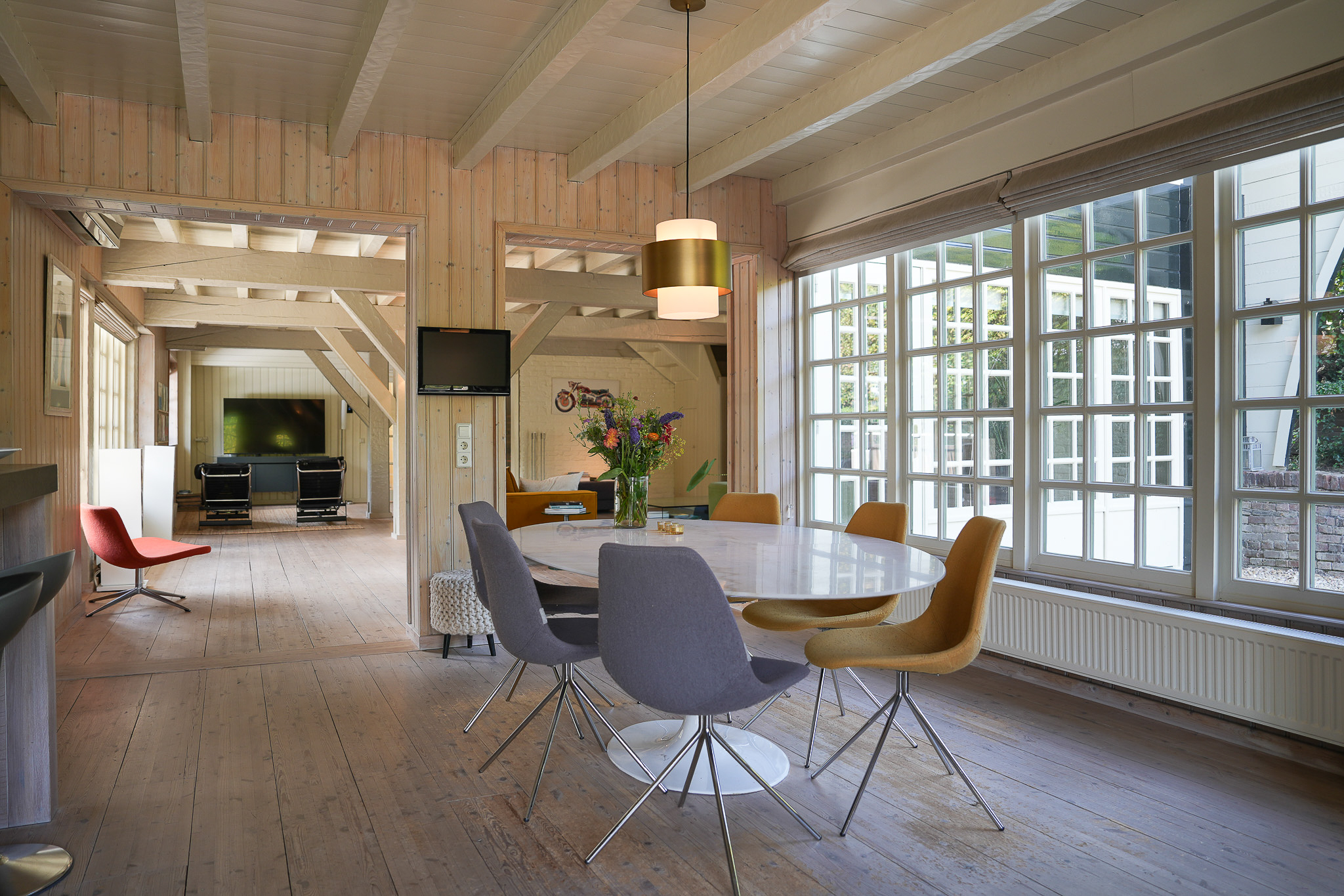 Garden-facing living space of 140 m² with wide wooden floorboards, a wood-burning stove, and a fully fitted kitchen. A portal leads to the guest room with adjoining shower room, a separate toilet, and a study on the ground floor.