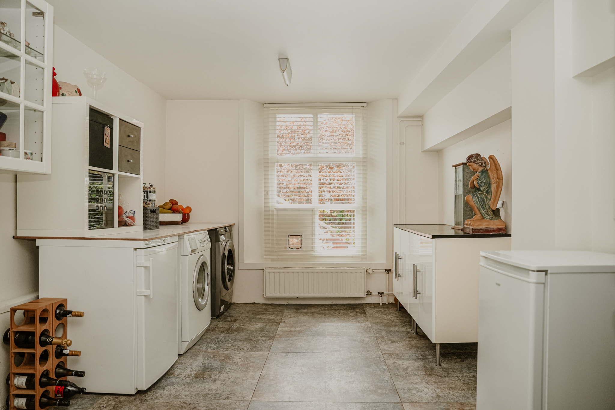 The garden room is located in the extension of the property and has French doors with six-pane division opening to a second terrace. The current owner uses this room as an office, but it could also serve as a cozy TV or playroom. The floor is largely laid with antique red abbey tiles and features underfloor heating.