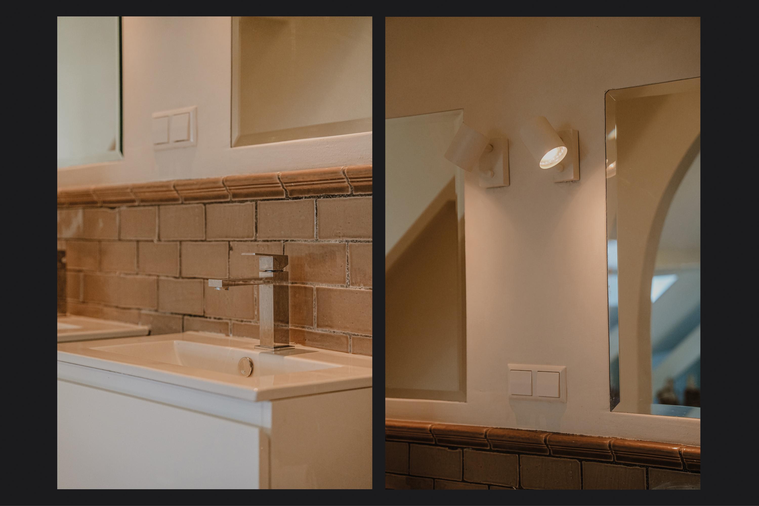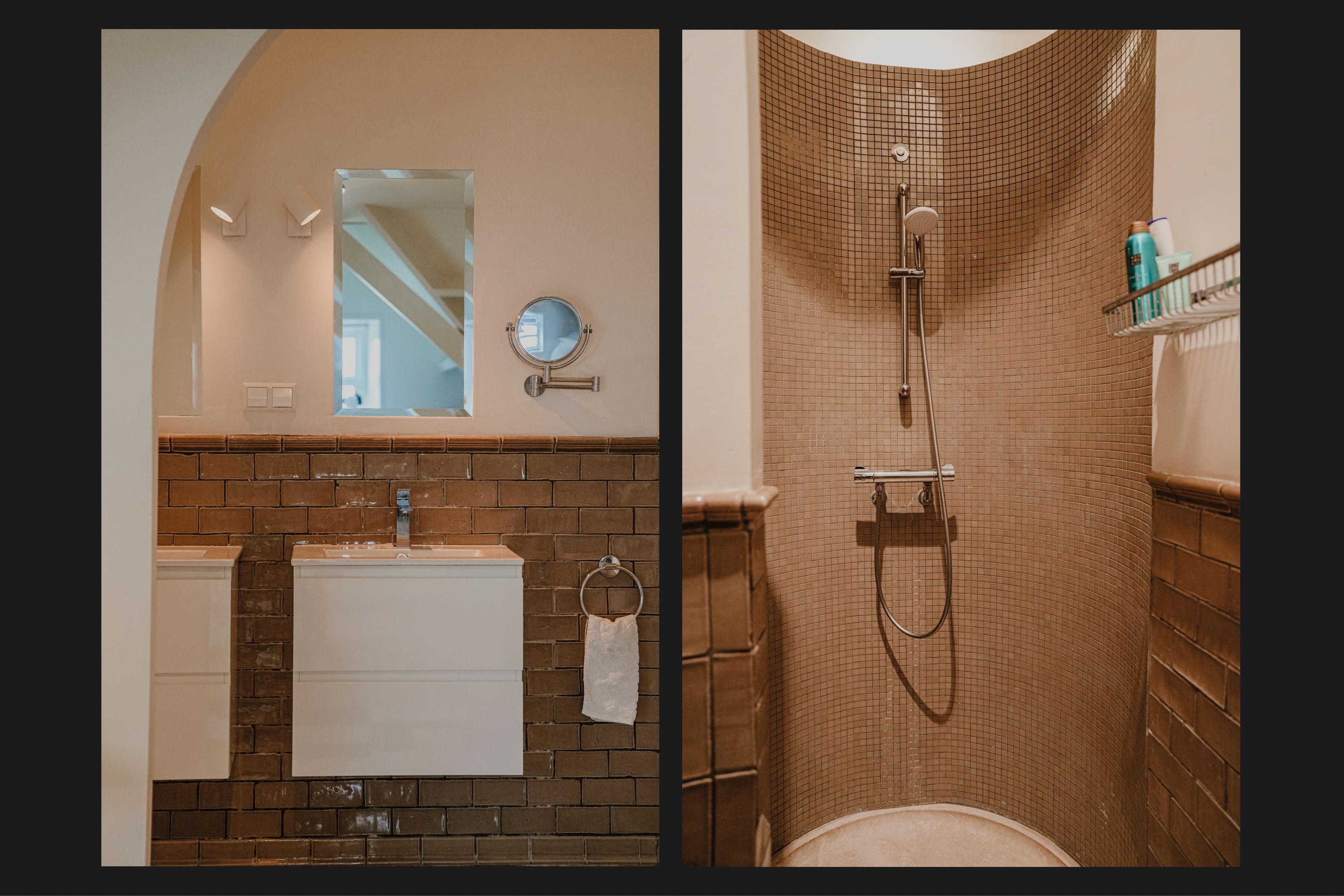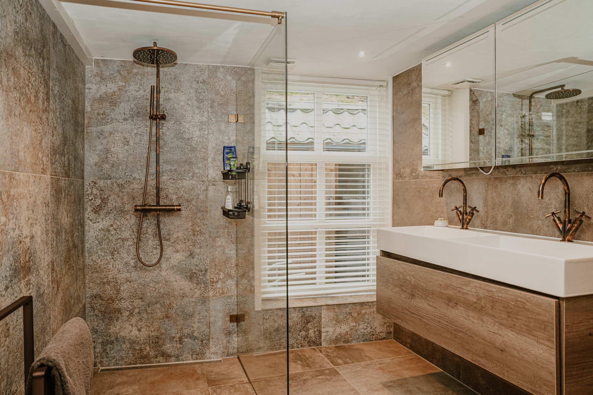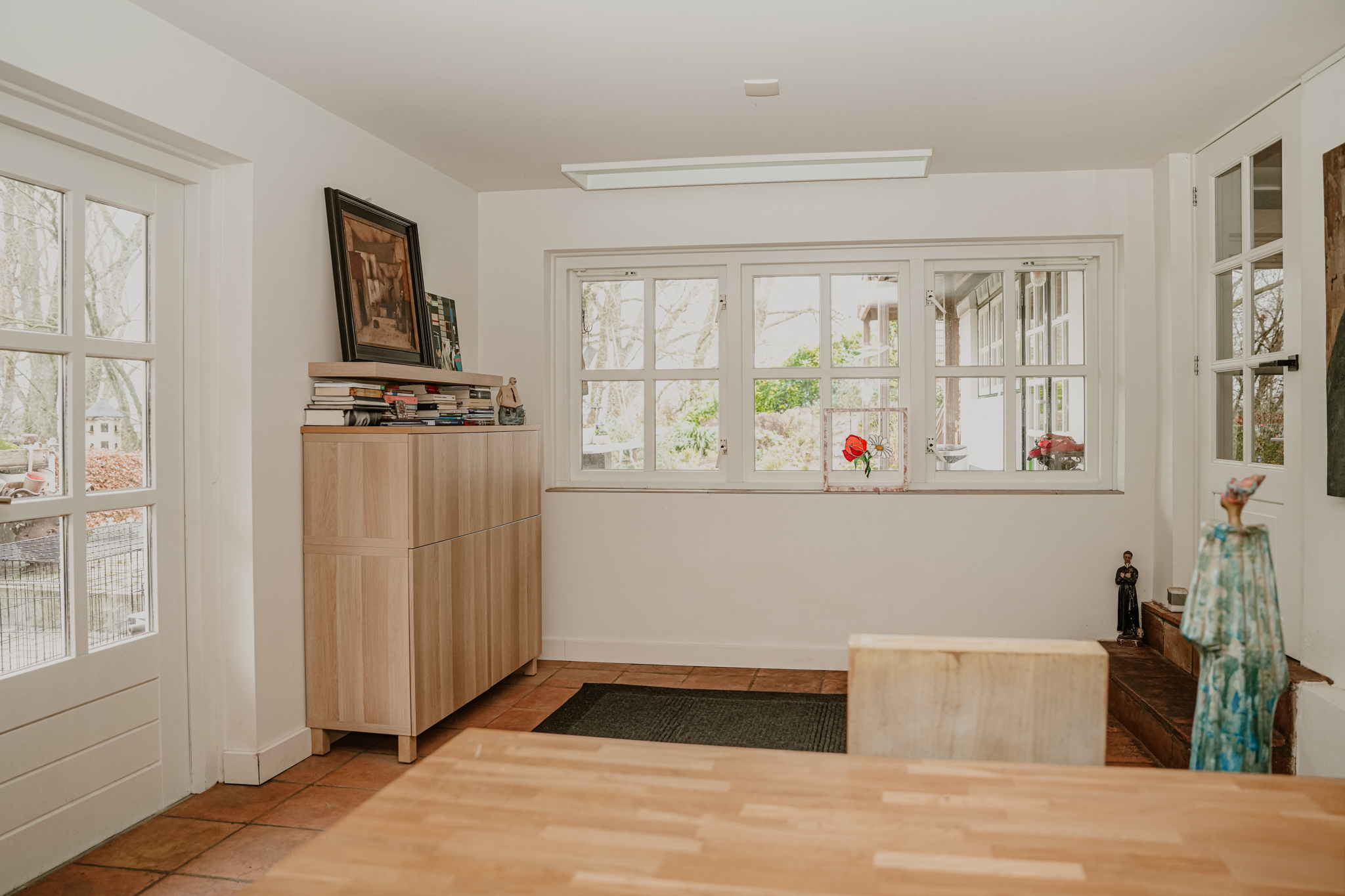 The entrance, through a shared Dutch door on the side of the house, provides direct access to the spacious kitchen. On the dike side, there is an elevated dining area that seamlessly blends with the handcrafted kitchen. The kitchen features a beautiful Belgian bluestone countertop with an authentic pump basin. From the kitchen, you have direct access to the river-facing terrace. Adjacent to the dining room is a spacious utility room with laundry connections, where the inverter and home battery are also located. The lower section leads to the garden/office room, a bedroom, a toilet, and a new (guest) bathroom with a walk-in shower and vanity.