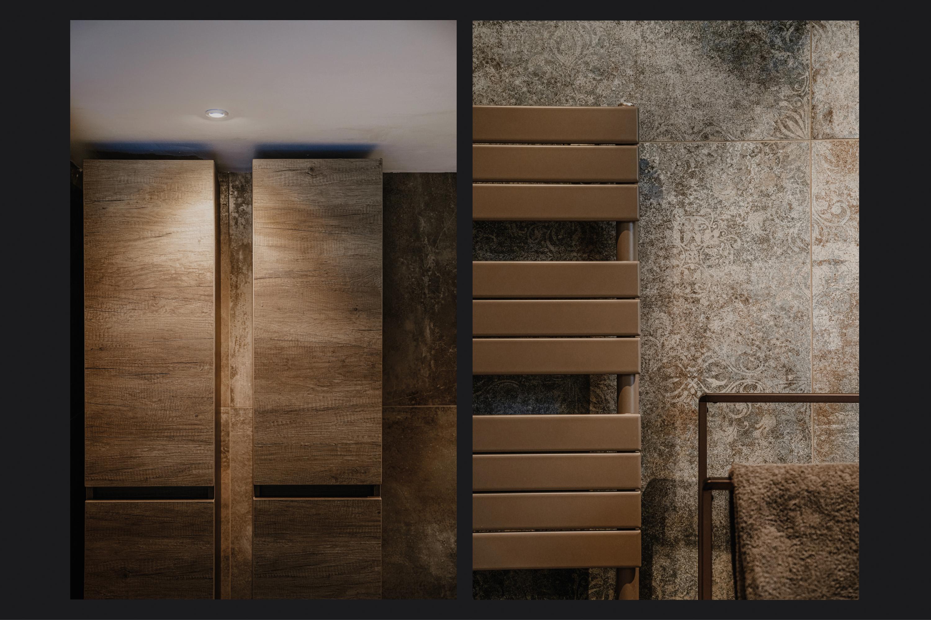 The floors on this level are finished with beautiful oak planks. On the west side of the original dike house is a spacious bedroom with a walk-in closet and a second bathroom. This bathroom features a walk-in shower, toilet, double vanity, and a natural stone floor.