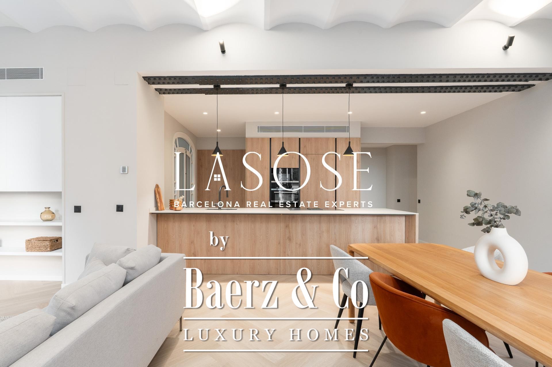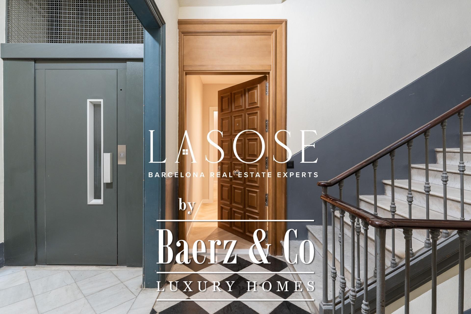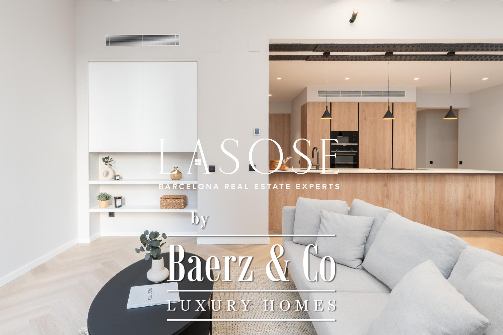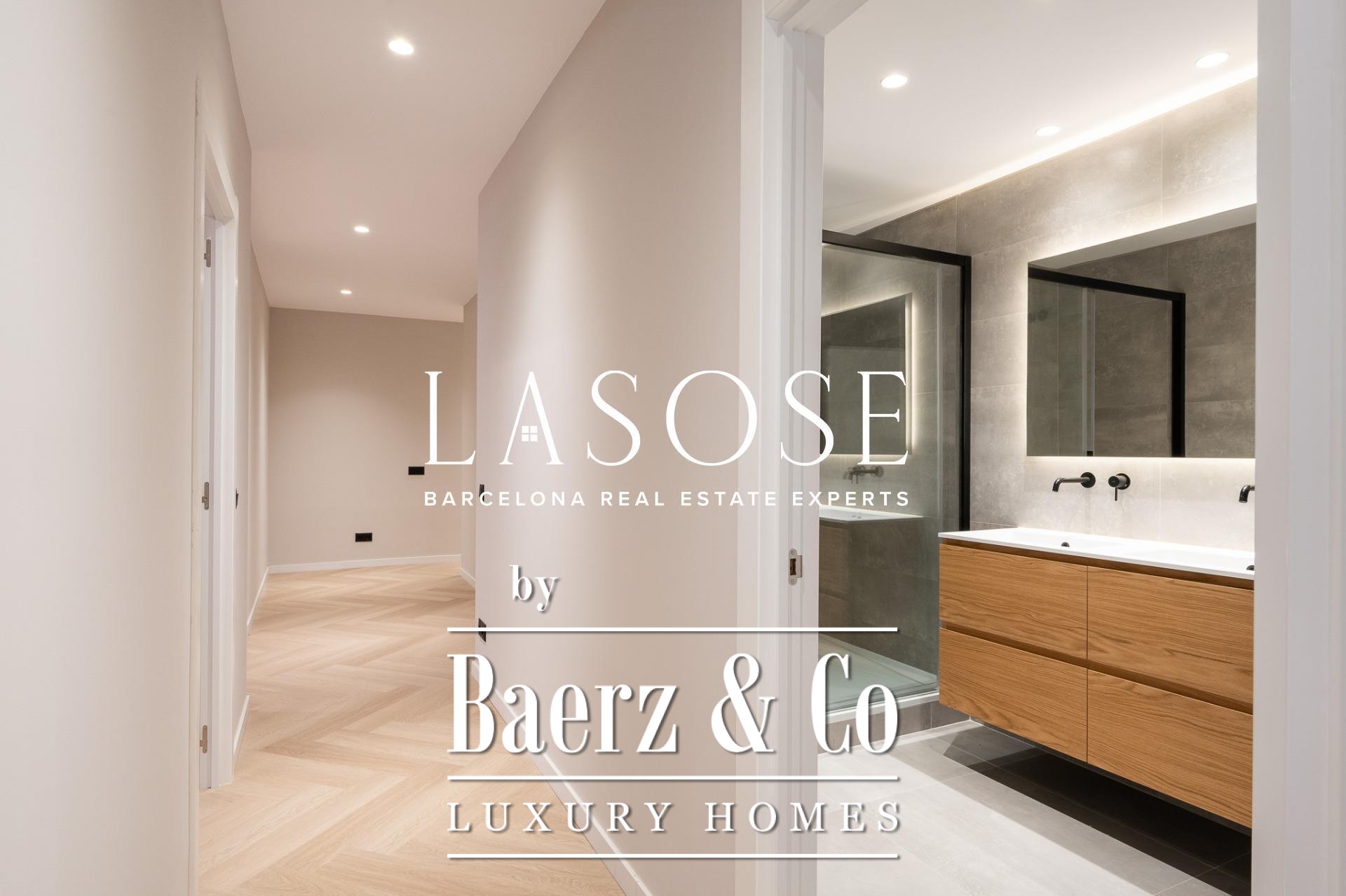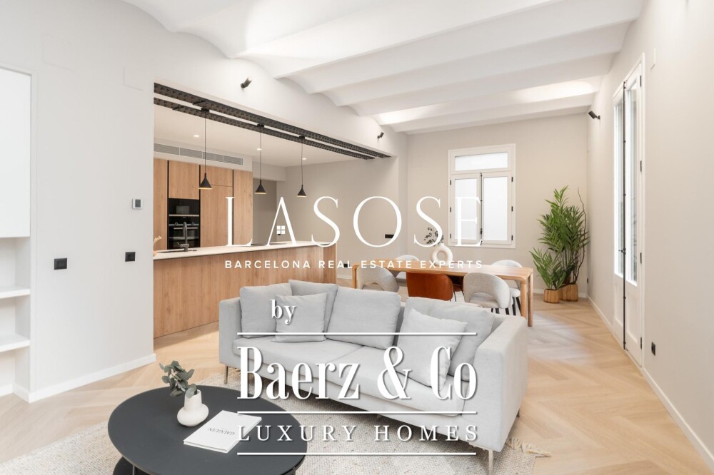 Tres dormitorios, incluyendo una suite principal con baño privado y vestidor independiente, se complementan con armarios empotrados y carpintería a medida. El confort se garantiza mediante climatización aerotérmica y ventanas de madera con doble acristalamiento. Los residentes disfrutan de las comodidades de ascensor, servicio de conserjería, videoportero y puerta acorazada de seguridad. La versión de larga cola de apartamento de lujo en venta en Barcelona es ideal para quienes valoran la discreción y el diseño.