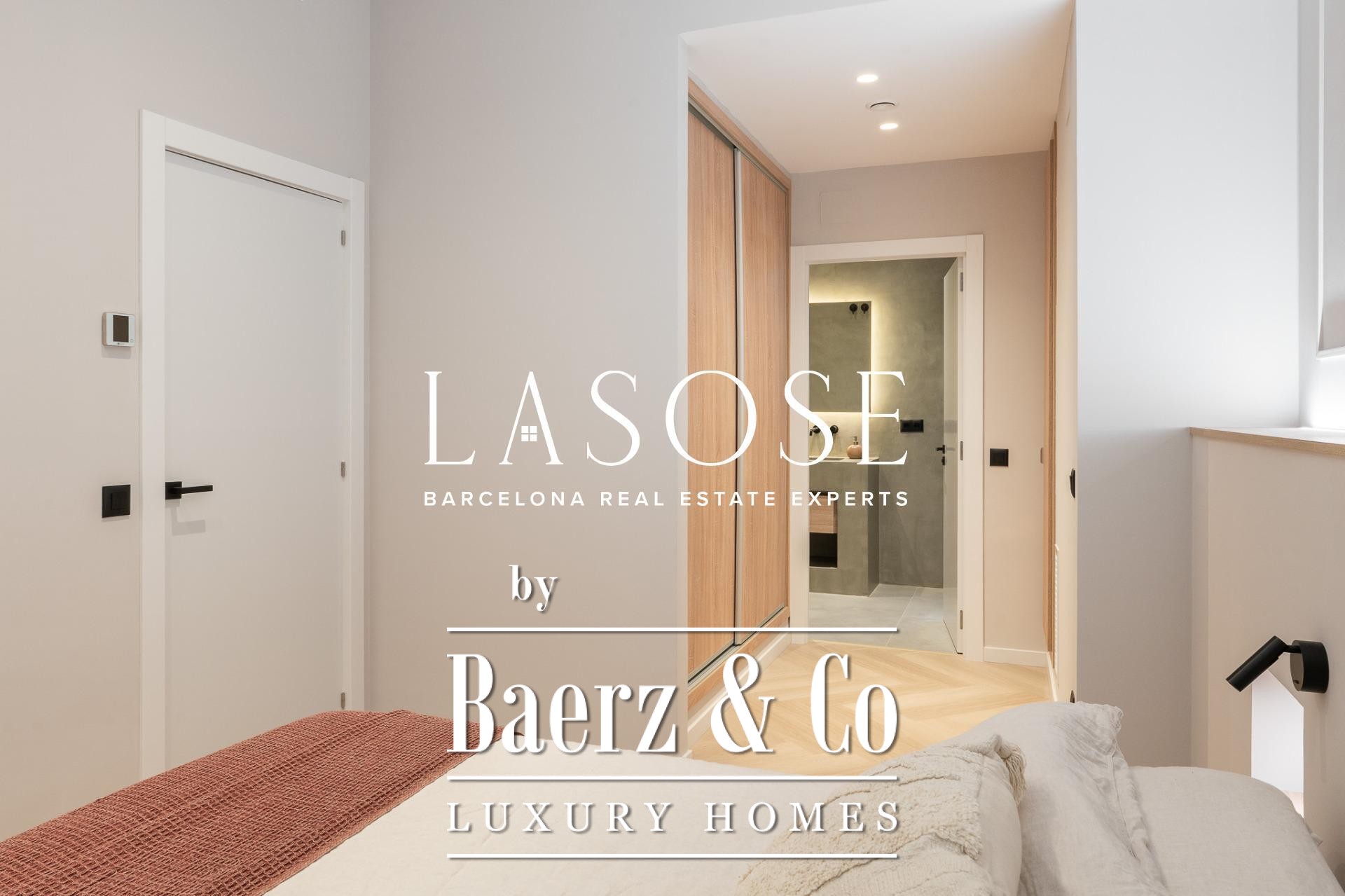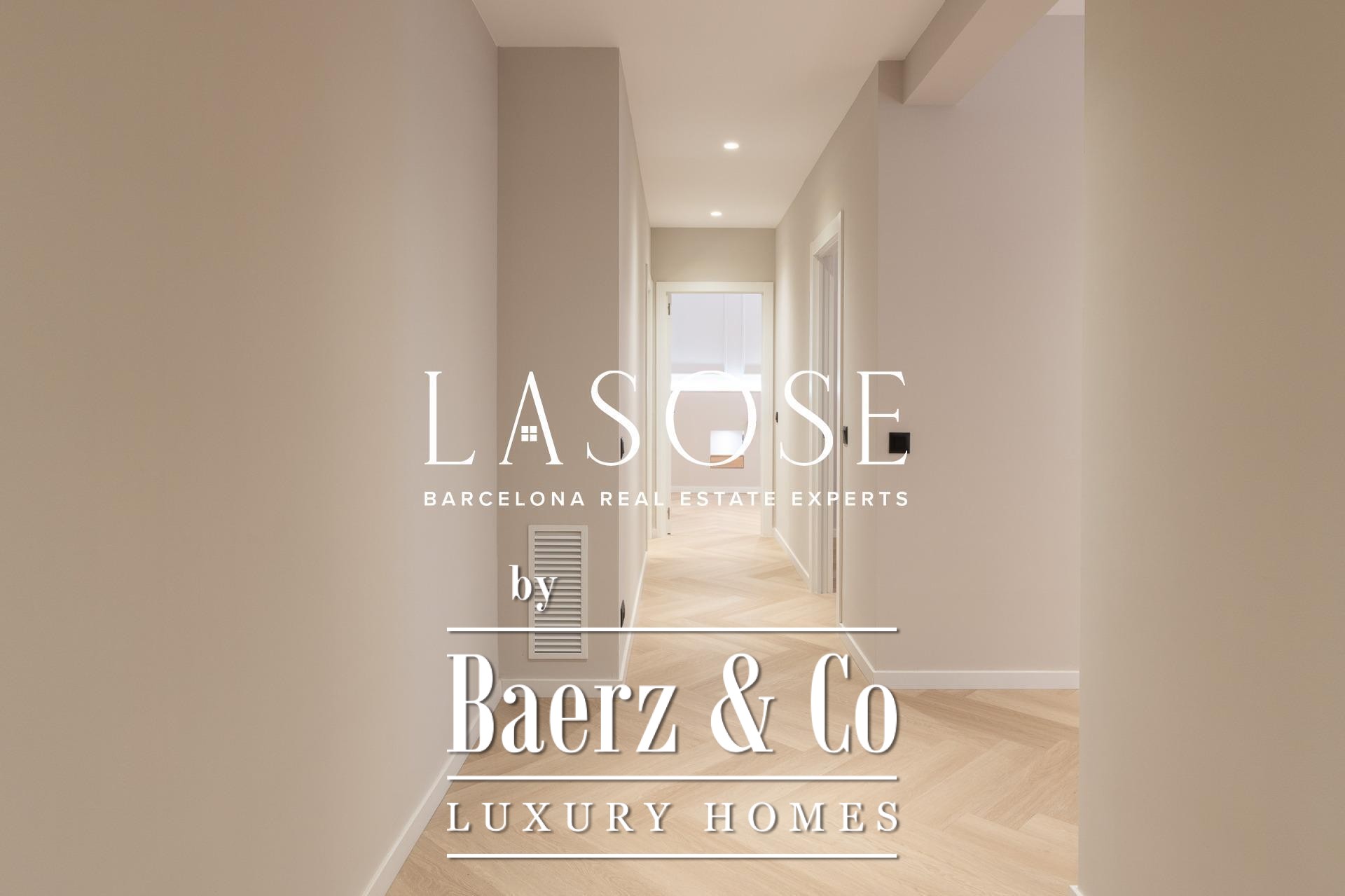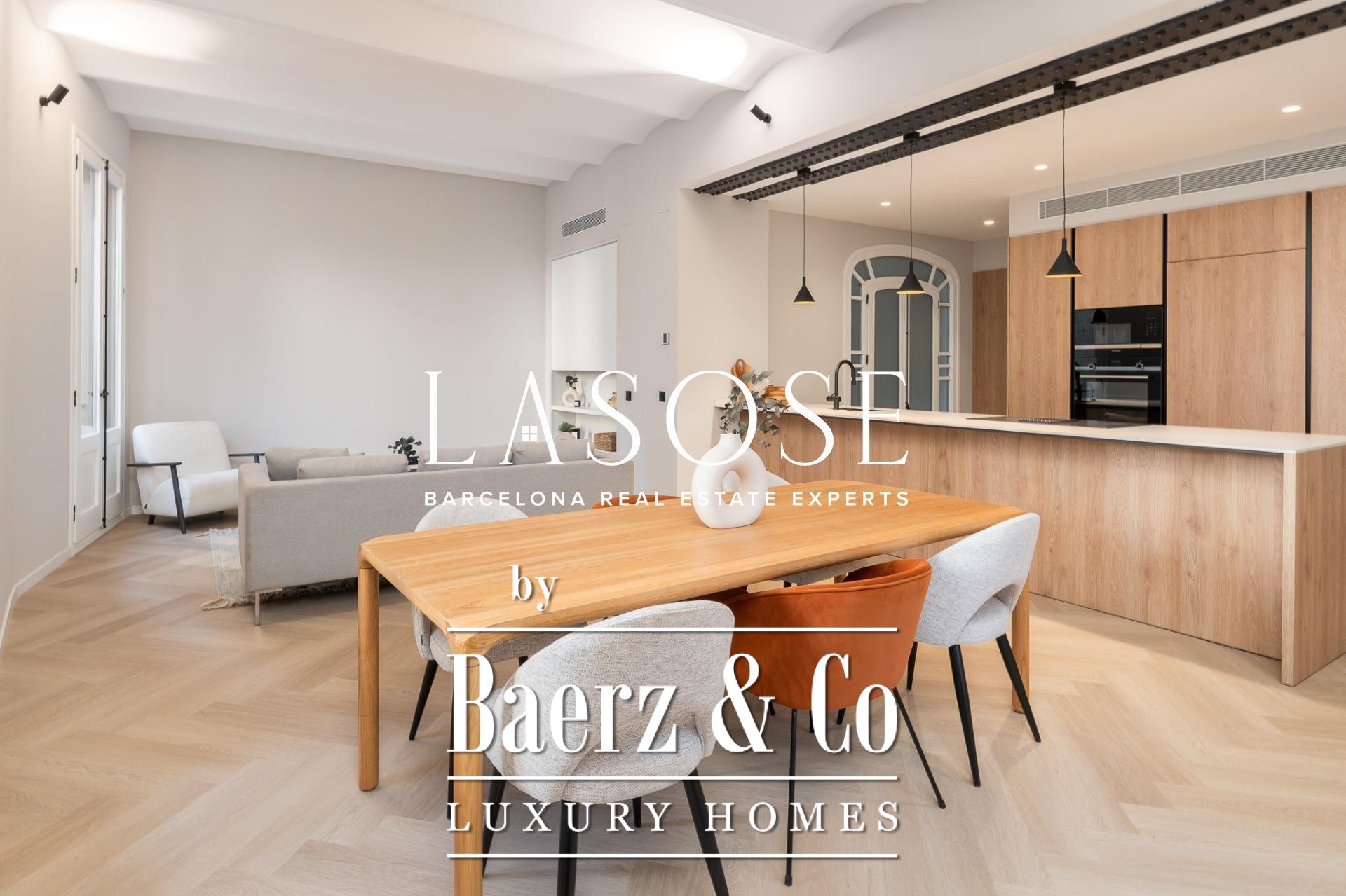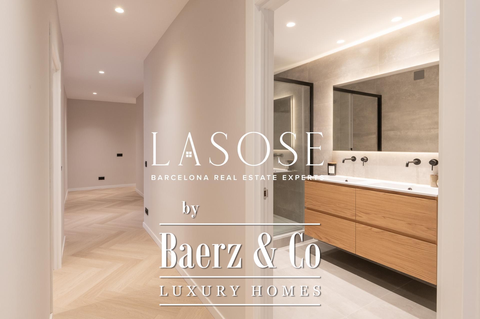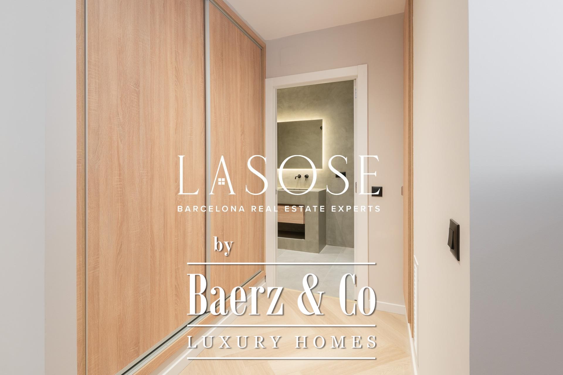Tres dormitorios, incluyendo una suite principal con baño privado y vestidor independiente, se complementan con armarios empotrados y carpintería a medida. El confort se garantiza mediante climatización aerotérmica y ventanas de madera con doble acristalamiento. Los residentes disfrutan de las comodidades de ascensor, servicio de conserjería, videoportero y puerta acorazada de seguridad. La versión de larga cola de apartamento de lujo en venta en Barcelona es ideal para quienes valoran la discreción y el diseño.