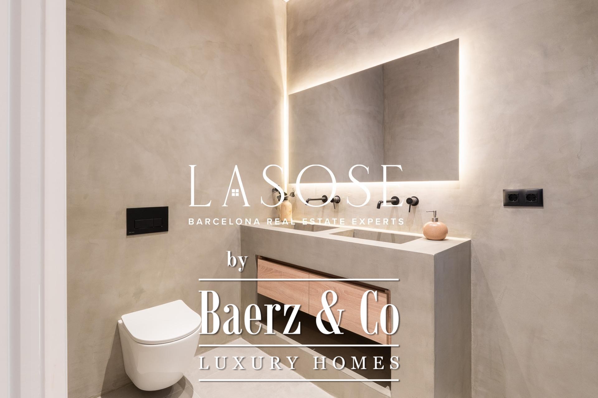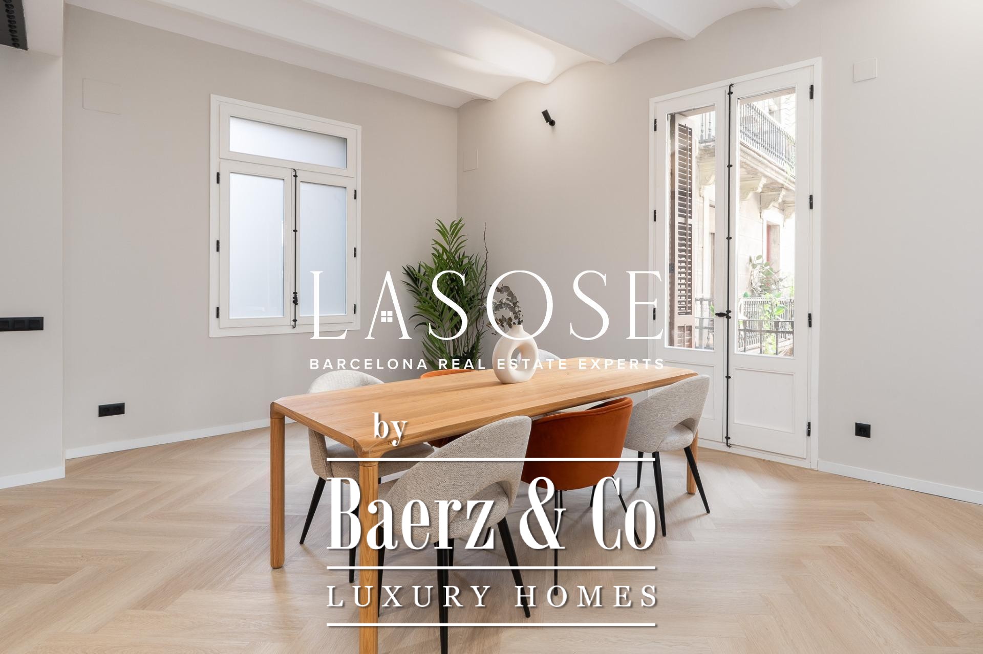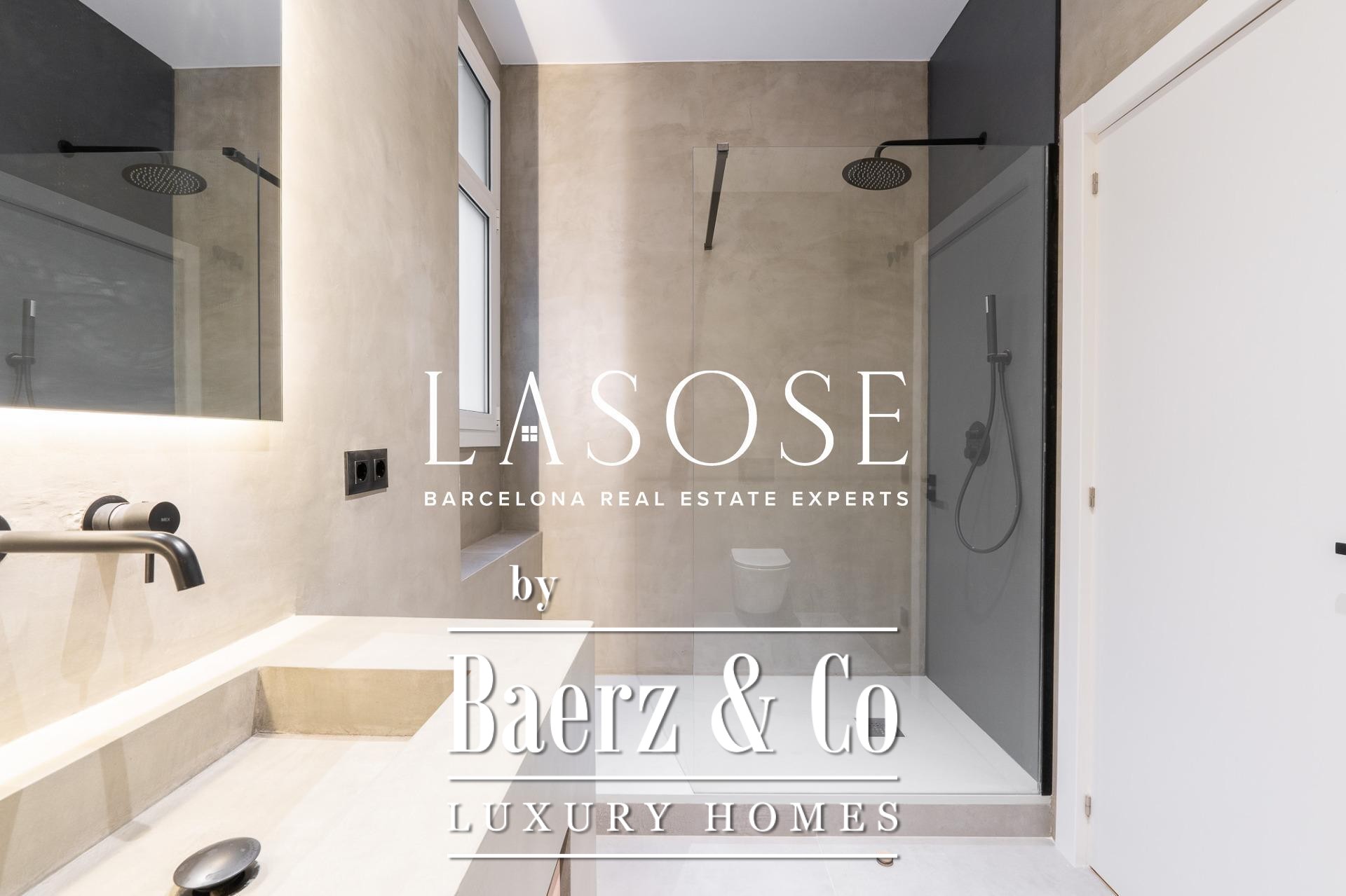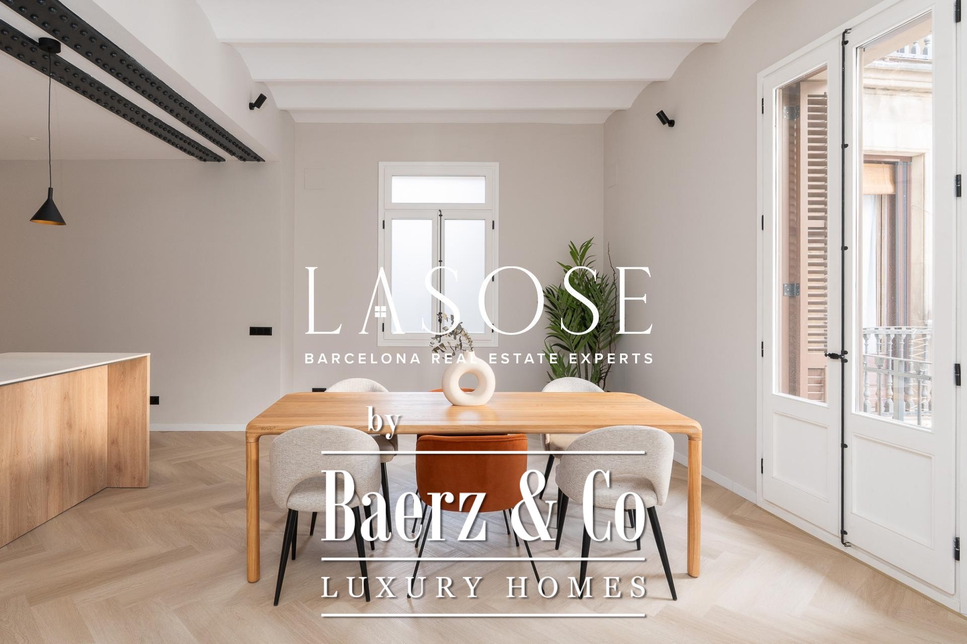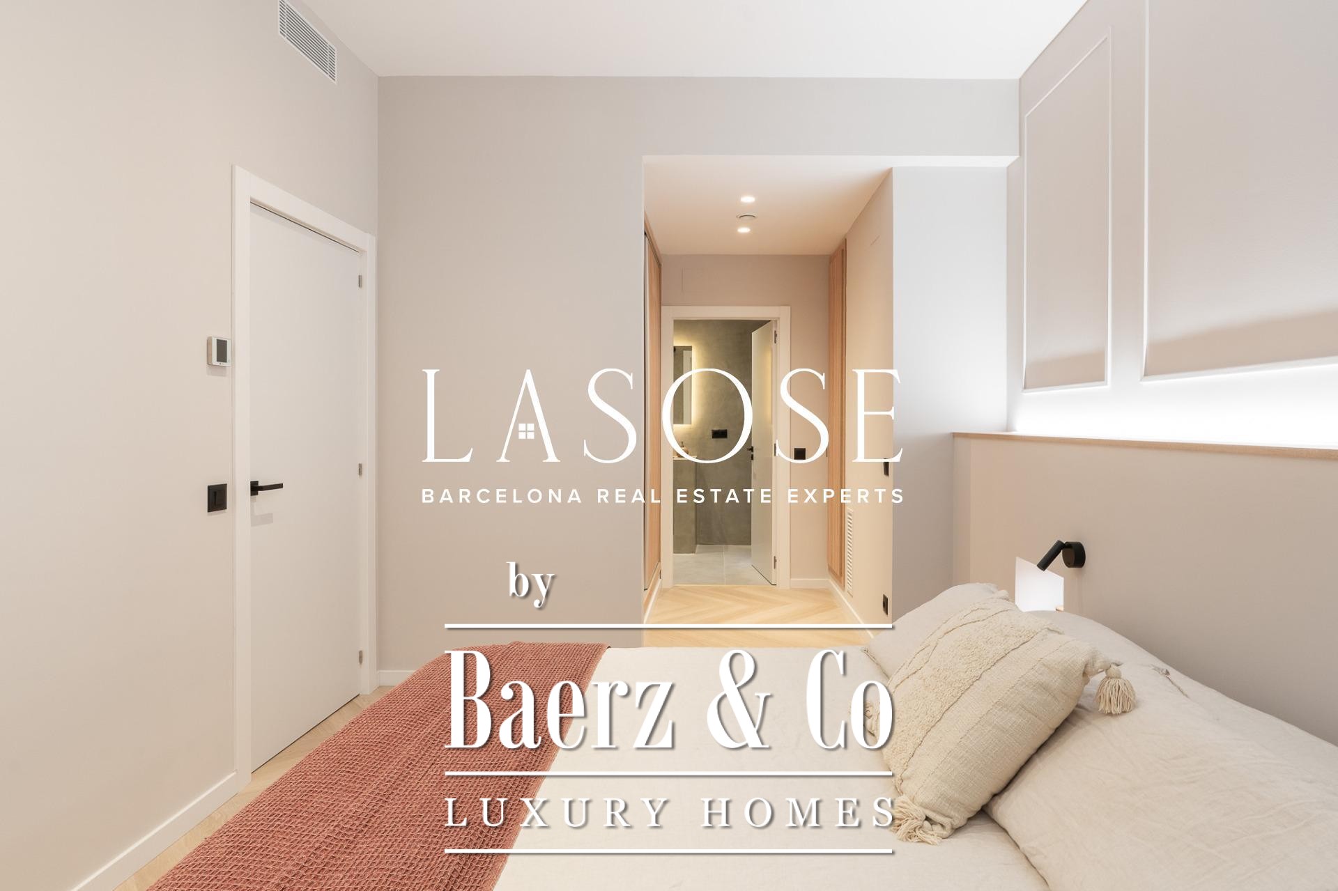 Tres dormitorios, incluyendo una suite principal con baño privado y vestidor independiente, se complementan con armarios empotrados y carpintería a medida. El confort se garantiza mediante climatización aerotérmica y ventanas de madera con doble acristalamiento. Los residentes disfrutan de las comodidades de ascensor, servicio de conserjería, videoportero y puerta acorazada de seguridad. La versión de larga cola de apartamento de lujo en venta en Barcelona es ideal para quienes valoran la discreción y el diseño.