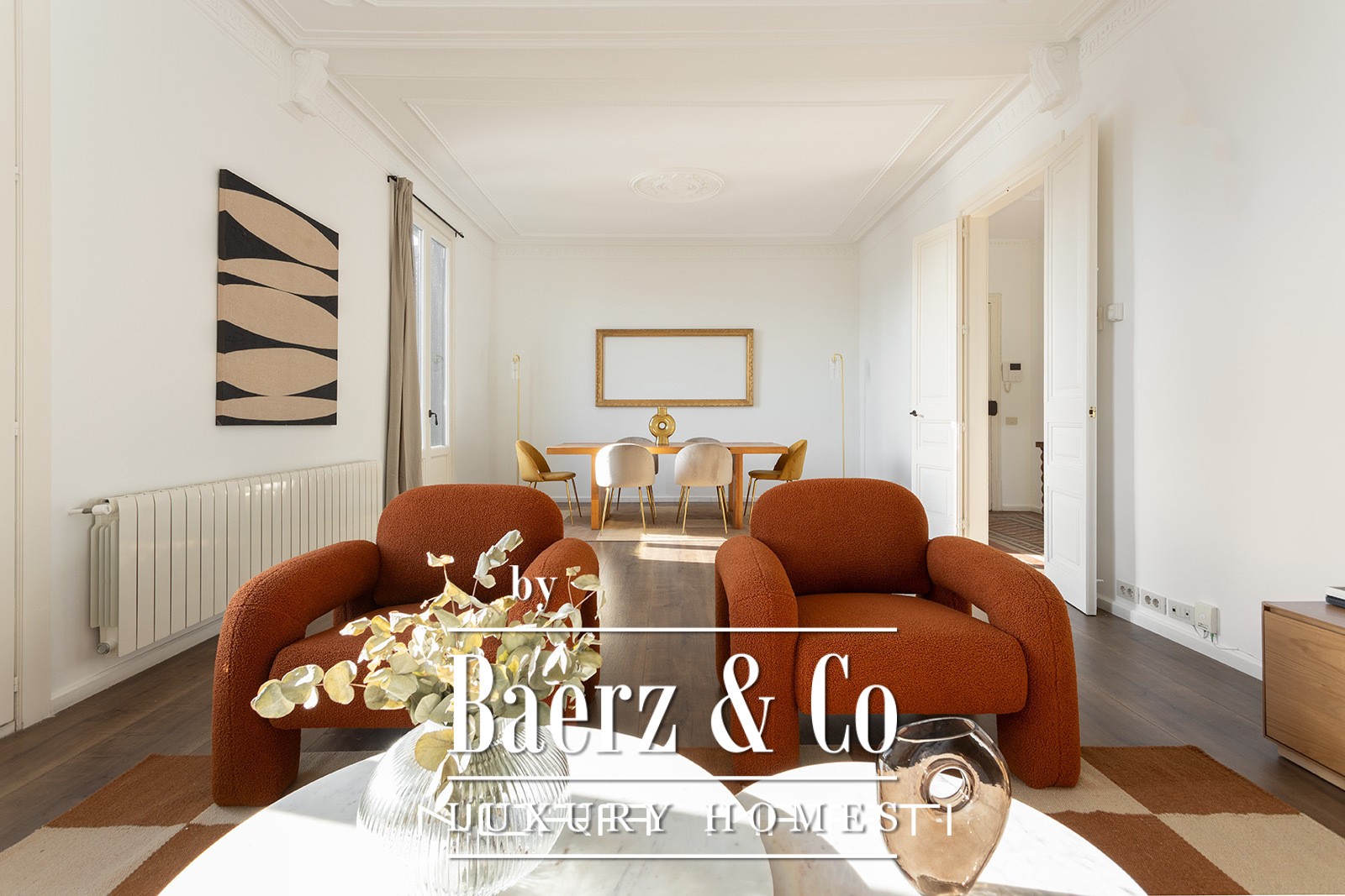 Con una superficie de 152 m², la vivienda ha sido completamente renovada, combinando sensibilidad contemporánea con una estructura histórica. En el interior, el mobiliario moderno y refinado aporta cohesión y claridad, marcando el tono para una vida urbana discreta. La distribución consta de tres dormitorios —uno doble y dos individuales—, así como dos baños, garantizando el equilibrio entre zonas privadas y sociales. Los grandes ventanales del salón, característicos de su época, inundan el espacio de luz natural, realzada por la favorable orientación y el calor del suelo de parquet. La cocina, completamente equipada y con espacio para desayunar, añade comodidad al día a día.