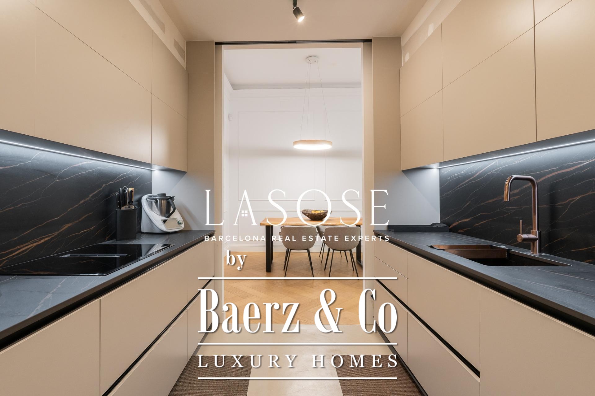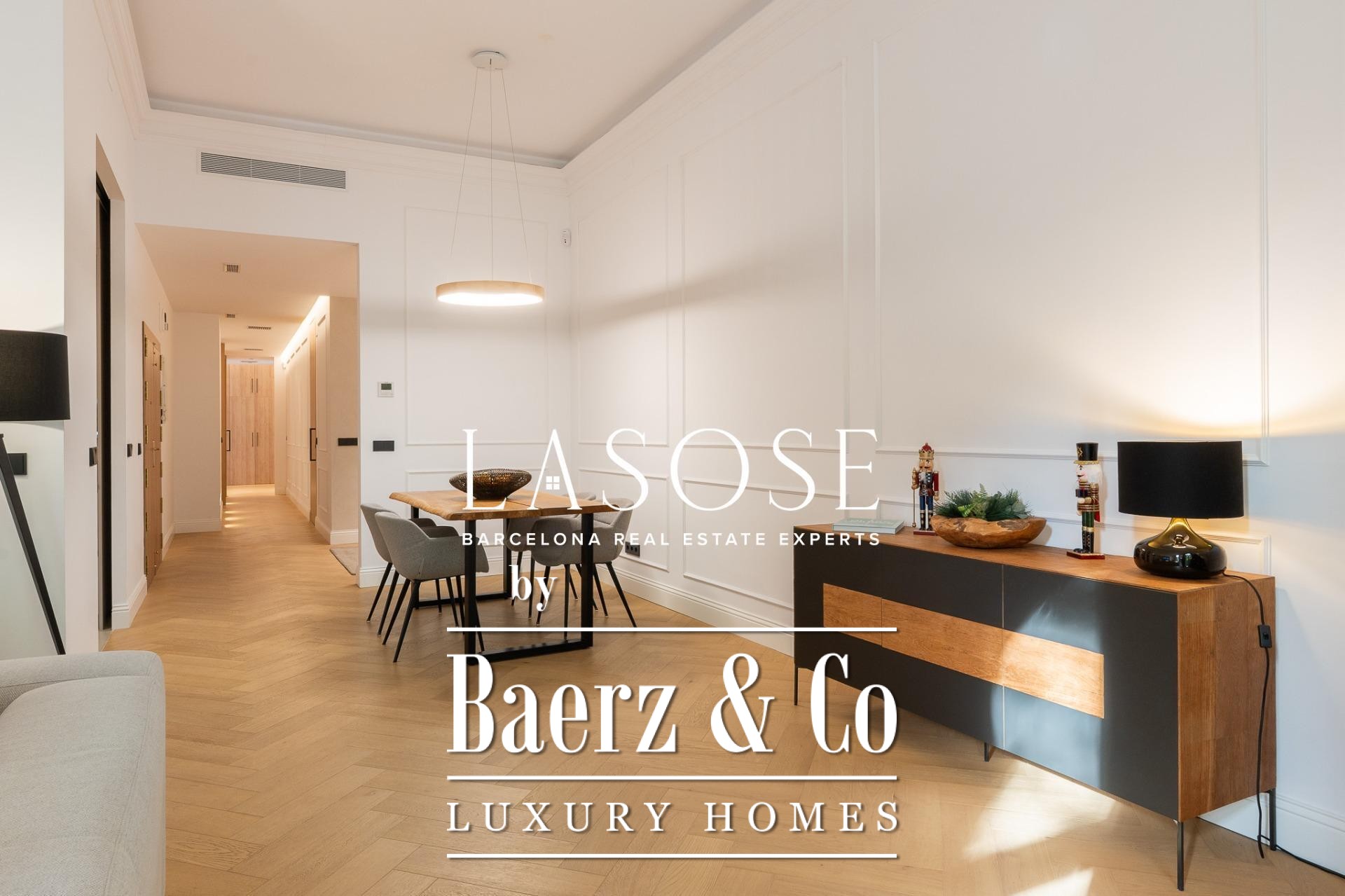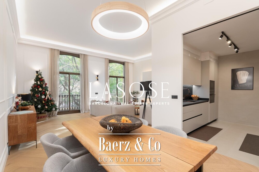 La distribución del apartamento destaca por un amplio salón comedor independiente con techos altos, tres dormitorios—uno de ellos una elegante suite, uno doble y uno sencillo—y dos baños completos. La cocina, totalmente equipada, presenta un diseño contemporáneo con materiales de primera calidad y combina a la perfección modernidad y tradición. Un balcón de unos 4,61 metros cuadrados proporciona luz, vistas a la ciudad y una conexión directa con el ambiente de la calle Carrer de Casp.