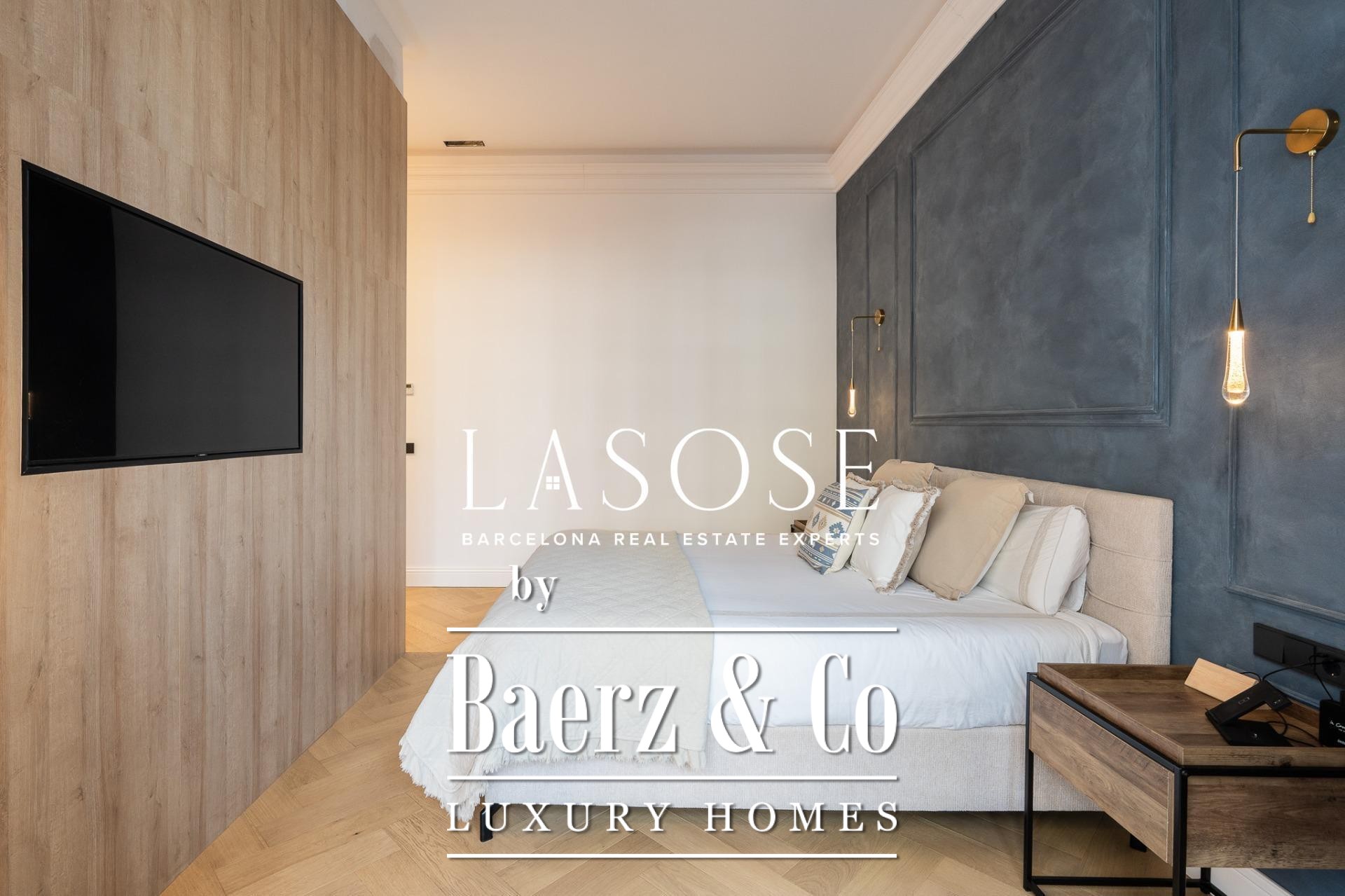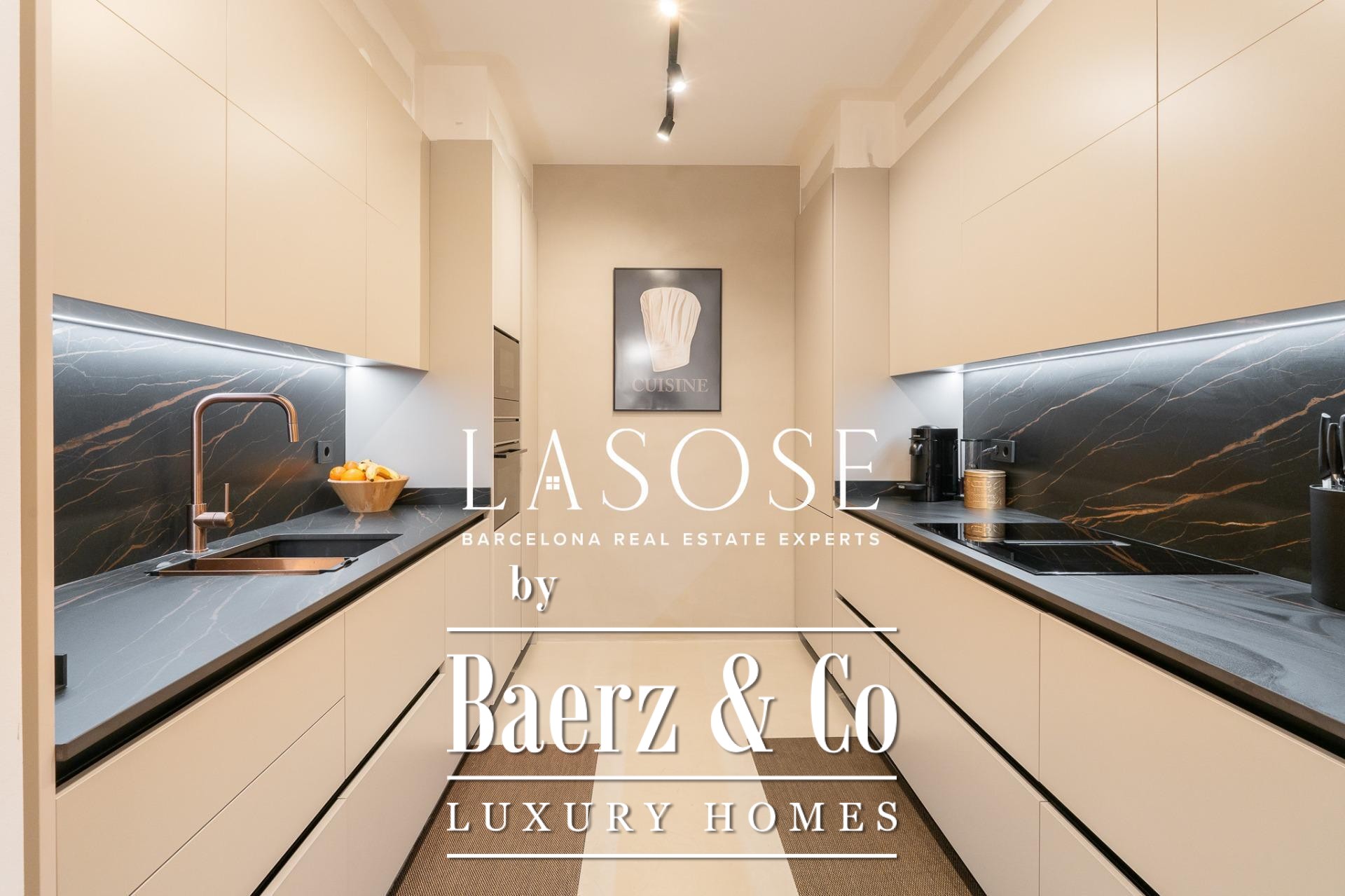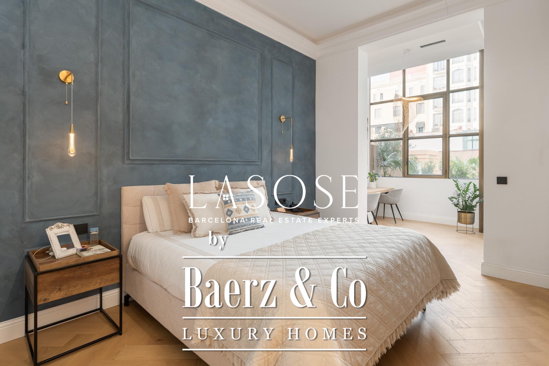La distribución del apartamento destaca por un amplio salón comedor independiente con techos altos, tres dormitorios—uno de ellos una elegante suite, uno doble y uno sencillo—y dos baños completos. La cocina, totalmente equipada, presenta un diseño contemporáneo con materiales de primera calidad y combina a la perfección modernidad y tradición. Un balcón de unos 4,61 metros cuadrados proporciona luz, vistas a la ciudad y una conexión directa con el ambiente de la calle Carrer de Casp.