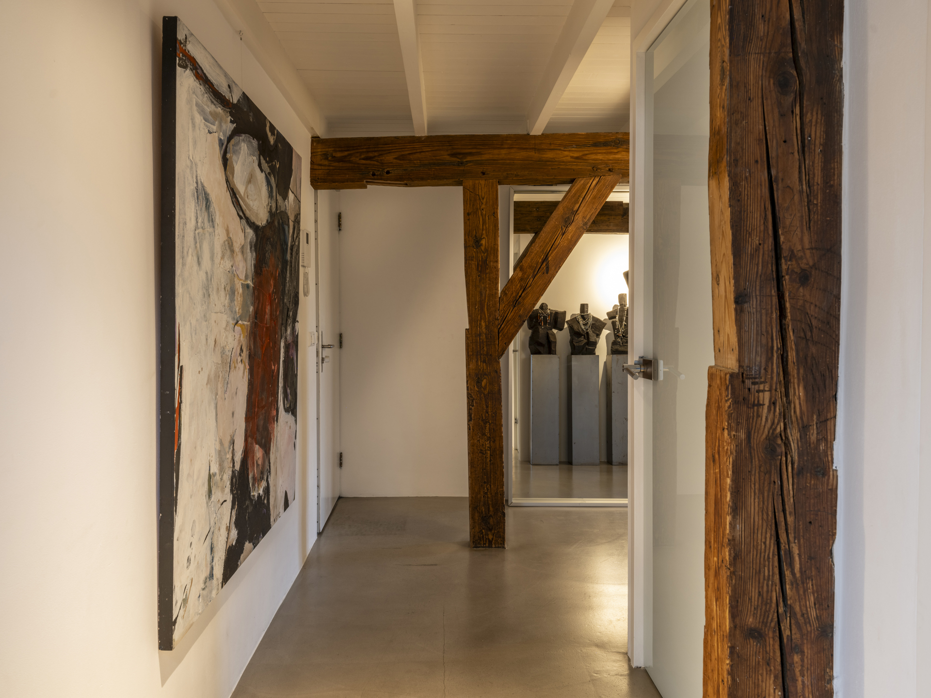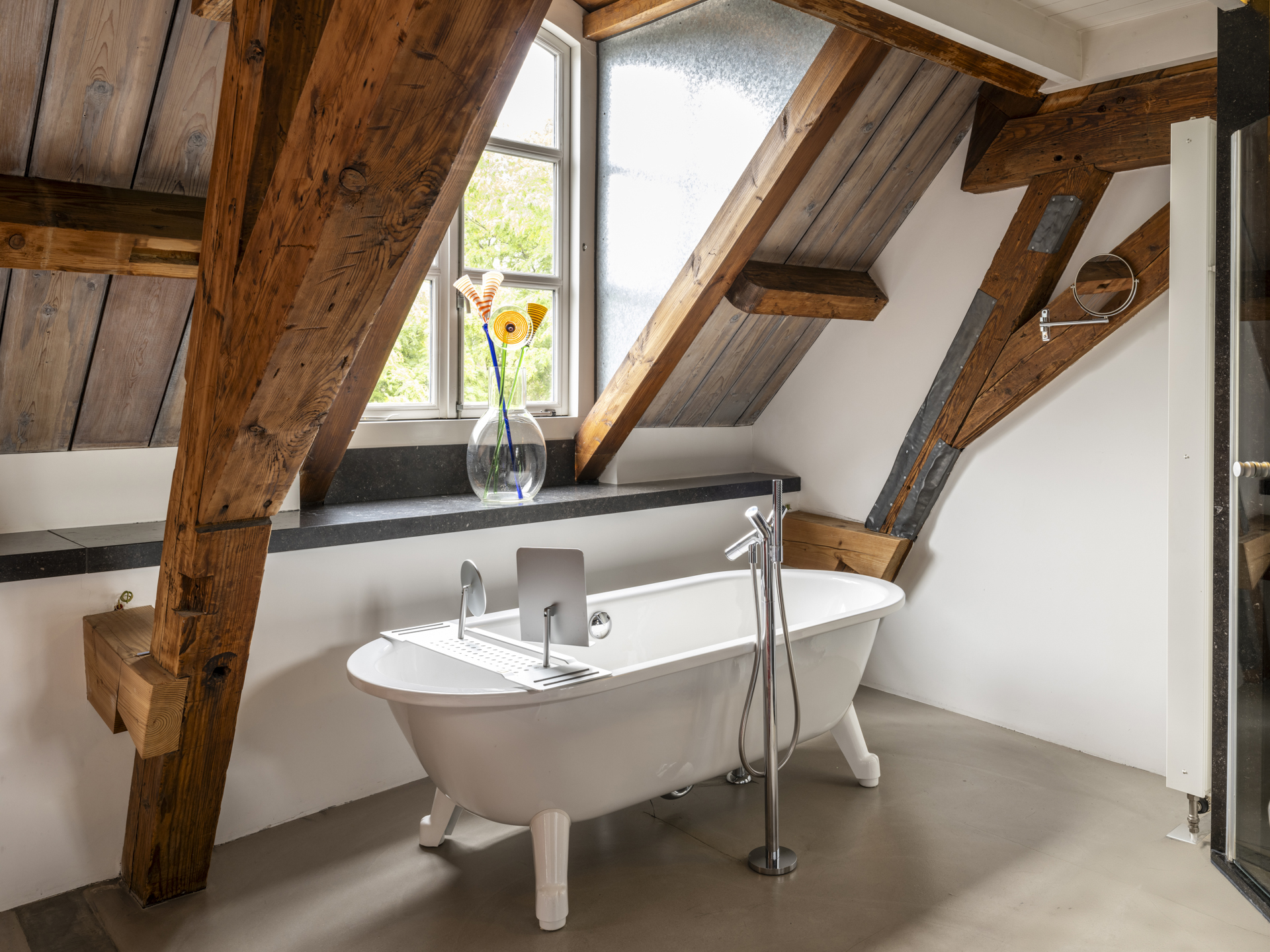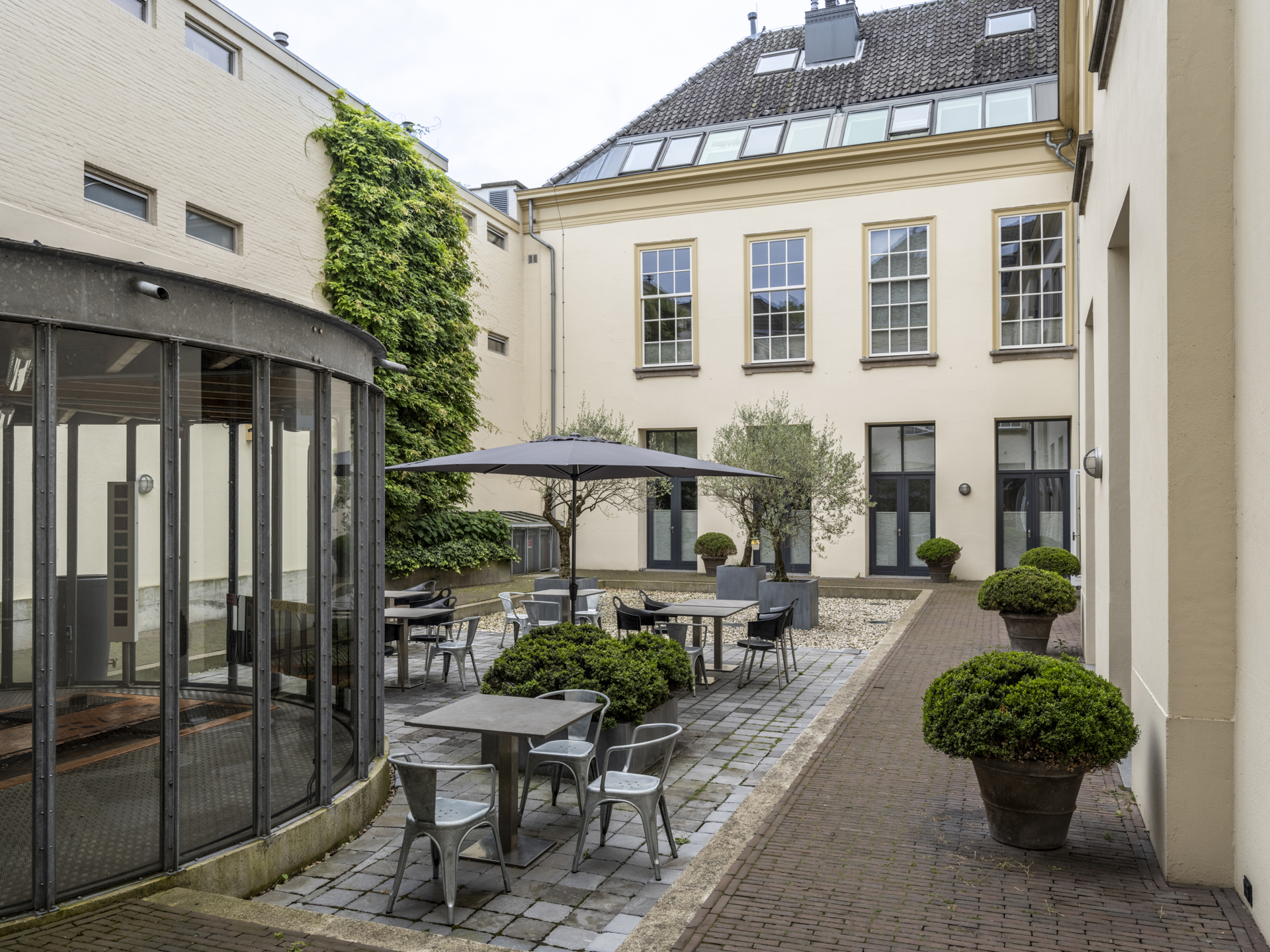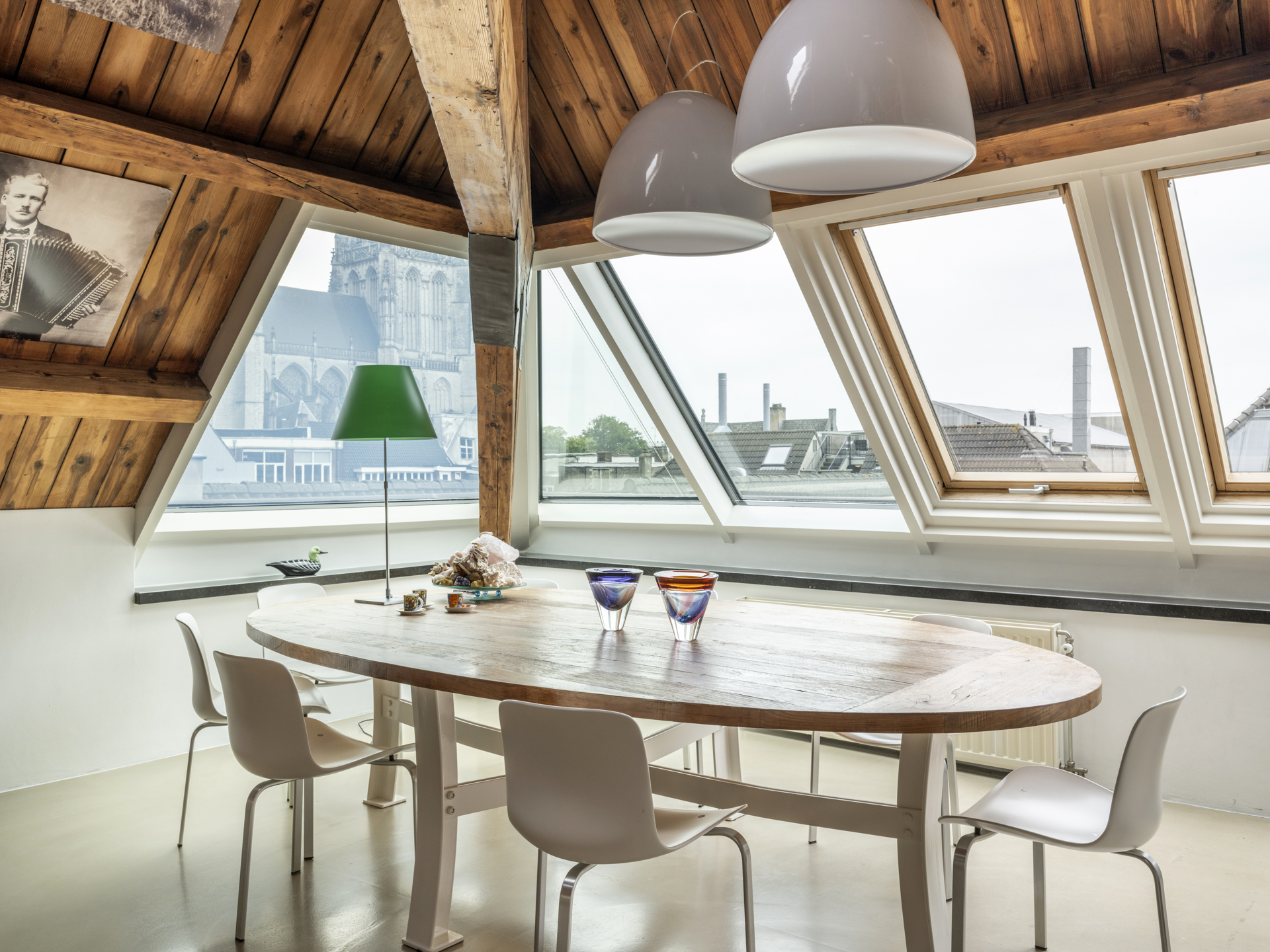 El salón, de generosas dimensiones, se extiende a lo largo de 60 m² con una pared de cristal de suelo a techo que revela la Grote Kerk de Breda. La cocina abierta, equipada con una amplia cocina de gas, extractor de acero inoxidable e isla, ofrece vistas al Kasteelplein y Valkenberg. El dormitorio principal, de aproximadamente 55 m², cuenta con acceso a dos vestidores situados bajo vigas de madera originales. El baño dispone de bañera exenta, ducha revestida de piedra natural y doble lavabo.