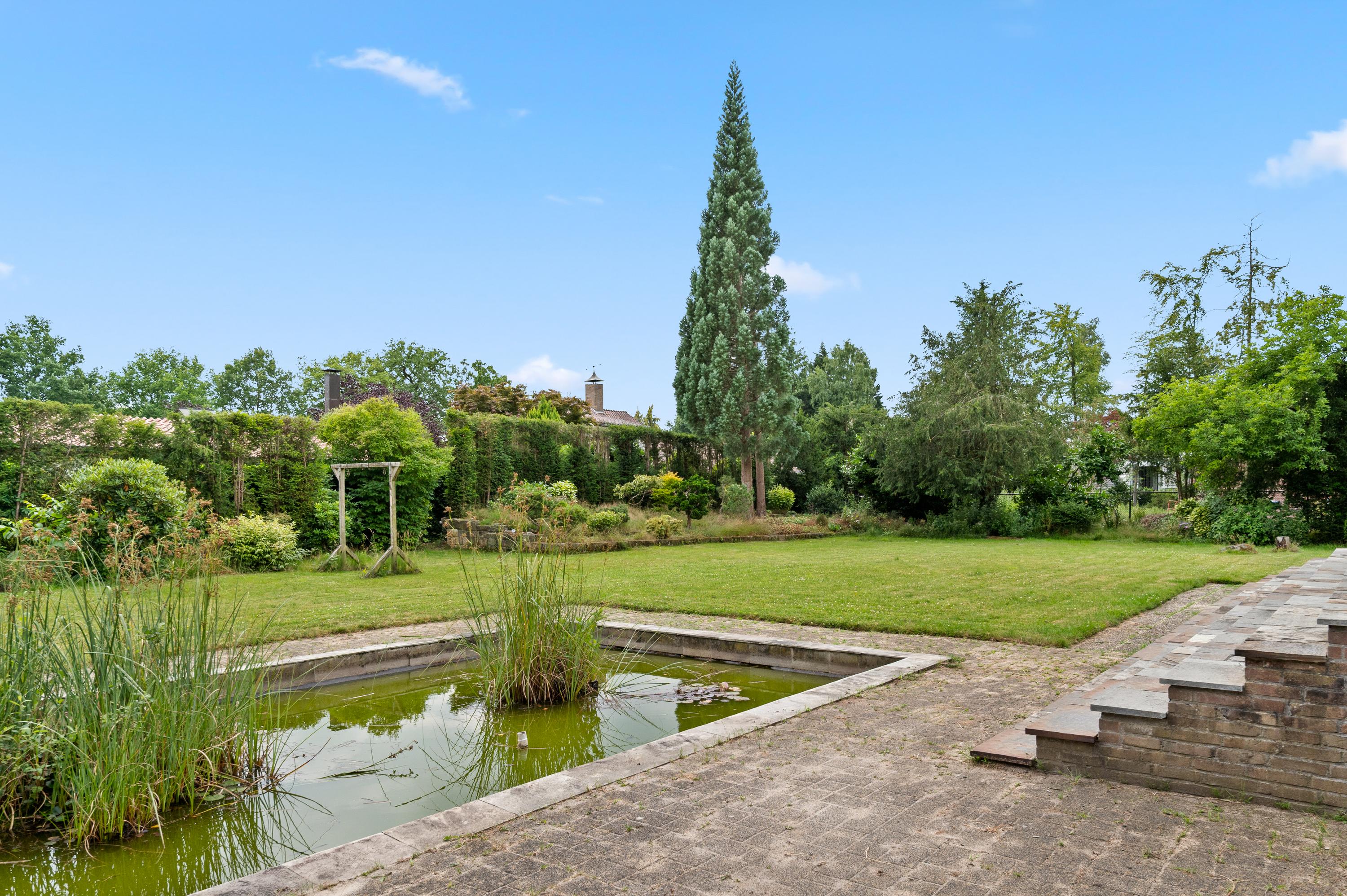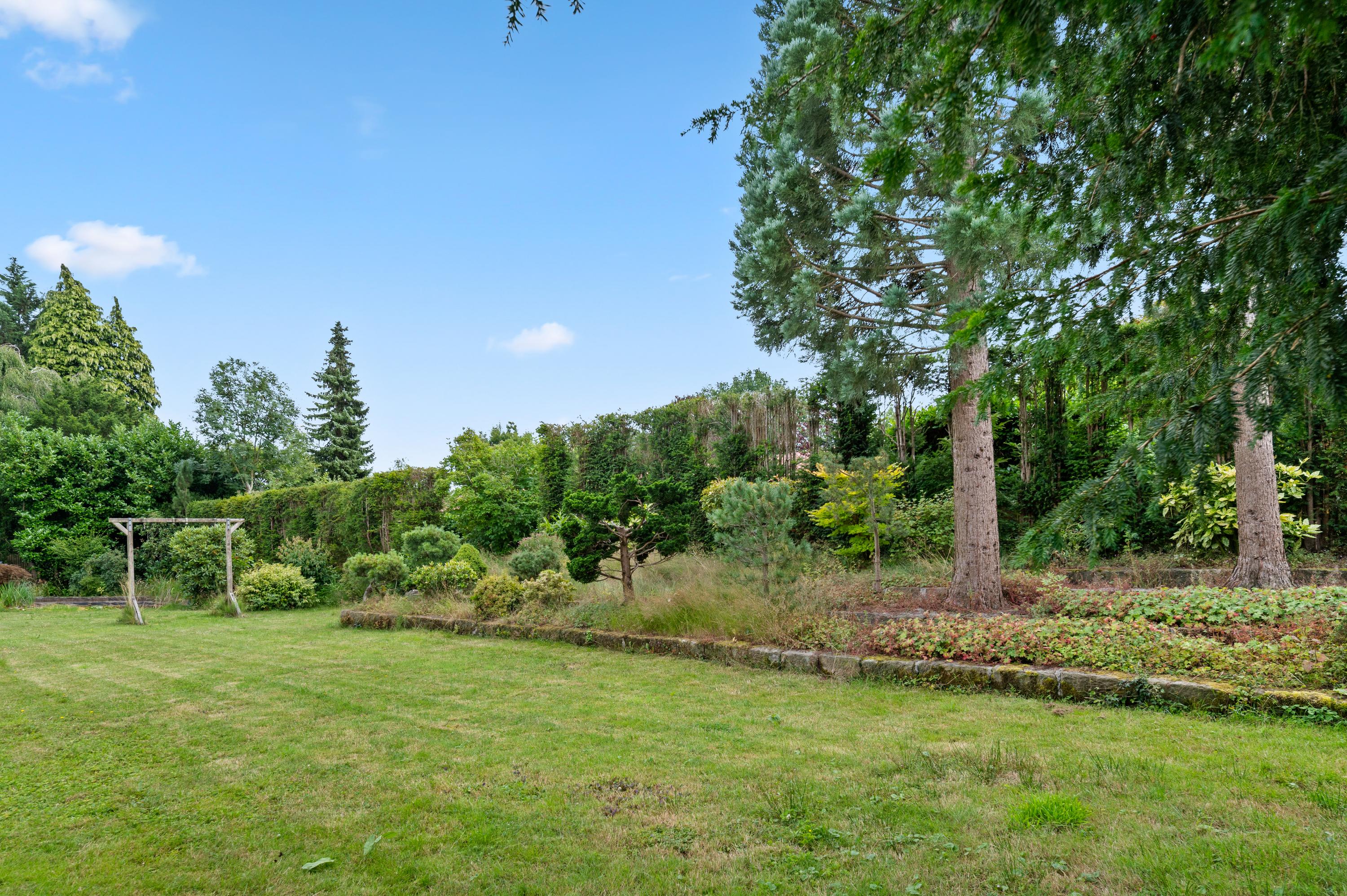 Una amplia zona de estar y comedor en forma de L integra una chimenea con repisa clásica, comunicándose con una cocina totalmente equipada. Las suites de los dormitorios conectan directamente con un jardín cuidadosamente diseñado, donde una terraza cubierta y un estanque invitan a la calma. El sótano alberga habitaciones, un baño, bodega y lavandería, mientras que el espacioso garaje se accede desde la parte trasera. Las estancias de la planta superior ofrecen potencial para dormitorios adicionales o espacios de retiro personalizados.