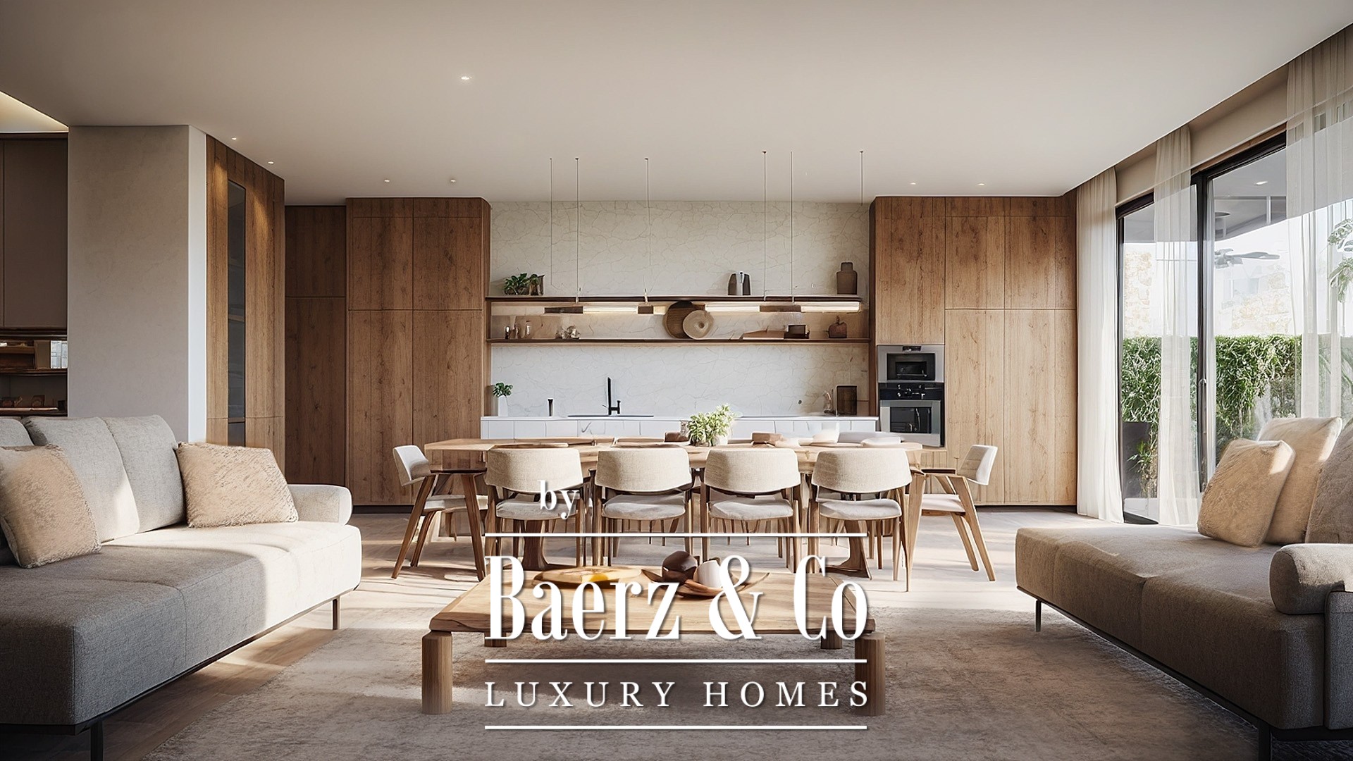 The main floor opens onto the garden through a large living-dining room with an integrated designer kitchen, fully equipped and connected to the outside area. Large full-height windows allow a perfect fusion between interior and exterior, giving way to the covered porch, the private pool and the chill-out area. On this level there is also a guest bedroom with its own bathroom and a guest toilet.