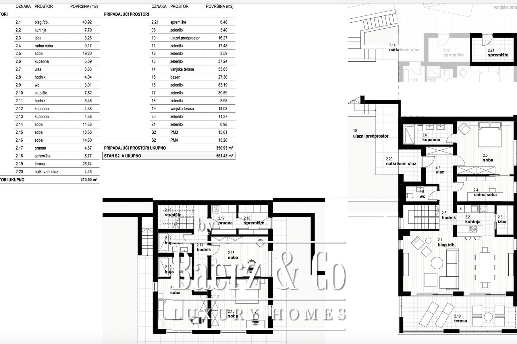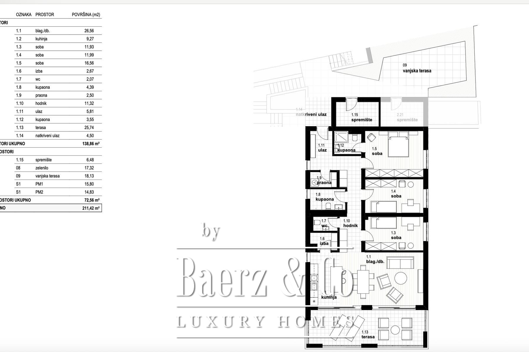 Cada dormitorio cuenta con proporciones refinadas, desde 9,17 m² hasta 19,20 m², y se complementa con estancias funcionales como vestidor, cuarto de lavado, despensa y espacio de almacenamiento independiente. Tres baños completos y un aseo de cortesía aseguran el confort de la familia y las visitas. En el exterior, una terraza cubierta de 25,74 m² y otras dos terrazas adicionales se abren al jardín ajardinado con piscina privada, invitando al descanso y al disfrute de las serenas vistas sobre la resplandeciente costa de Kvarner.