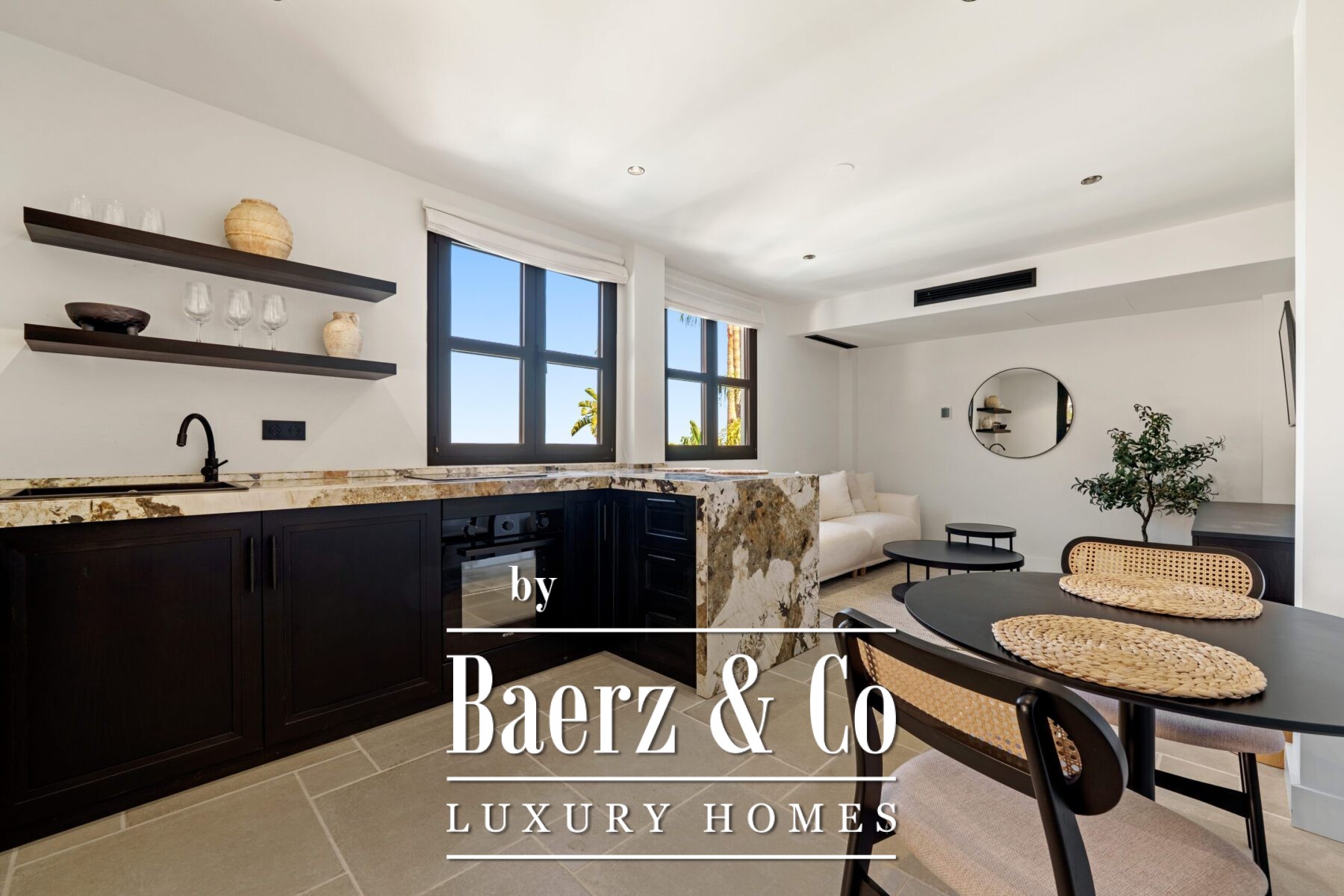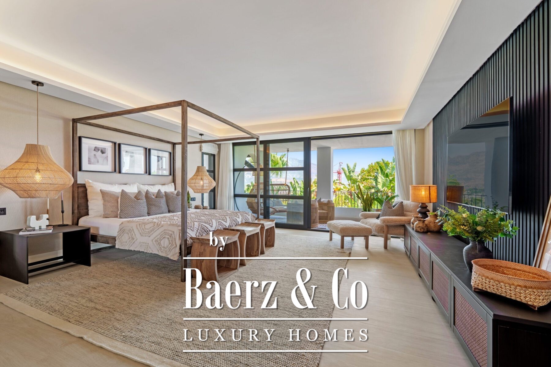 Las seis habitaciones y siete baños, cuidadosamente diseñados, destacan por sus acabados personalizados y texturas naturales. Las áreas de estar de planta abierta se conectan sin esfuerzo con terrazas inundadas de sol, mientras grandes ventanales ofrecen vistas al mar Mediterráneo y a la montaña de La Concha en cada espacio común. Paletas neutras e iluminación artesanal crean un ambiente de sofisticación tranquila, realzado por suelos elegantes y estanterías hechas a mano.