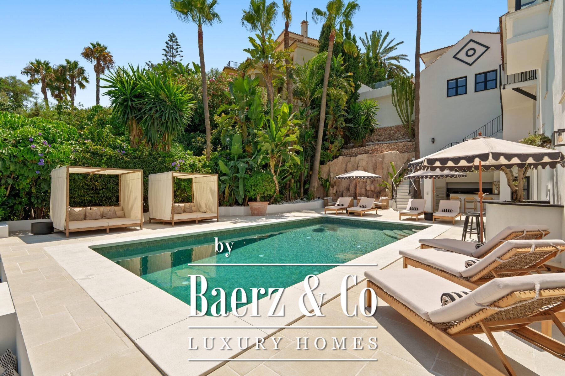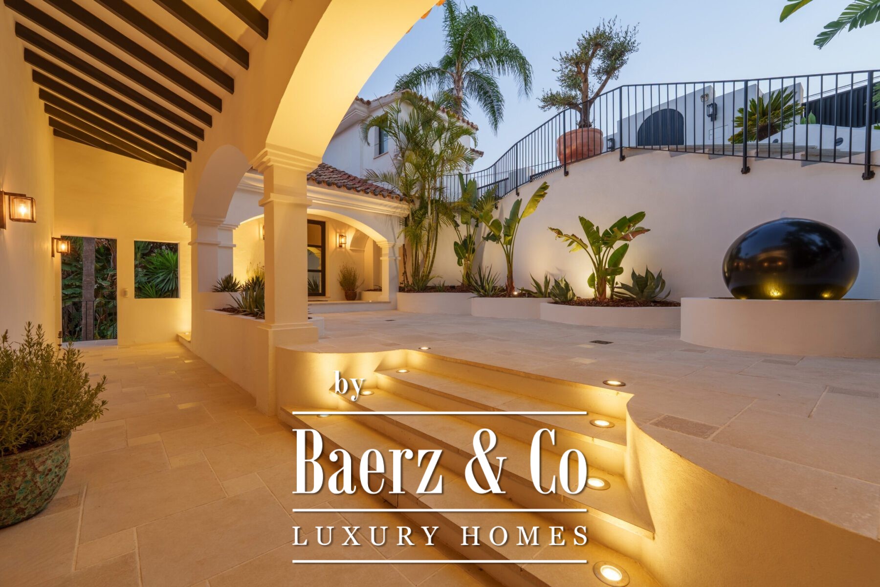 En el exterior, jardines paisajísticos rodean una piscina privada y un salón hundido, realzados con iluminación ambiental y zonas sombreadas ideales para el relax o eventos sociales. Un garaje para varios vehículos, sistemas de seguridad y la cercanía a campos de golf, la playa, Puerto Banús y los principales servicios de Marbella completan la propiedad.