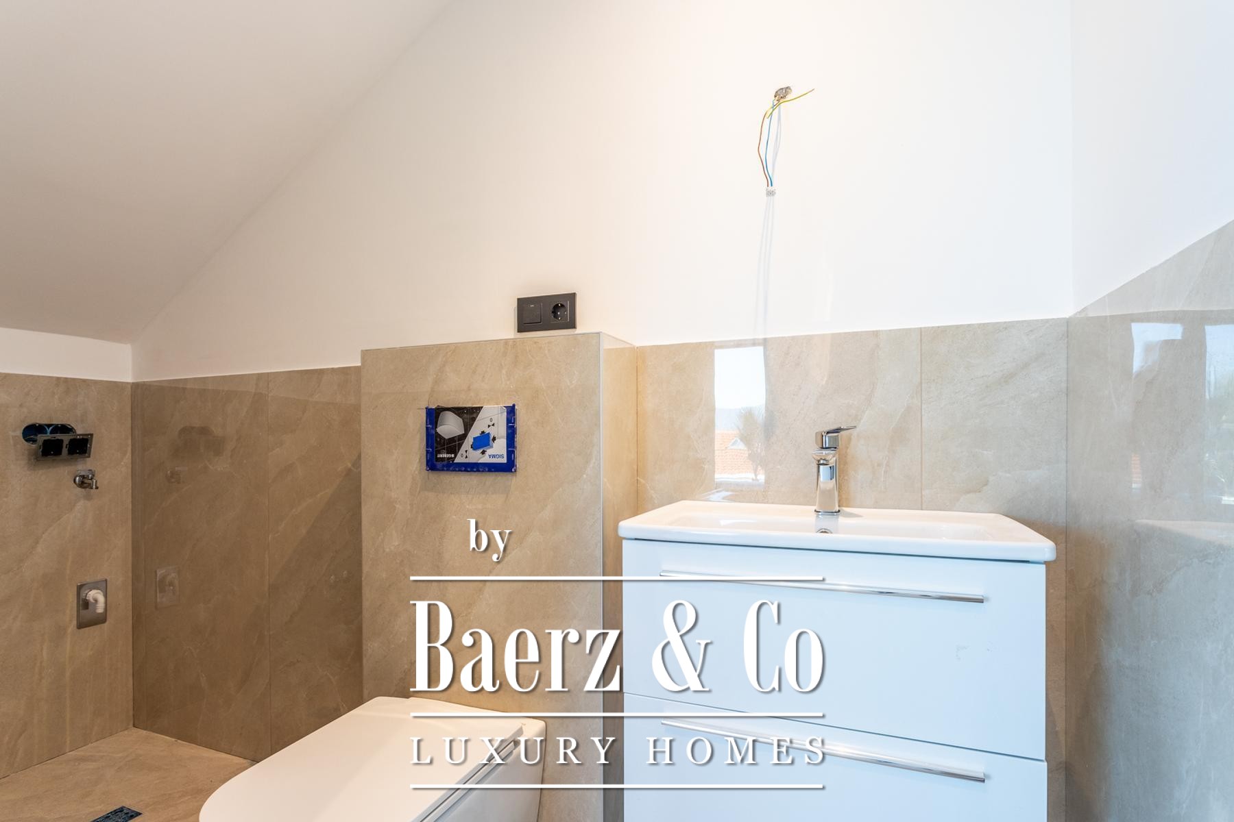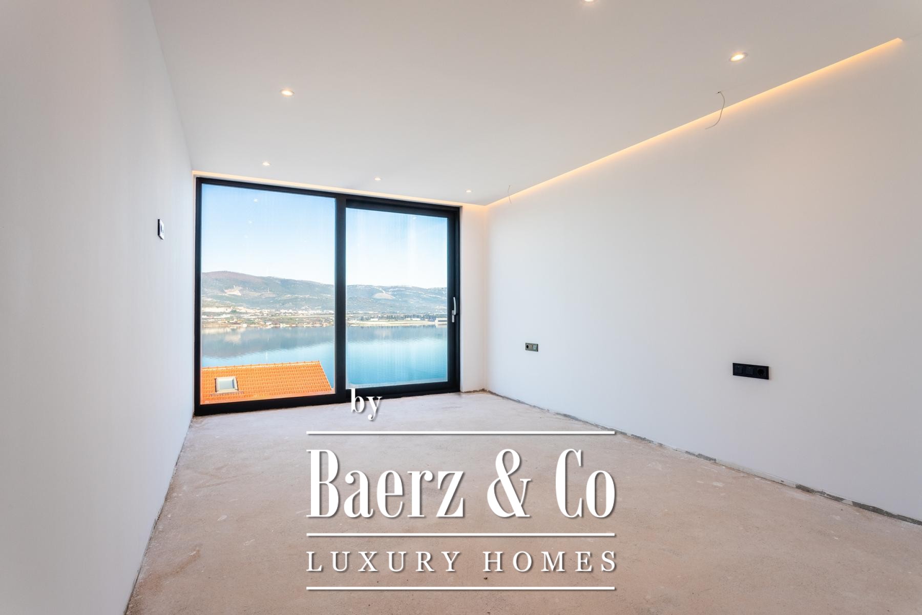 Un vestíbulo, aseo para invitados con zona de lavandería y una sala flexible—ideal como oficina, gimnasio o sala de juegos—completan la cuidada distribución de la planta principal. En la planta superior, tres dormitorios cuentan cada uno con baño privado y grandes ventanales, ofreciendo vistas panorámicas al Adriático en todo momento.