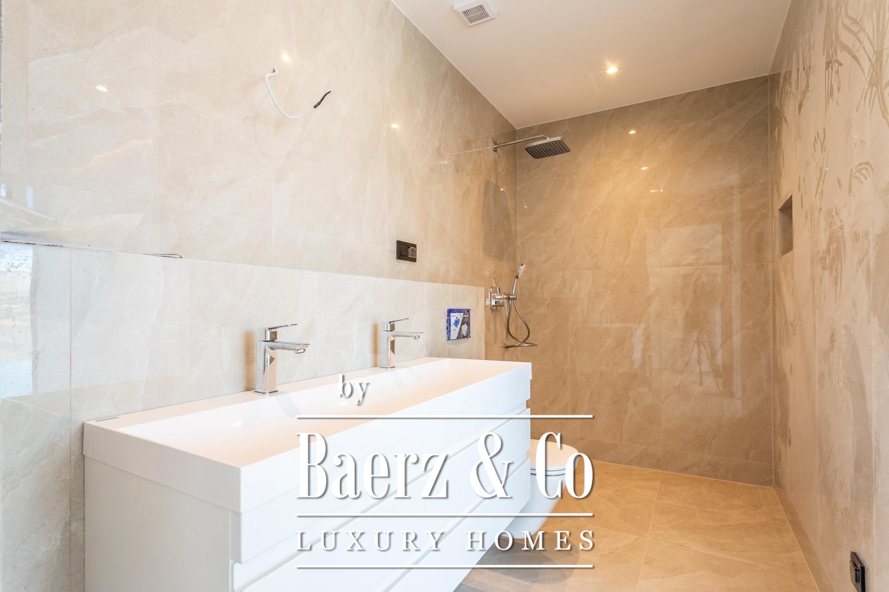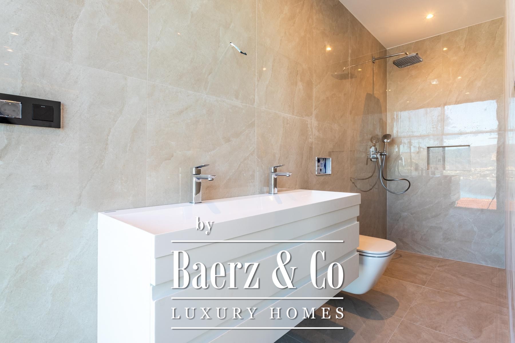 La villa le recibe con un garaje subterráneo para dos vehículos, comunicado de manera discreta con una sala técnica. La planta baja está dedicada a una distribución de planta abierta, donde la cocina, el comedor y la sala de estar se despliegan frente a fachadas acristaladas de suelo a techo. La luz natural inunda cada rincón, con acceso directo a una terraza ajardinada y una piscina climatizada.
