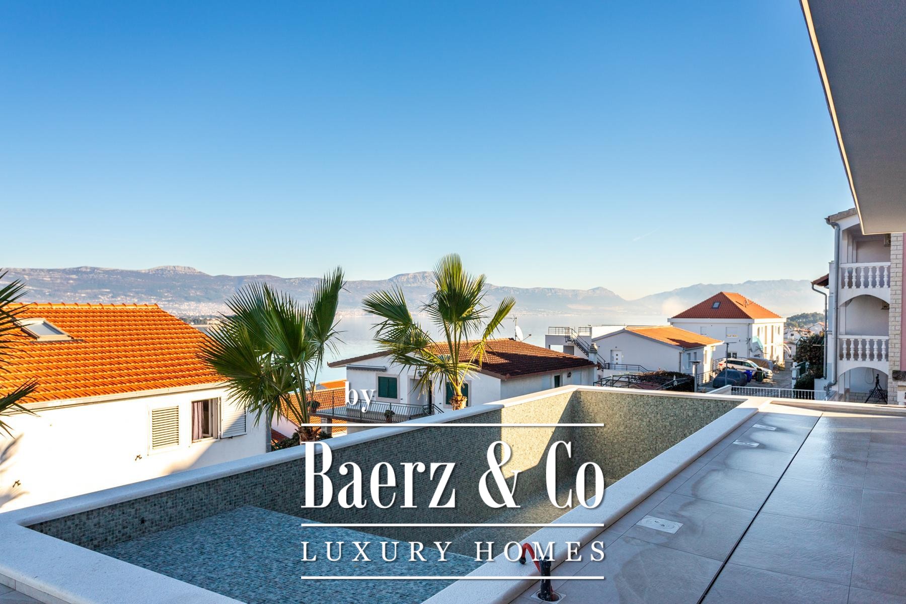 Villa Trogir Okolica ofrece una vista al mar sin obstáculos desde su posición elevada en Mastrinka, Čiovo, Croacia. Esta villa de nueva construcción cuenta con 278 m² de superficie habitable distribuidos en tres niveles, donde cada detalle refleja un diseño intencionado.