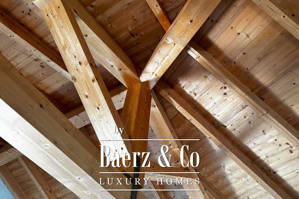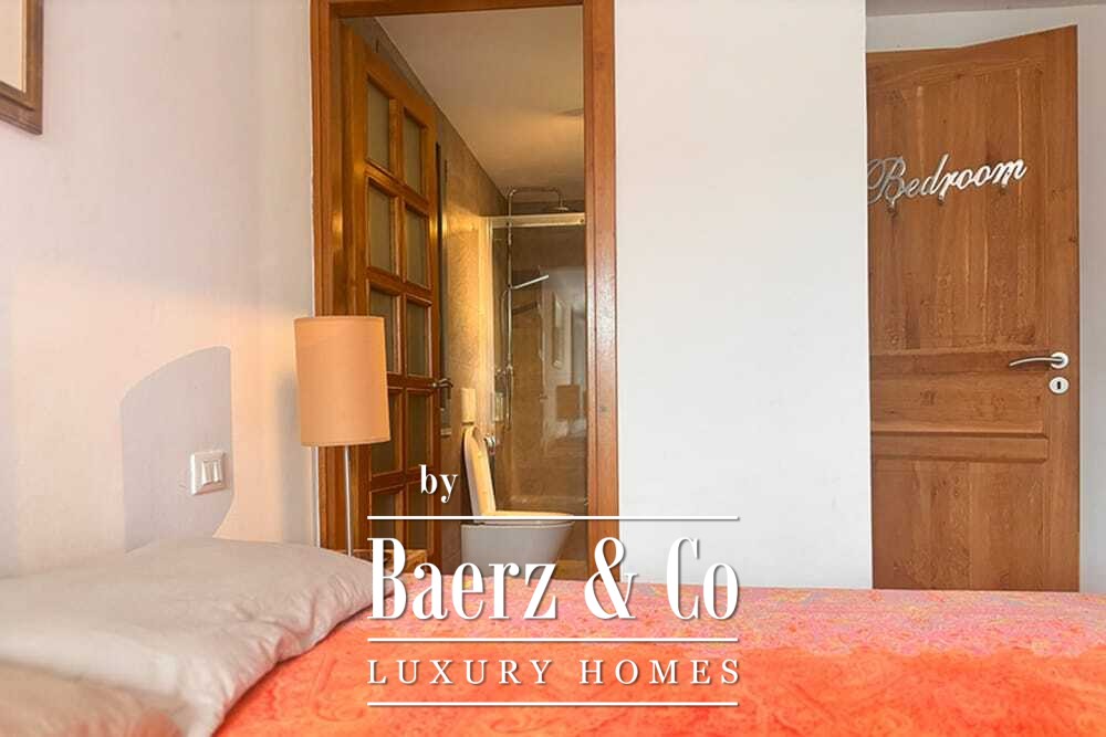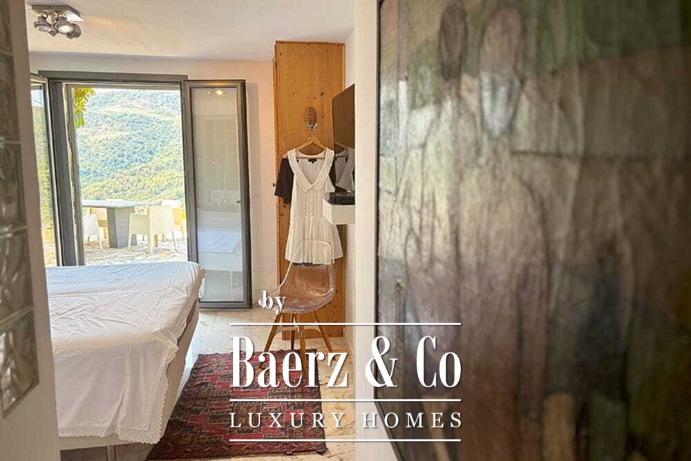Répartie sur deux niveaux, la villa propose quatre chambres et quatre salles de bains. Trois chambres en rez-de-chaussée, toutes dotées de portes-fenêtres, s’ouvrent sur une terrasse inférieure avec vue sur les montagnes. La suite parentale dispose d’une grande baignoire, d’une douche séparée, de deux vasques en marbre et d’équipements de créateur, créant une véritable sensation de quiétude. La chambre studio, accessible par une entrée privée, offre une flexibilité supplémentaire pour recevoir ou travailler. À l’étage, un salon à poutres apparentes avec cheminée rejoint une cuisine en noyer et acier inoxydable équipée d’appareils Miele haut de gamme. De grandes portes vitrées mènent à un salon avec une seconde cheminée et un accès aux terrasses, élégamment aménagées avec des tables en granit et des chaises Philippe Starck.