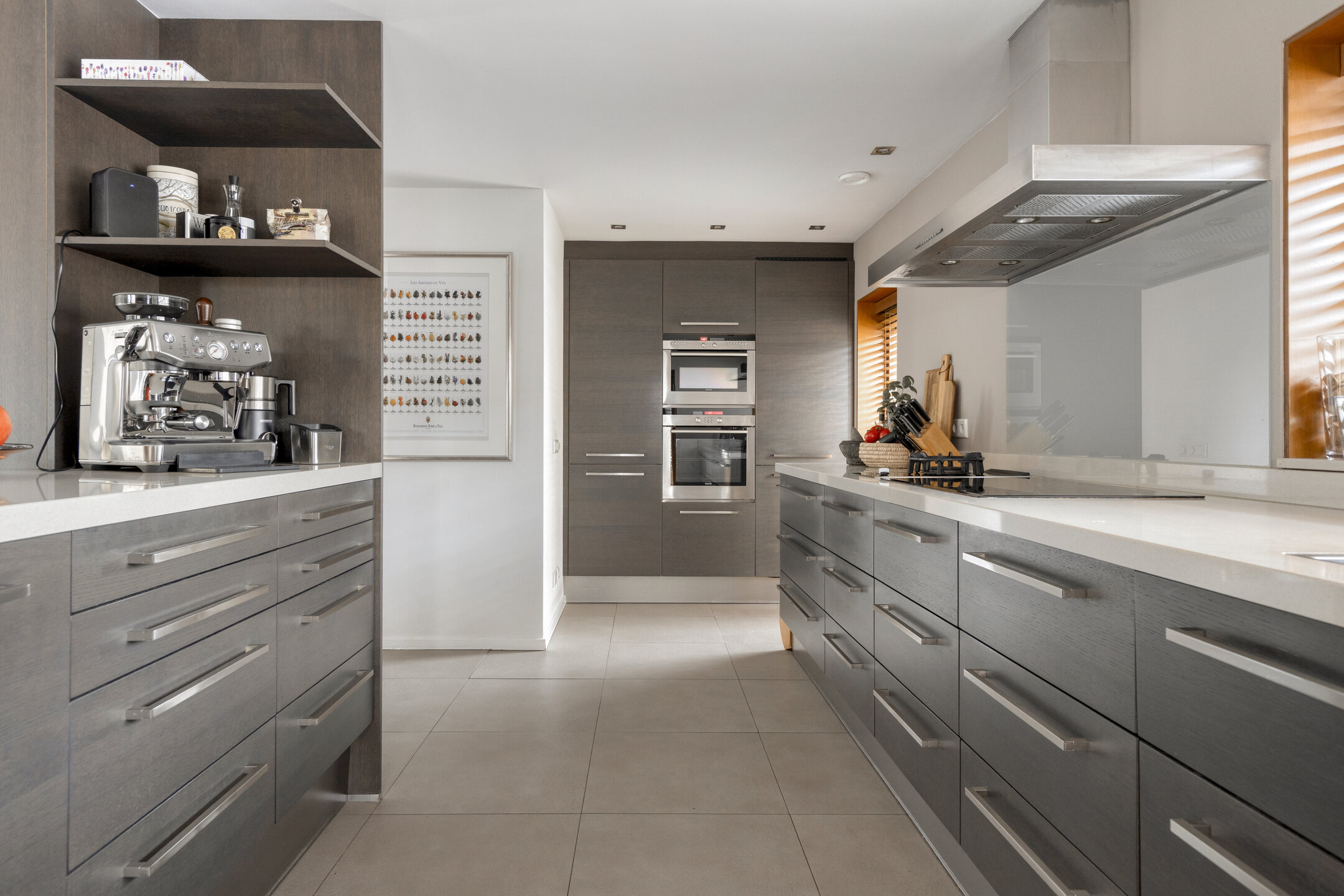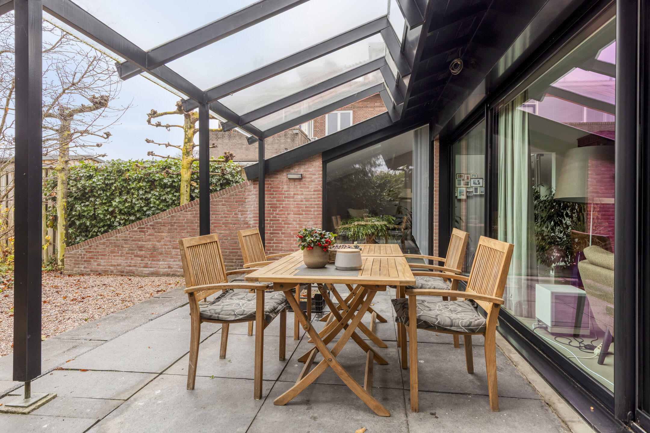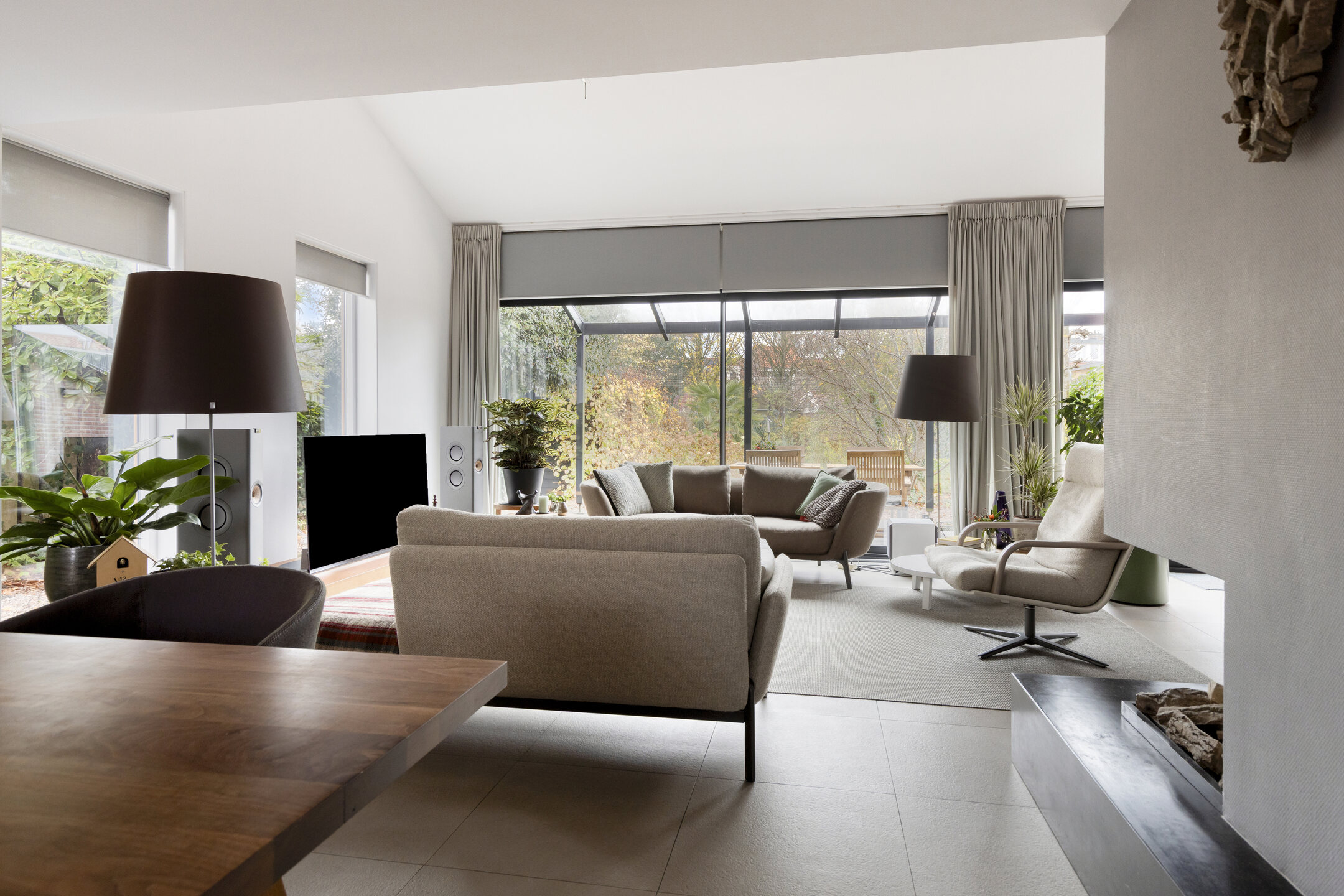 Dès l’entrée latérale vitrée, une sensation de clarté et d’ouverture envahit la cuisine contemporaine, entièrement équipée avec une plaque à induction, un brûleur wok à gaz et des appareils haut de gamme. L’agencement ouvert se prolonge vers le séjour, où de larges baies coulissantes, des plafonds hauts et une cheminée centrale distillent luminosité et quiétude. À l’arrière, la véranda vitrée prolonge la saison et offre une connexion visuelle avec le jardin de plus de 30 mètres de profondeur, orienté ouest-nord-ouest, foisonnant de verdure locale et de faune.