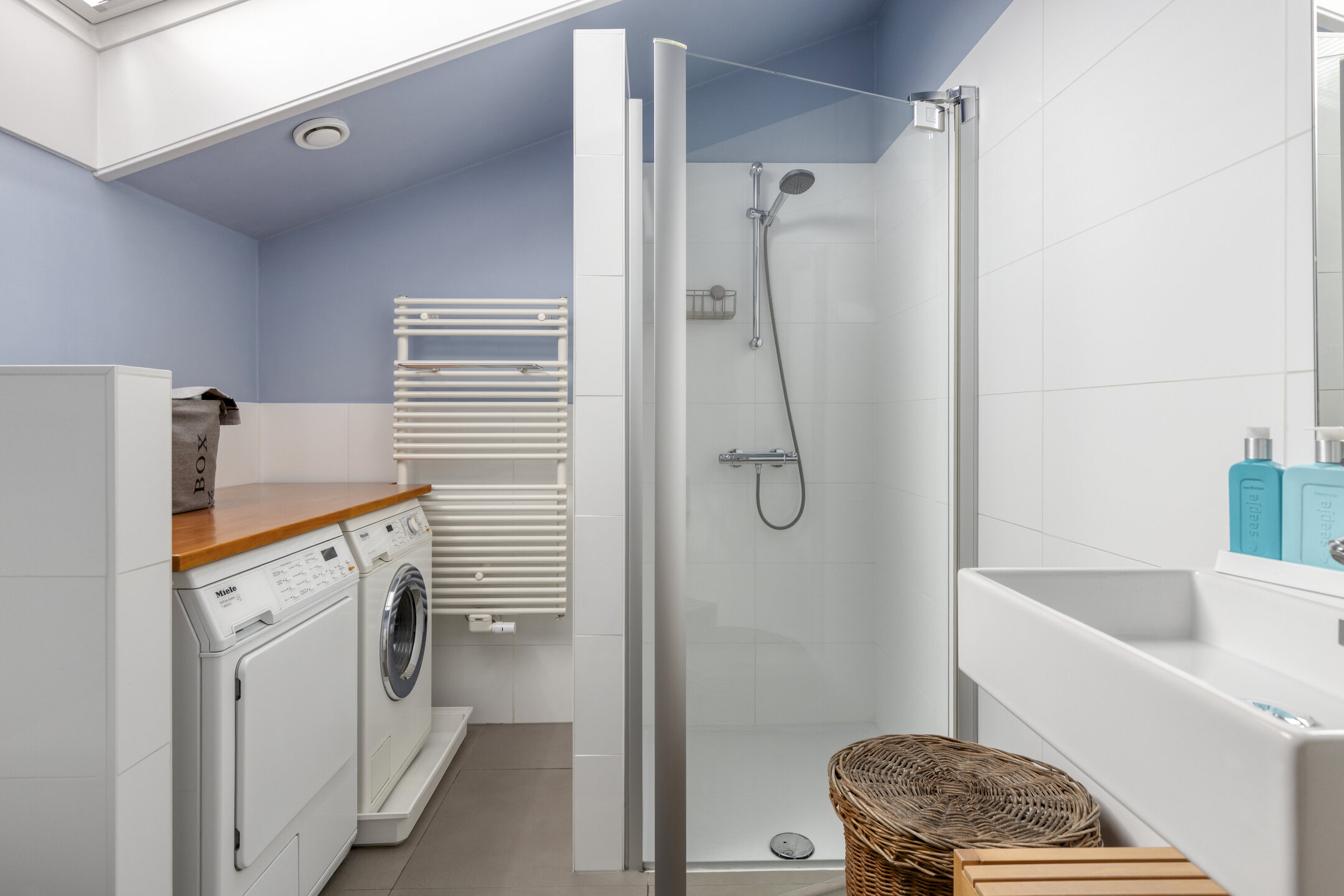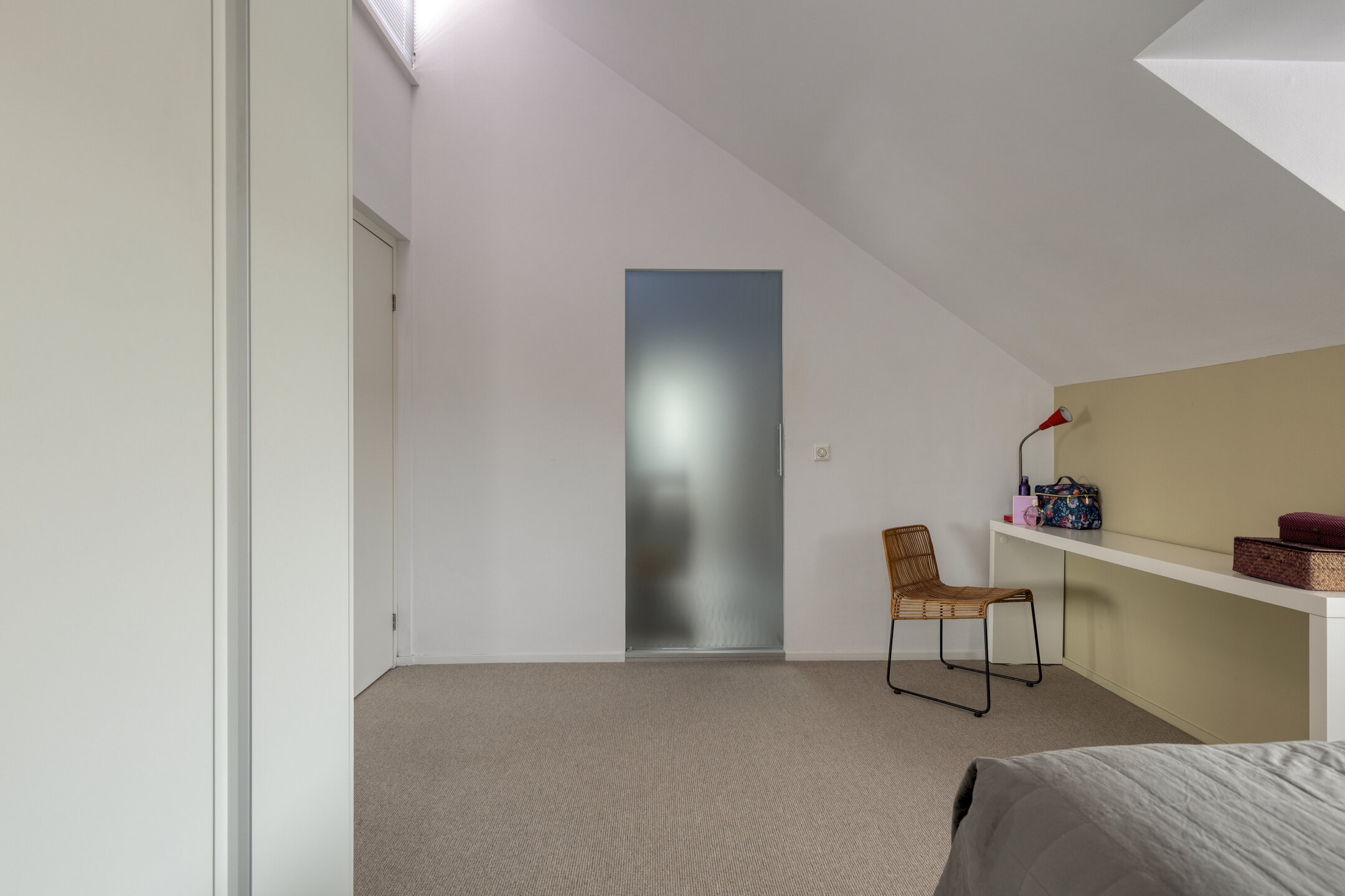 À l’étage, la suite parentale dispose d’une salle de bains attenante avec baignoire et douche à l’italienne, tandis que les chambres secondaires conservent cette impression d’espace et de lumière. Les prestations techniques — ventilation mécanique, chauffage par le sol, connexion fibre optique — témoignent d’une modernisation aboutie et d’un entretien exemplaire.