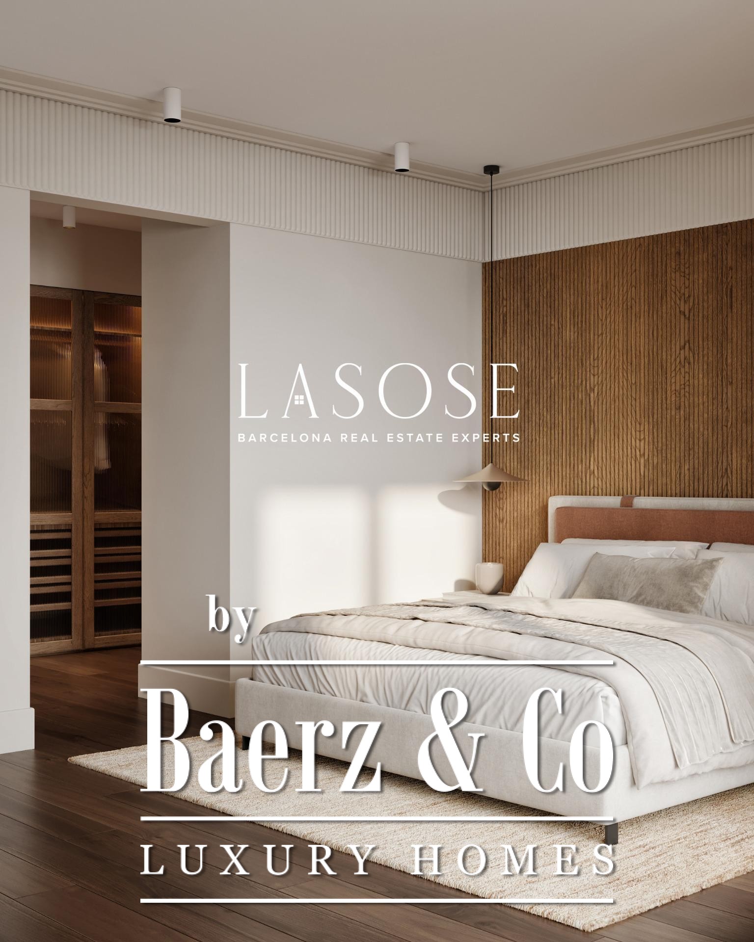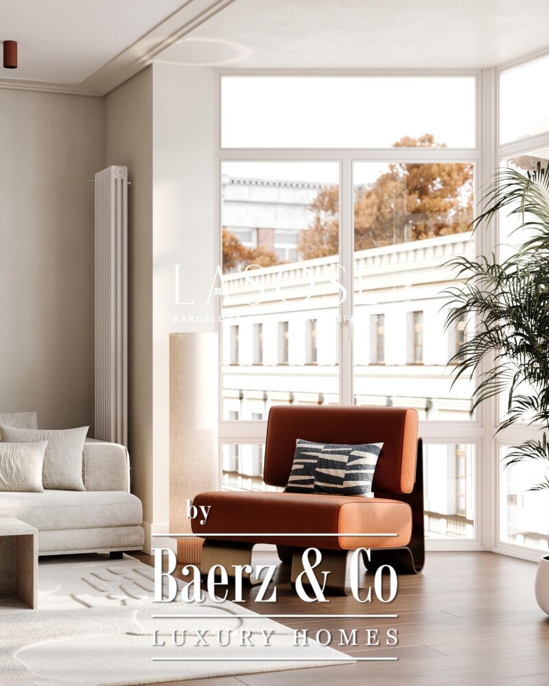 Apartment Barcelona komt volledig tot uiting in deze 226 m² grote residentie op de zevende verdieping aan de Aribau-straat, momenteel in volledige renovatie en naar verwachting opgeleverd in juli 2025. Deze woning biedt een zeldzame balans tussen ruimte en privacy en beschikt over vier slaapkamers, waaronder twee royale suites van 16 m² met eigen badkamer en inbouwkasten, en twee binnenkamers van elk 9 m². Een van de hoofdslaapkamers opent naar een balkon met gedeeltelijk uitzicht op zee en de Sagrada Familia, badend in het zachte ochtendlicht.