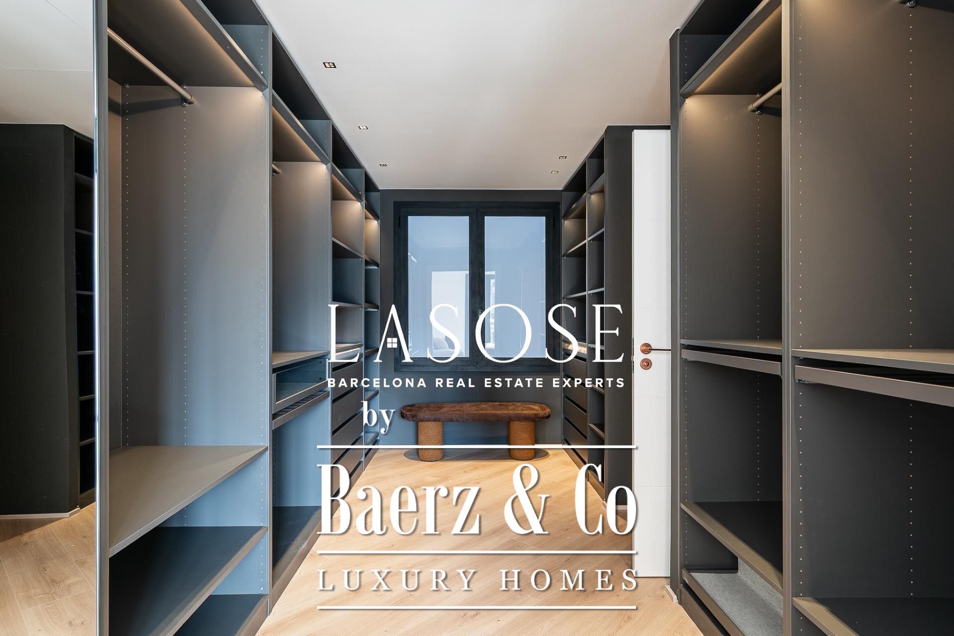 Het appartement is volledig gerenoveerd met hoogwaardige materialen. Dankzij de royale, zuidoostgerichte ramen baadt het interieur in het licht en vormt de open woonkamer met eetgedeelte van 90 m² een uitnodigende leefruimte. Vanuit hier geven deuren toegang tot een panoramisch hoekterras met uitzicht over de met bomen omzoomde boulevards en Plaça Mossèn Jacint Verdaguer. De keuken, van Santos en voorzien van Bosch-apparatuur, is ingericht rond een sociaal kookeiland met geïntegreerde wijnkast en koffienis; aangrenzend bevindt zich een bijkeuken voor discrete opslag.