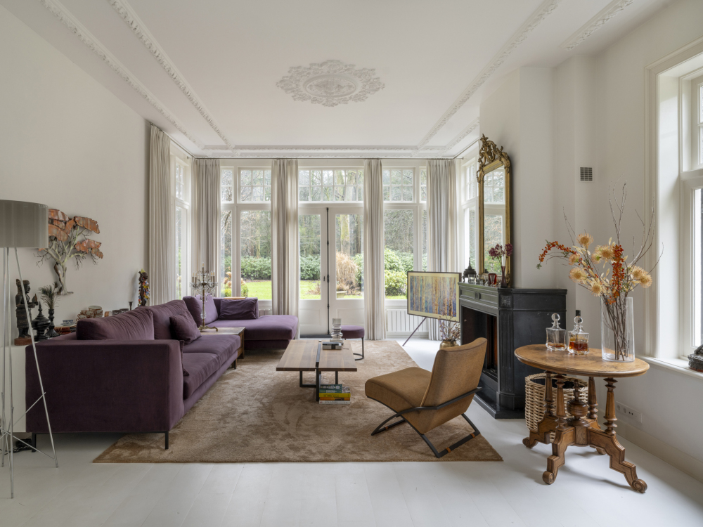 De achterkamer/tuinkamer heeft een erker met openslaande tuindeuren. De erker ligt vrijwel op het zuiden en geeft een prachtige lichtinval en bovenal een subliem contact met de tuin en het rondom gelegen bos. In deze kamer is, naast de centrale verwarming, een houtgestookte inzethaard met marmeren schouw aanwezig.