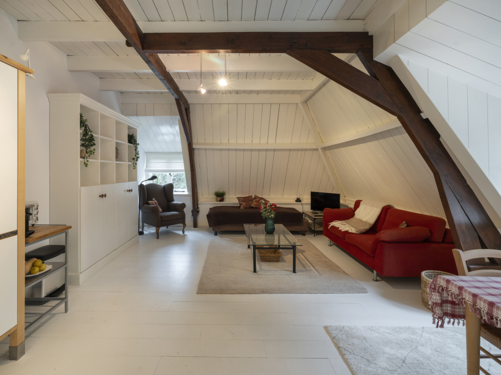Grote slaapkamer/studio aan de voorzijde van de woning. Aan de voor- en zijkant zorgen dakkapellen voor lichtinval. De prachtige kapconstructie is in het zicht gebleven. In de kamer zijn water-/afvoer- en elektravoorzieningen voor een kitchenette aanwezig.