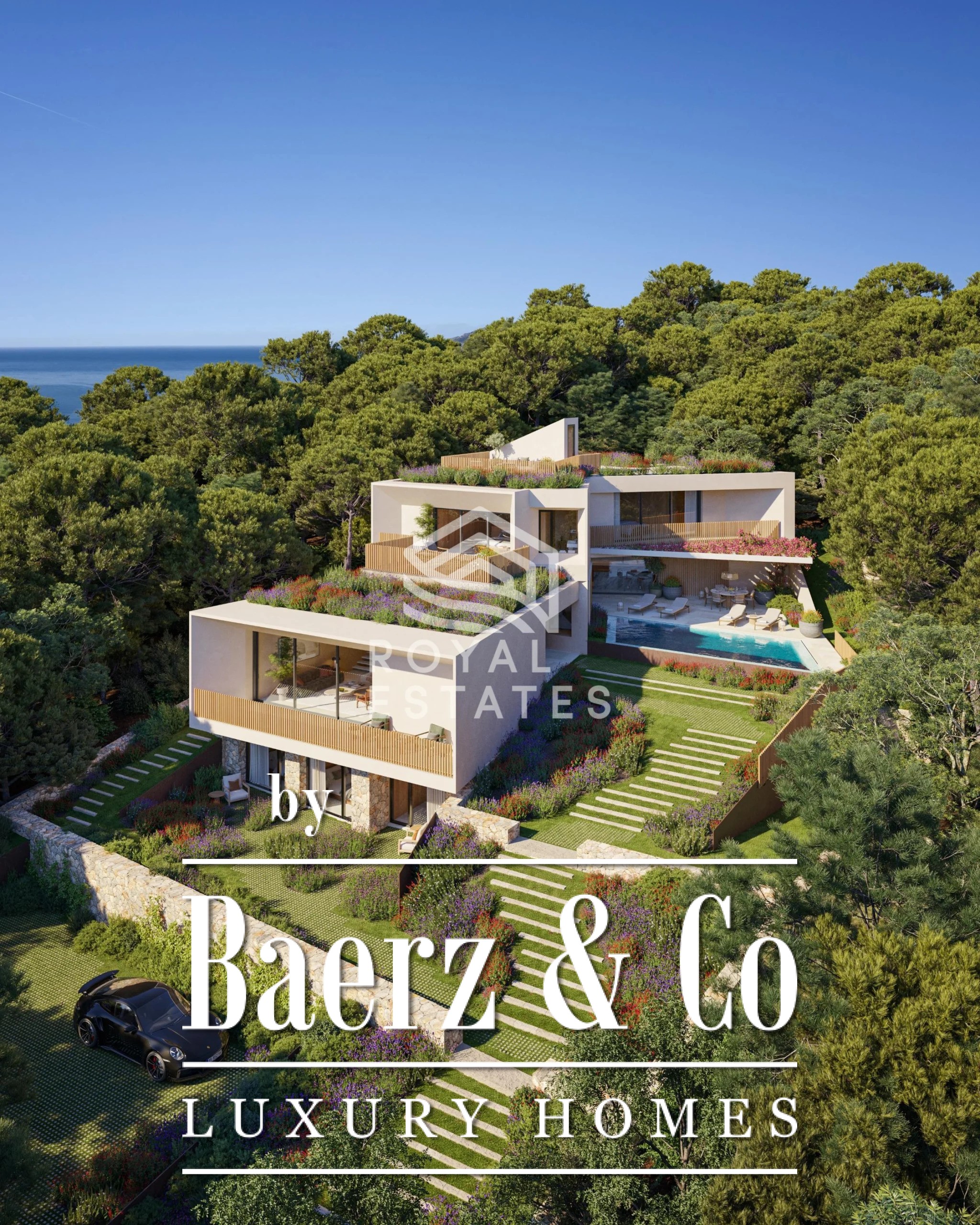 Op de bovenverdieping versterken drie slaapkamers met eigen badkamer—including de master suite met vergezichten—het gevoel van privacy en rust. Twee extra slaapkamers en een multifunctionele ruimte bevinden zich beneden en bieden flexibiliteit voor gezinnen of een afzonderlijk toevluchtsoord. Houten pergola’s en balustrades zorgen voor een gefilterde overgang tussen binnen en buiten, verzachten de ervaring en verbinden het huis met het bosrijke landschap.