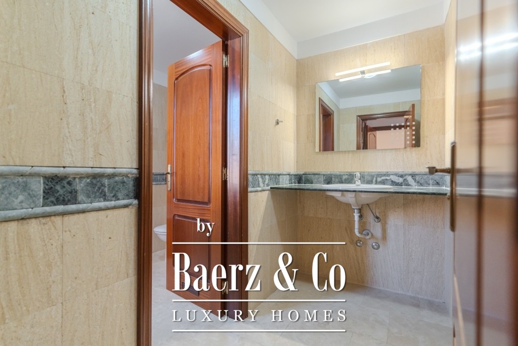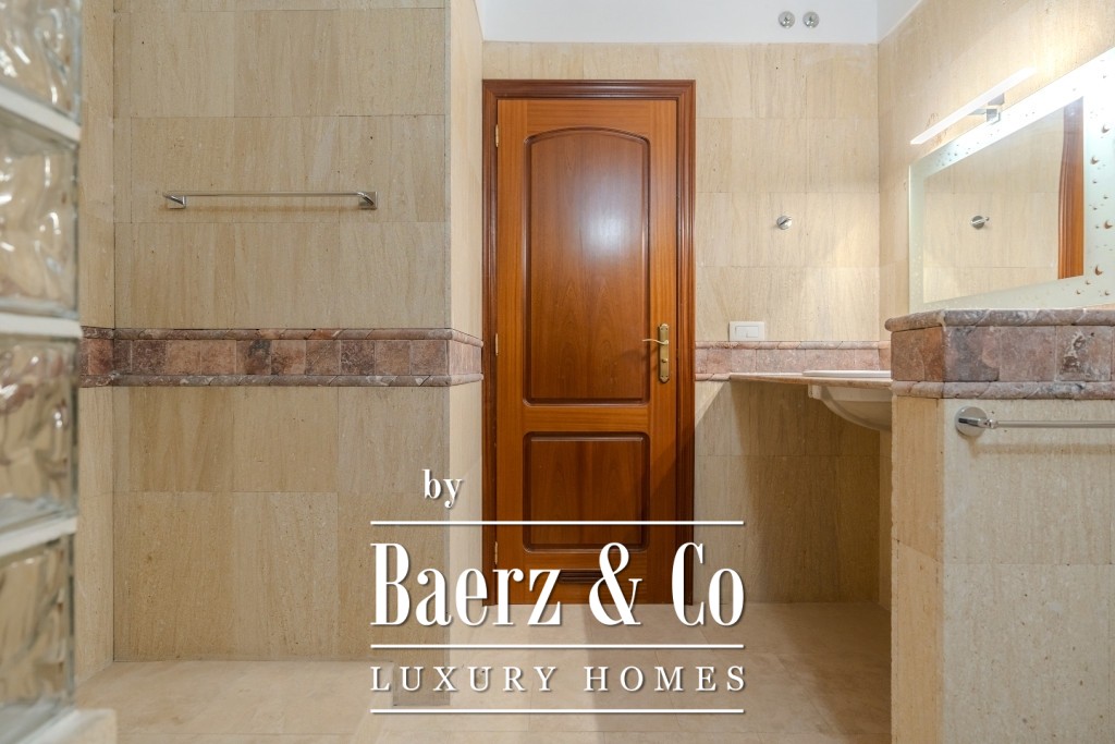 Op de eerste verdieping bevinden zich nog 2 slaapkamers, beide met inbouwkasten, 2 badkamers, waarvan één en-suite, en meer inbouwkasten op de gang. De hoofdslaapkamer geeft toegang tot een terras met uitzicht op het park en een glimp van de zee. De andere slaapkamer heeft een klein balkon en kijkt eveneens uit op het park.