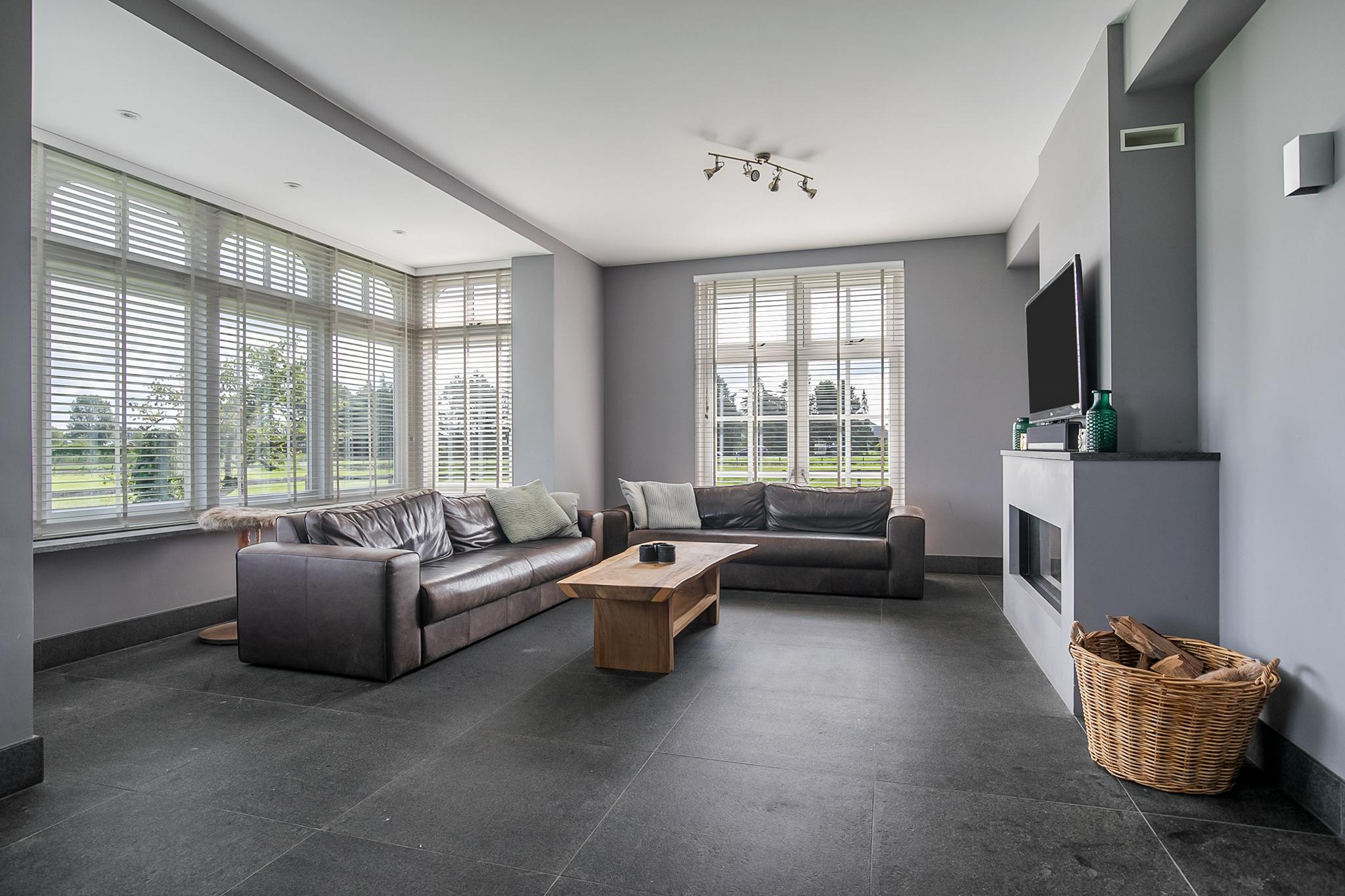 De overdekte entree met een dubbele openslaande voordeur, geeft deze villa een fraaie uitstraling. De ruime ontvangsthal met imposante houten trap biedt toegang tot de woonkamer en de 1e verdieping. De hal is voorzien van een natuurstenen tegelvloer, stucwerk wanden en een stucwerk plafond. De royale leefkeuken met eetkamergedeelte is voorzien van een natuurstenen tegelvloer, stucwerk wanden en een stucwerk plafond met inbouwverlichting. De keuken beschikt over een inrichting in een wandopstelling met apparatenwand en een kook- en spoeleiland. De apparatenwand is verder uitgerust met een oven, koffiezetapparaat, een stoomoven en een koelkast. Het eiland beschikt over een 5-pits gaskookplaat met ingebouwde afzuigkap in het plafond, een spoelbak en een vaatwasser. Diverse kastjes en lades zorgen voor veel opbergruimte. Een grote erker/uitbouw met openslaande deuren zorgen voor toegang naar de tuin. De vele raampartijen zorgen voor veel natuurlijke lichtinval. Een haard zorgt voor extra sfeer en warmte in de ruimte. Vanuit de woonkamer is er een fraai uitzicht op de paardenweides. En ook hier zorgen grote raampartijen en dubbele openslaande deuren voor een zee van licht. Daarnaast is er een prachtige, grote schouw aanwezig met een gashaard welke zorgt voor nog extra sfeer en warmte in de ruimte. Schuifdeuren zorgen dat de woonkamer afgesloten kan worden van de keuken/eetgedeelte. Halfronde openslaande deuren in de zijgevel van de woning zorgen voor toegang tot het voorhuis. De ruime entreehal biedt toegang tot de bijkeuken/wasruimte, woonkamer, toiletruimte en de meterkast. De bijkeuken/wasruimte is uitgerust met een gootsteen. Tevens zijn hier de aansluitingen voor de wasapparatuur gesitueerd. Vanuit hier is er toegang tot de kantoor/werkkamer. De kantoorruimte is een fijne ruimte welke uiteraard voor diverse doeleinden geschikt is, zoals bijvoorbeeld een speelkamer of chillroom.