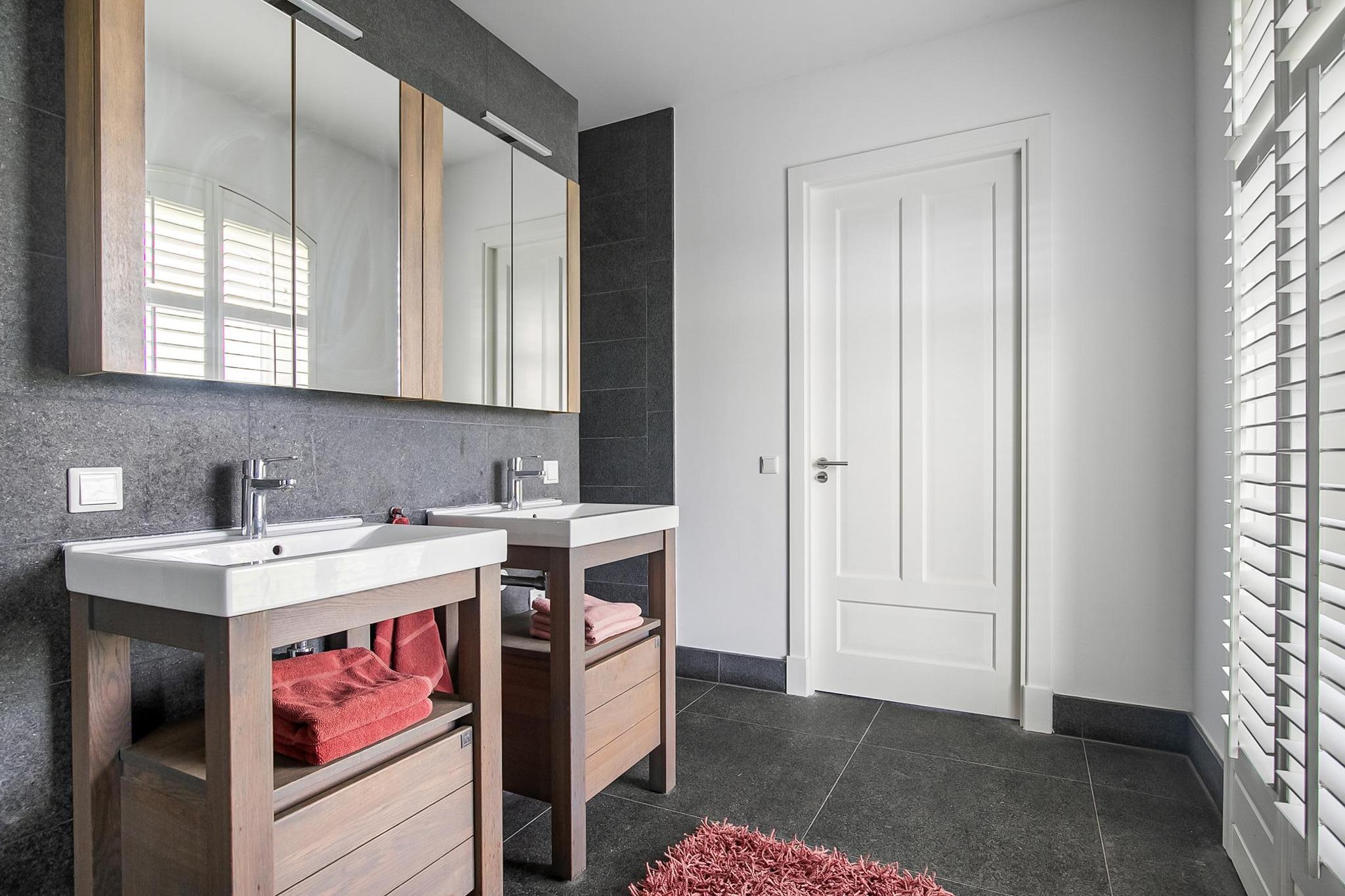 Vanuit de woonkamer is er toegang tot de logeerkamer. Deze slaapkamer is voorzien van een natuurstenen vloer, stucwerk wanden en een stucwerk plafond met inbouwverlichting. Vanuit deze kamer is er toegang tot de badkamer. Deze badkamer is afgewerkt met dezelfde natuurstenen vloer als in de rest van de ruimtes. De wanden en het plafond zijn voorzien van stucwerk. De badkamer is verder uitgerust met een ruime inloopdouche met sunshower, twee wastafels met meubel een zwevend toilet en een design radiator. Een raampartij zorgt voor natuurlijk lichtinval. Vanuit de badkamer loop je verder naar de masterbedroom.