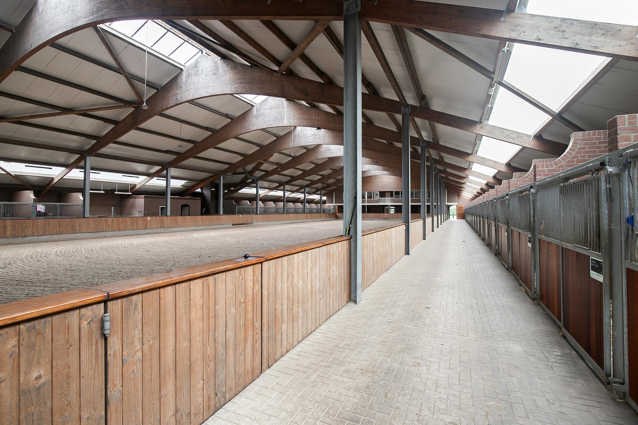 De hal aan de voorzijde van de rijhal is voorzien van een beklinkerde vloer en biedt toegang tot een berging, toiletruimtes, wasruimte en een winkelruimte. Een bordestrap biedt toegang tot de 1e verdieping. Hier is de ontvangstruimte en een appartement gesitueerd. De ontvangstruimte is voorzien van een tegelvloer, stucwerk wanden en een systeemplafond. Er is een keukenblok en een bar aanwezig. Openslaande deuren bieden toegang tot een balkon aan de voorzijde van de rijhal. Grote raampartijen bieden een fraai uitzicht op de binnenpiste en de stallen. Ook is er vanuit de ontvangstruimte toegang tot een balkon boven de binnenpiste.Het appartement is uitgerust met een woonkamer met open keuken, 2 slaapkamers en een ruime badkamer. Het appartement is voorzien van een tegelvloer. Het keukenblok beschikt over een spoelbak, inductiekookplaat, vaatwasser, koelkast en een combimagnetron. De badkamer is geheel betegeld en verder voorzien van een doucheruimte, wastafel met meubel en een zwevend toilet. Achter een praktische schuifwand is een wasruimte gesitueerd. De binnenpiste (ca. 21x61 mtr.) is voorzien van een professionele bodem (Ben Agterberg), een fraaie hardhouten bakrand. Gewelfde houten spanten zorgen voor extra sfeer. Een lichtstraat in de nok zorgt voor fraai natuurlijke lichtinval. Ook is er LED-verlichting aanwezig. De 39 paardenboxen zijn verdeeld over twee stallengangen. De boxen zijn voorzien van deels hardhouten / deels gegalvaniseerde voorwanden en metselwerk tussen- en achterwanden. De deuren van de boxen zijn draaibaar. De boxen zijn tevens uitgerust met een buitenluik. Iedere stallengang beschikt over eigen faciliteiten zoals wasplaatsen en een zadelkamer. Tussen de gangen zijn nog drie ruime loopstallen gesitueerd. De wasplaatsen zijn voorzien van een warm- en koud watervoorziening. Ook is er een plaats voor de hoefsmid en fysio aanwezig. Aan de achterzijde is nog een appartement gesitueerd. Middels een bordestrap aan de buitenzijde is er toegang. Hier is tevens een balkon gesitueerd. Het appartement beschikt over een ruime woonkamer met open keuken, 3 slaapkamers, een ruime badkamer, een bijkeuken, wasruimte en een toiletruimte.Aan de achterzijde van het perceel is een vrijstaande veldschuur gesitueerd. De schuur is opgetrokken uit metselwerk plinten met damwand gevels en het geisoleerde dak is met sandwichpanelen gedekt. Aan de voorzijde is de veldschuur voorzien van windbreekgaas. In de schuur is een voersilo aanwezig. Er zijn momenteel 14 paardenboxen en een longeercirkel gesitueerd, maar uiteraard is deze schuur geheel naar wens ook uitermate geschikt voor diverse andere doeleinden.