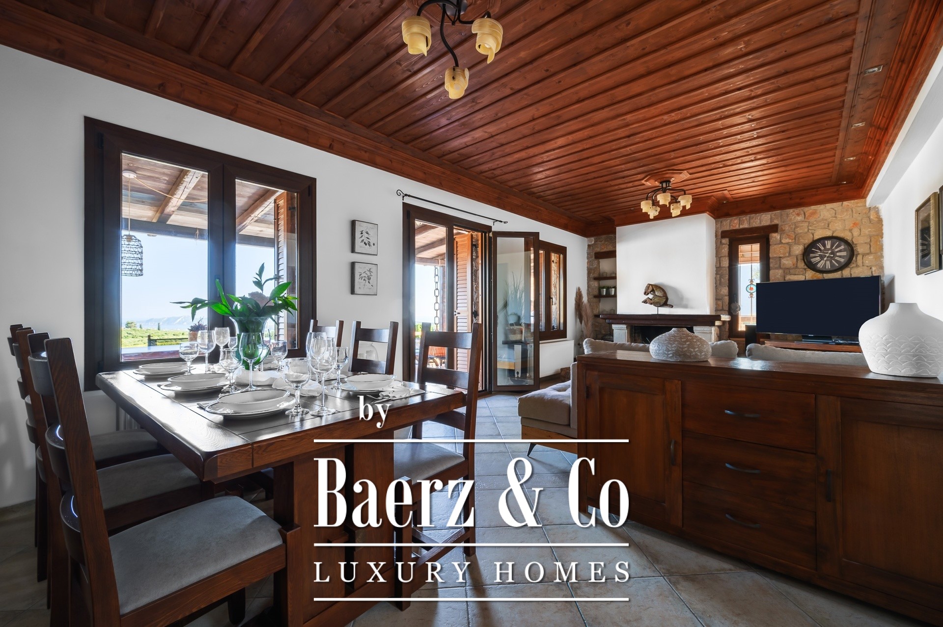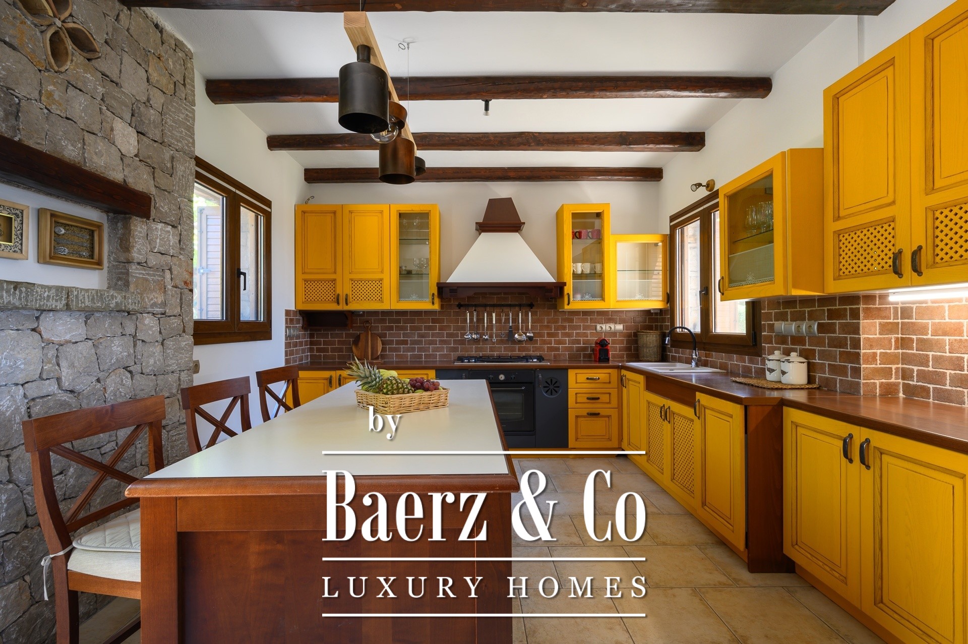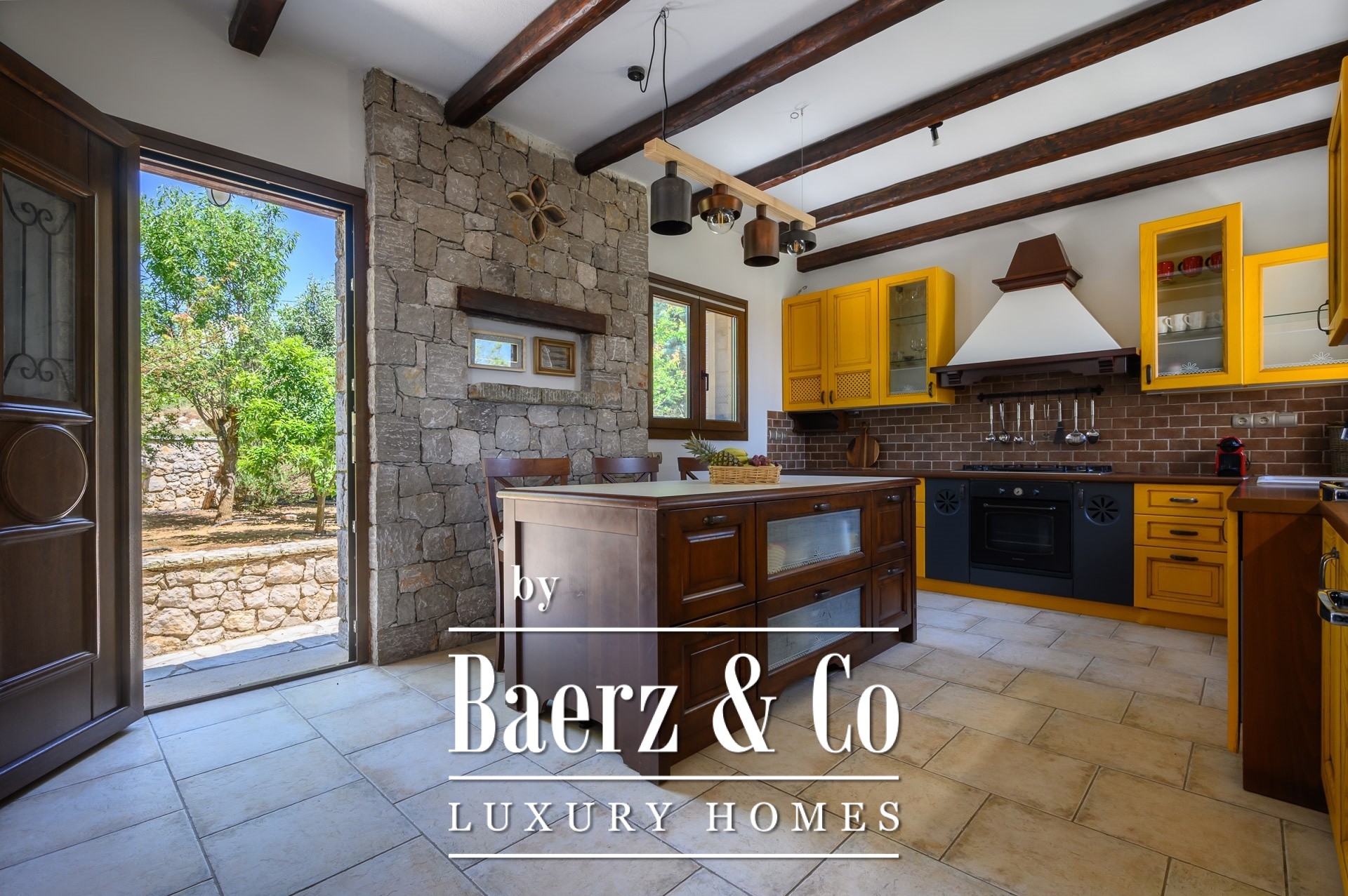 Iroko houten trappen, eiken vloeren en houten luiken met dubbel glas bepalen de tastbare beleving. Buiten nodigen een aangelegde tuin, automatische irrigatie en een overdekte BBQ-ruimte met houtoven uit tot intieme bijeenkomsten. Airconditioning, oliegestookte verwarming en een volledige inrichting verhogen het dagelijkse comfort. Deze locatie, dichtbij golfbanen en archeologische vindplaatsen, biedt zowel rust als verbondenheid met het beste van Zuid-Griekenland.