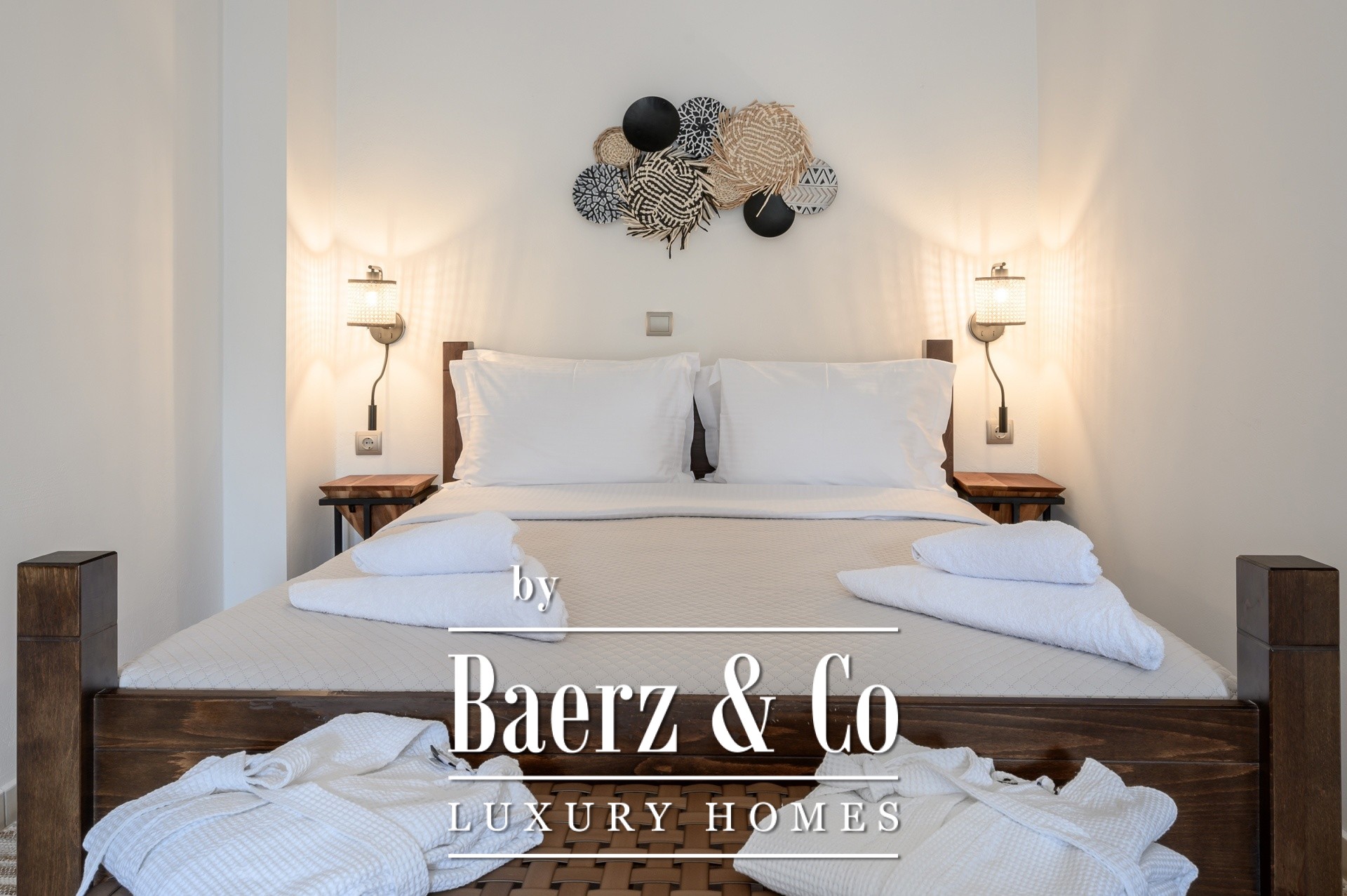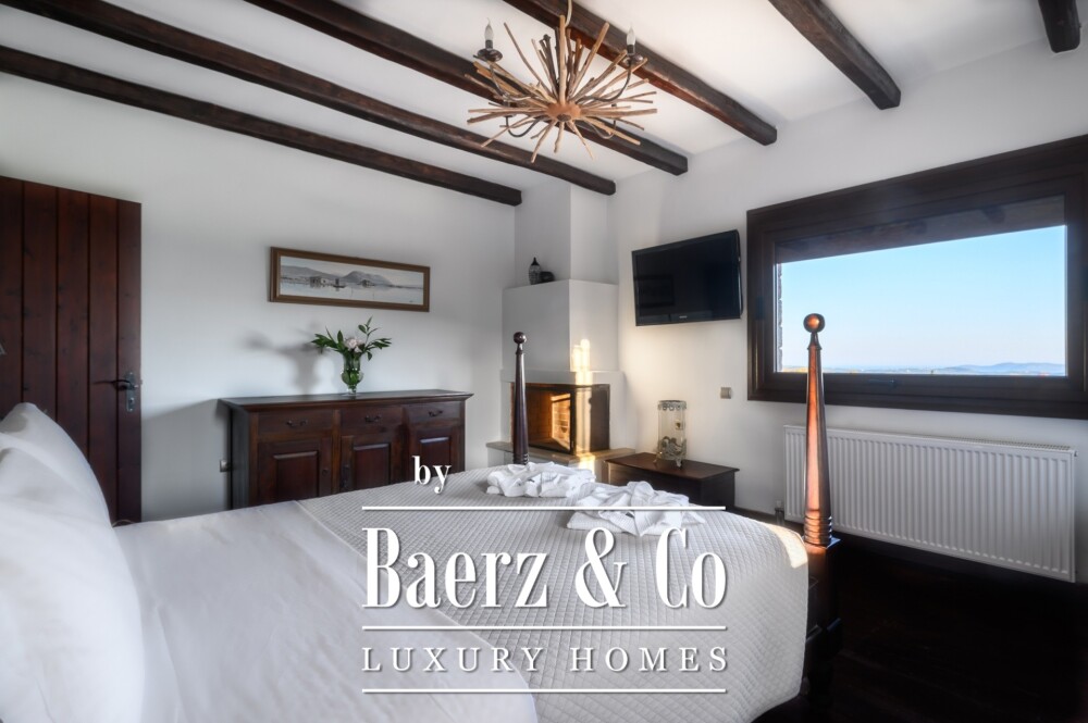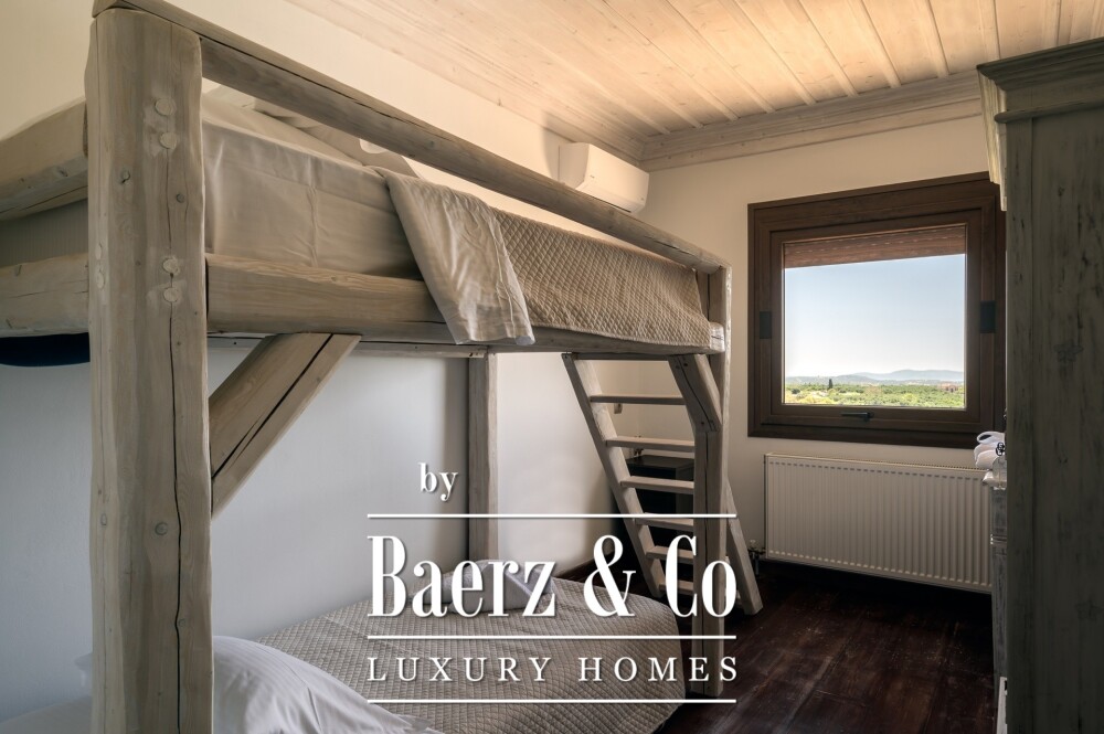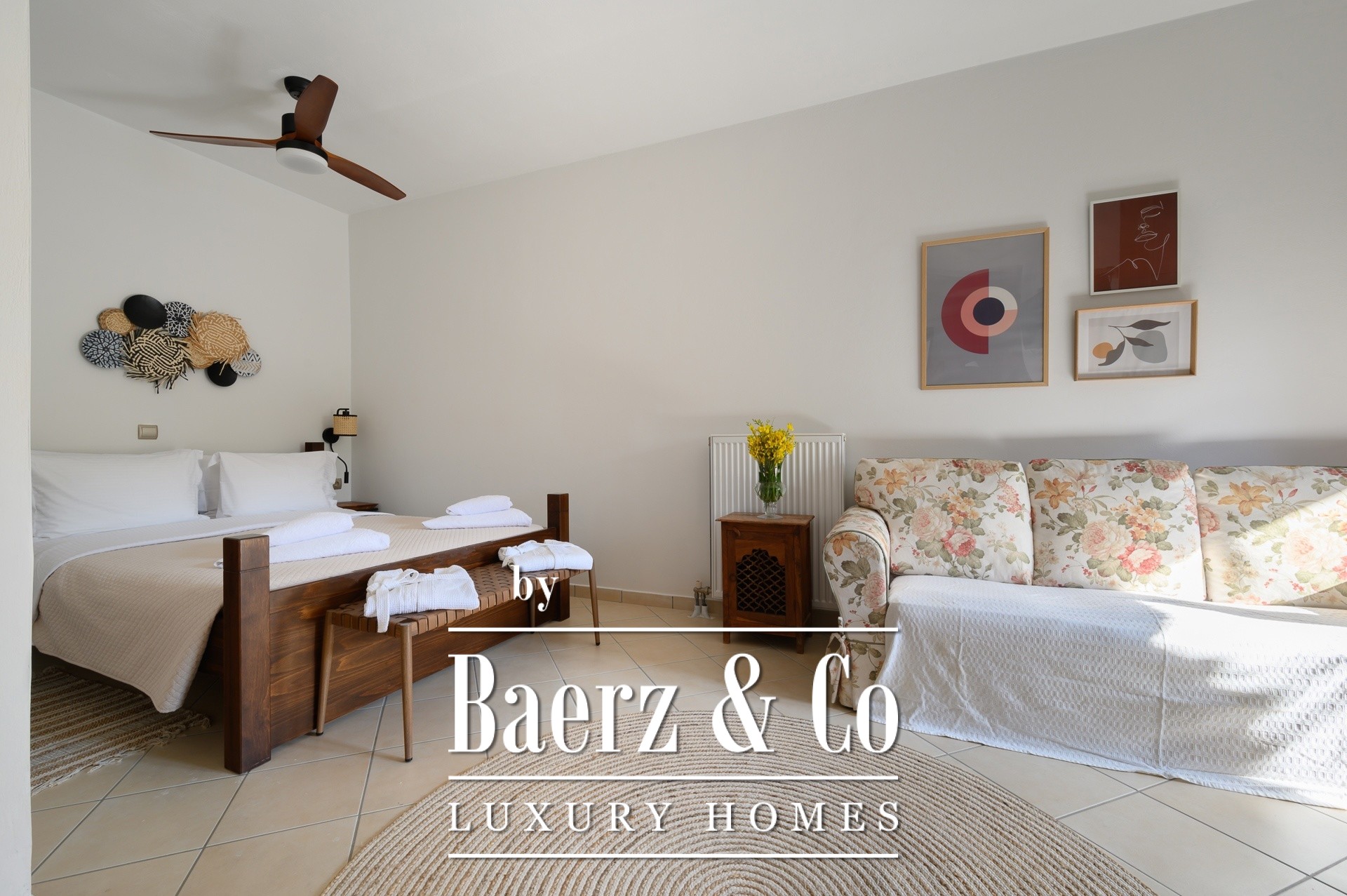 Iroko houten trappen, eiken vloeren en houten luiken met dubbel glas bepalen de tastbare beleving. Buiten nodigen een aangelegde tuin, automatische irrigatie en een overdekte BBQ-ruimte met houtoven uit tot intieme bijeenkomsten. Airconditioning, oliegestookte verwarming en een volledige inrichting verhogen het dagelijkse comfort. Deze locatie, dichtbij golfbanen en archeologische vindplaatsen, biedt zowel rust als verbondenheid met het beste van Zuid-Griekenland.