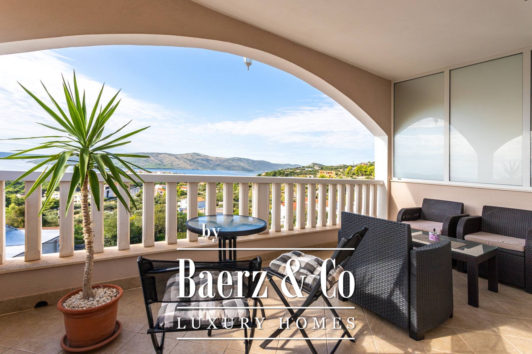 Townhouse Seget ligt op een verhoogde positie boven de Dalmatische kustlijn en biedt vanaf het perceel van 1.948 m² een weids uitzicht over de centrale eilanden. De woning beschikt over 888 m² woonoppervlak, verdeeld over vier doordacht ingedeelde woonlagen, toegankelijk via afzonderlijke entrees die privacy en functionaliteit combineren. De begane grond leidt naar twee onderscheidende appartementen: één met drie slaapkamers en één met een slaapkamer, beide voorzien van lichte interieurs en op zee georiënteerde balkons. Op de tweede verdieping bevinden zich zeven appartementen, waarvan er vier actief worden verhuurd aan gasten, wat het gevestigde zakelijke karakter van het huis onderstreept. Elk appartement heeft een eigen buitenbalkon met een onbelemmerd uitzicht op zee dat het dagelijks leven hier ritme geeft.