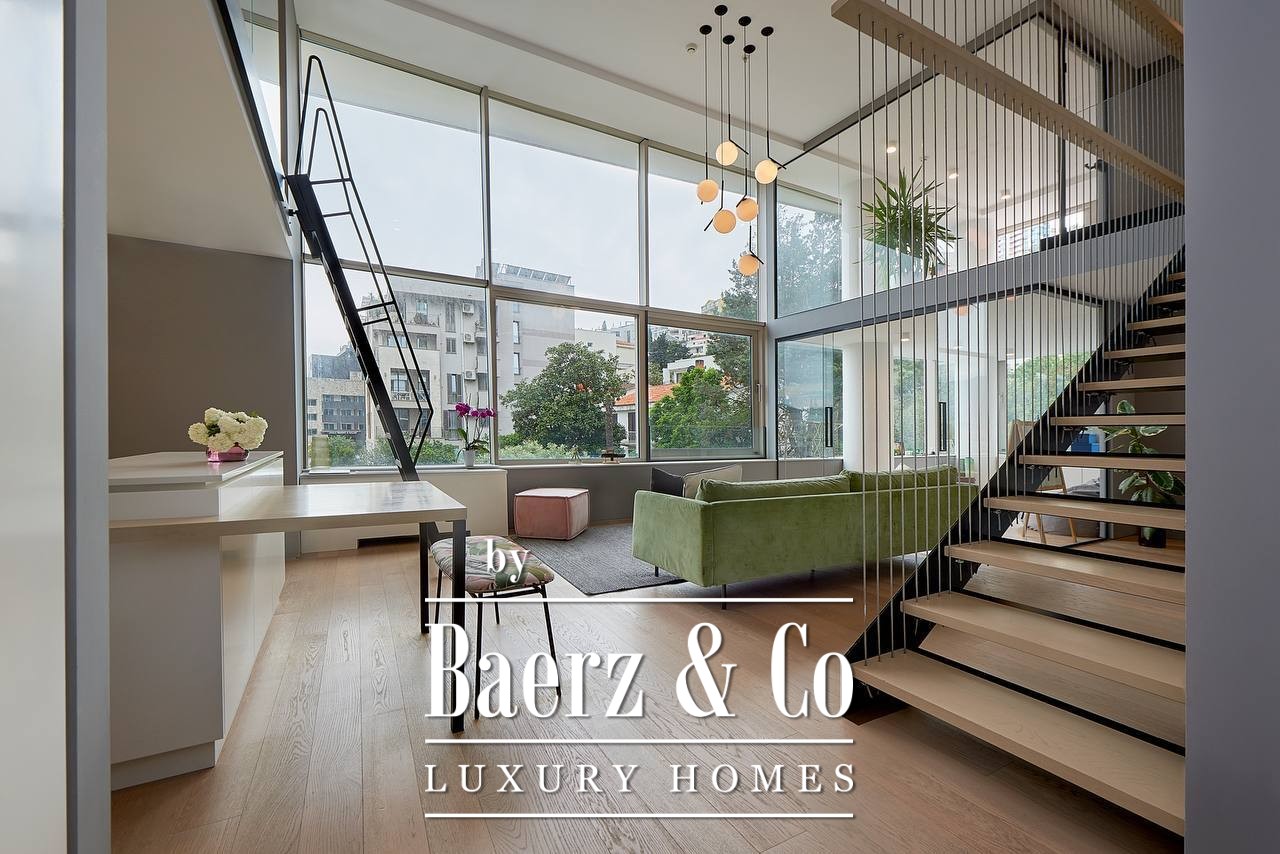 Планировка 90 м² дополнена галереей площадью 10 м² и включает две спальни, две ванные комнаты с подогревом пола, гостиную, объединённую с кухней и столовой зоной, отдельную библиотеку и террасу для спокойного отдыха или беседы. Дизайнерская отделка заметна в каждой детали: раздвижные окна с двойным остеклением, сплит-система обогрева и охлаждения, а также полный комплект изысканной мебели и бытовой техники.